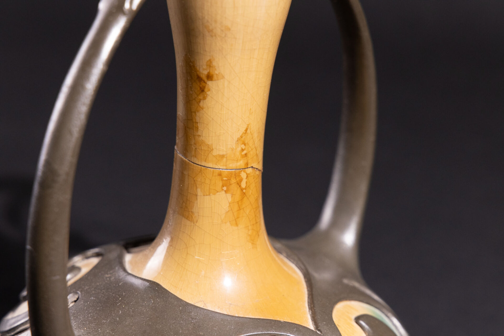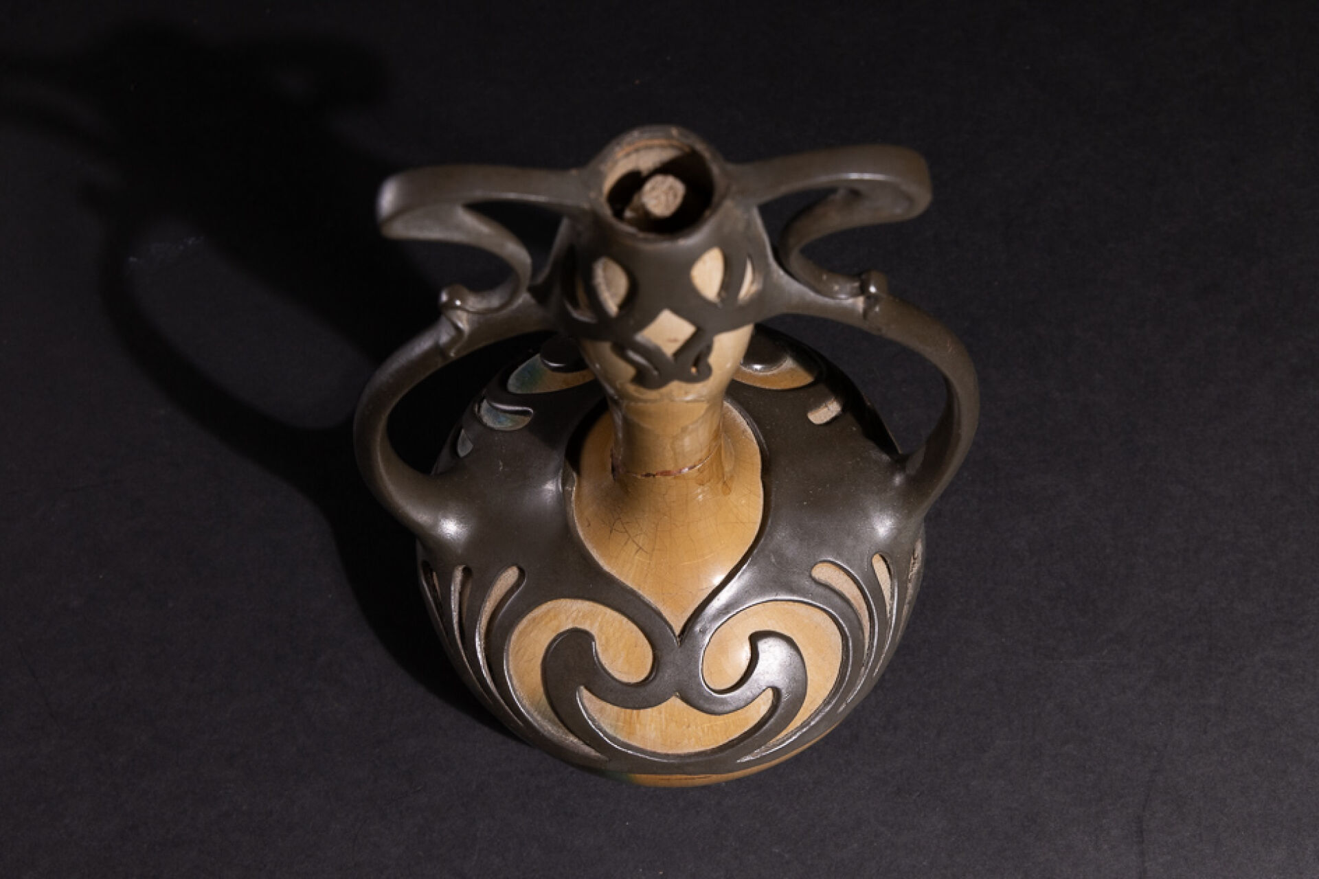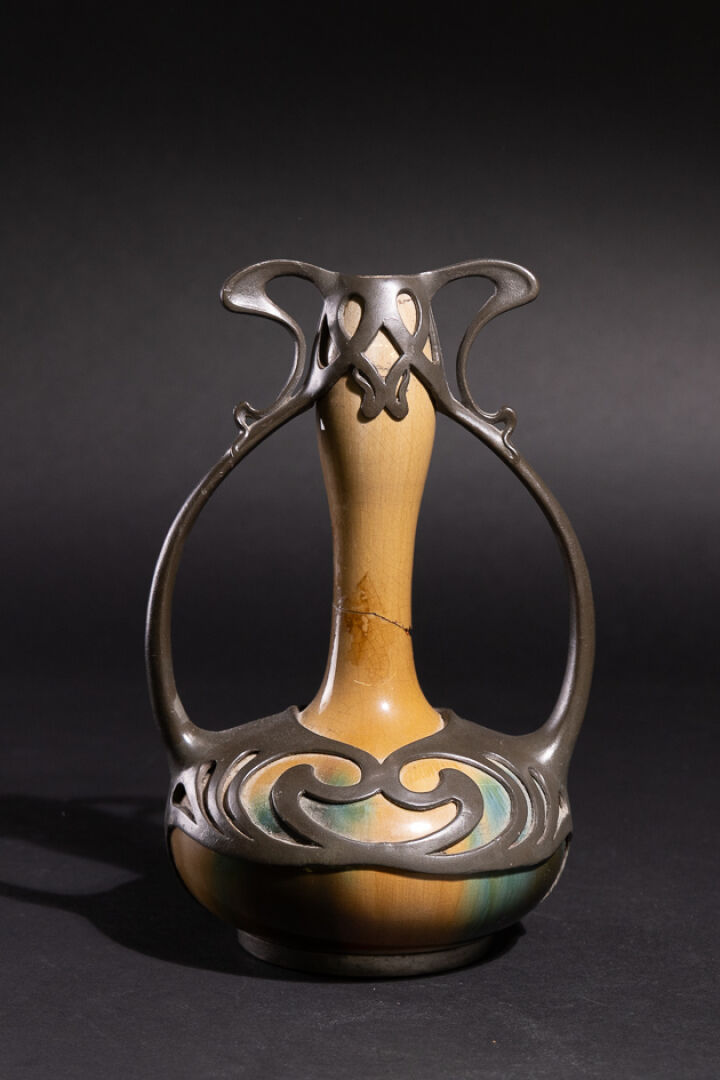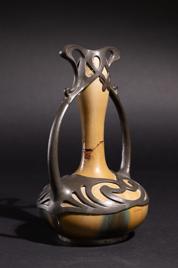 Dans le goût d'Eugène BAUDIN. Vase en grès craquelé dans les tons vert, brun et jaune, à haut col boursouflé et panse aplatie enchâssé dans une monture en volutes en étain (vase cassé restauré, manques et restaurations). Vers 1900. Haut. : 25 cm