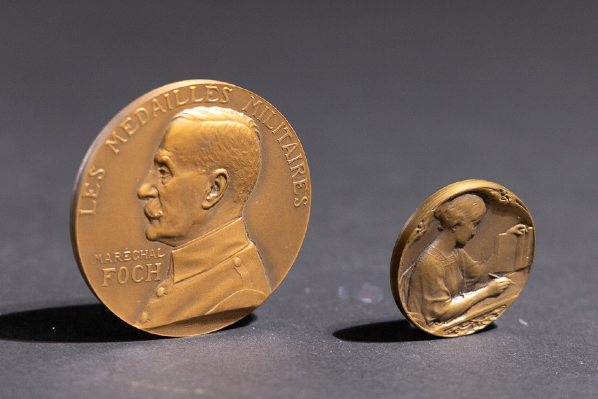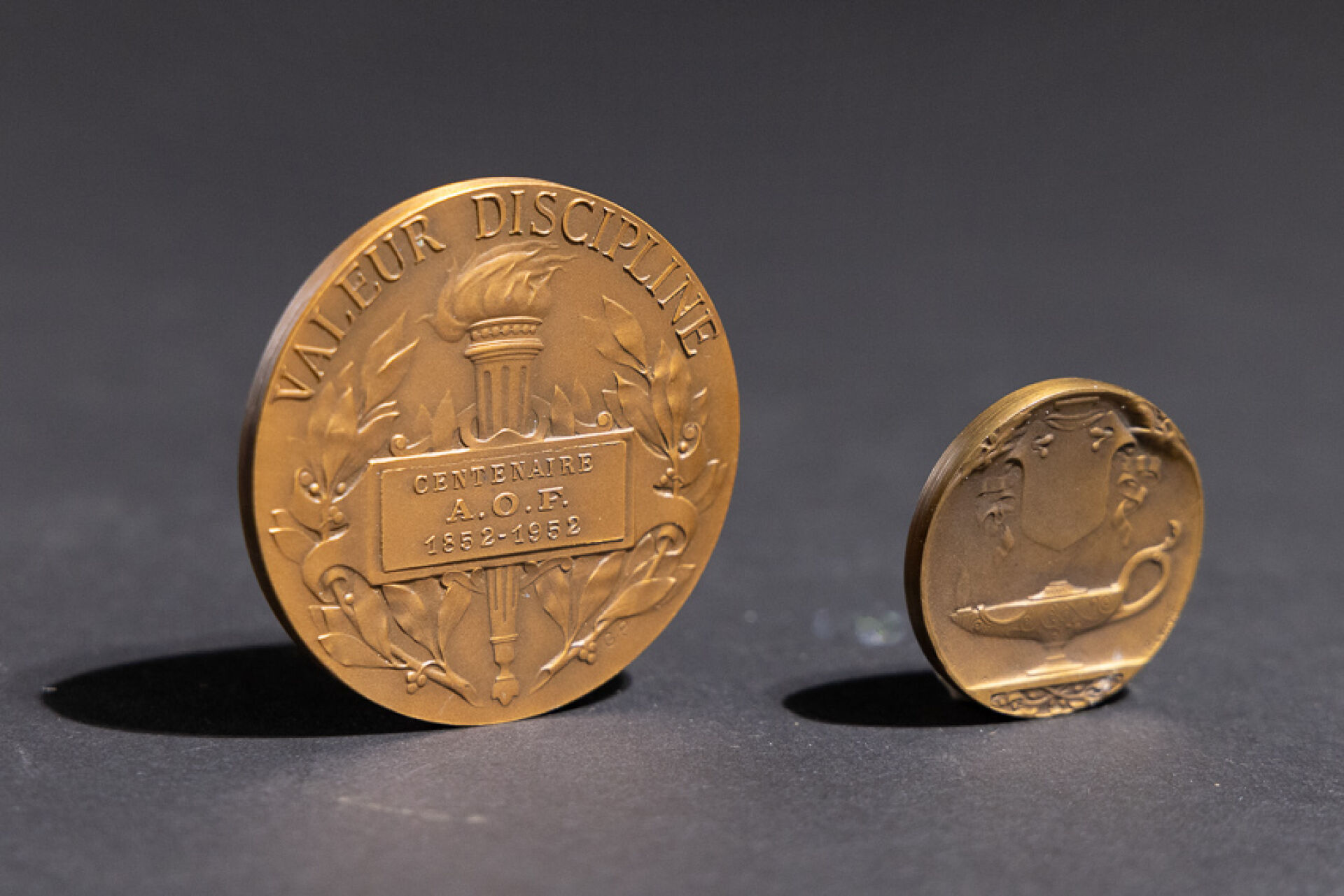 D'après Pierre-Charles LENOIR (XIXe-XXe siècles). Médaille en bronze à la femme à l'écriture, une lampe au revers. Vers 1900. Diam. : 3 cm Médaille en bronze Maréchal FOCH centenaire AOF. Diam. : 5 cm