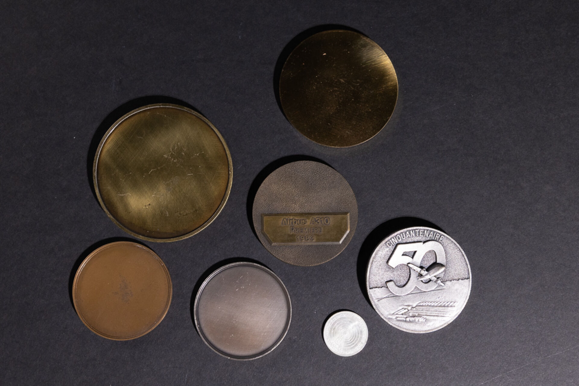 Ensemble de six médailles relatives à l'aérospatiale en bronze dont cinquantenaire NCAO aérospatiale Nantes ; Médailles Airbus A310 première 1983