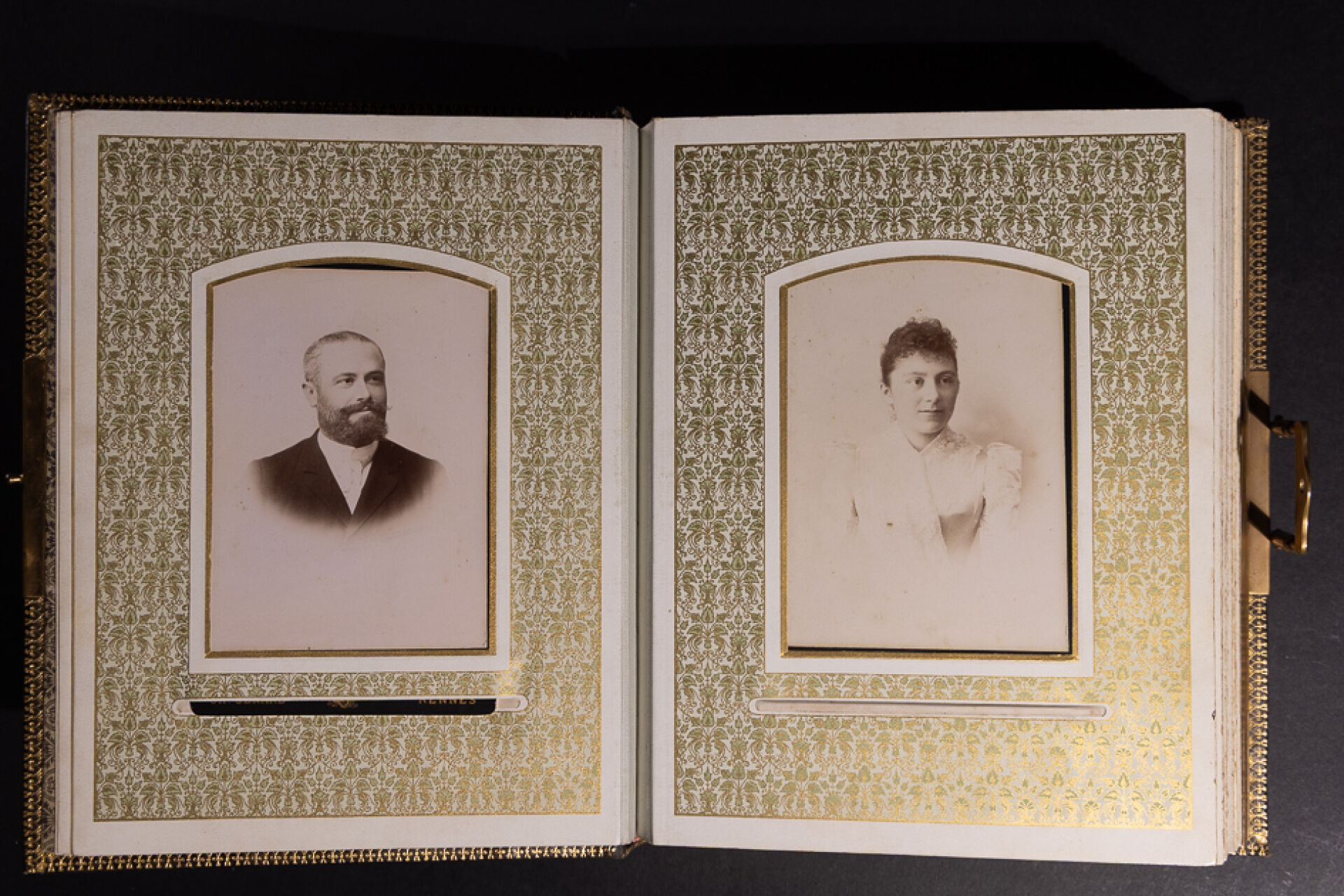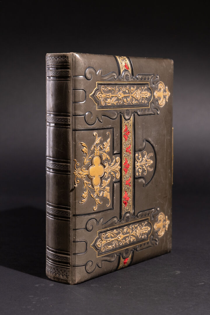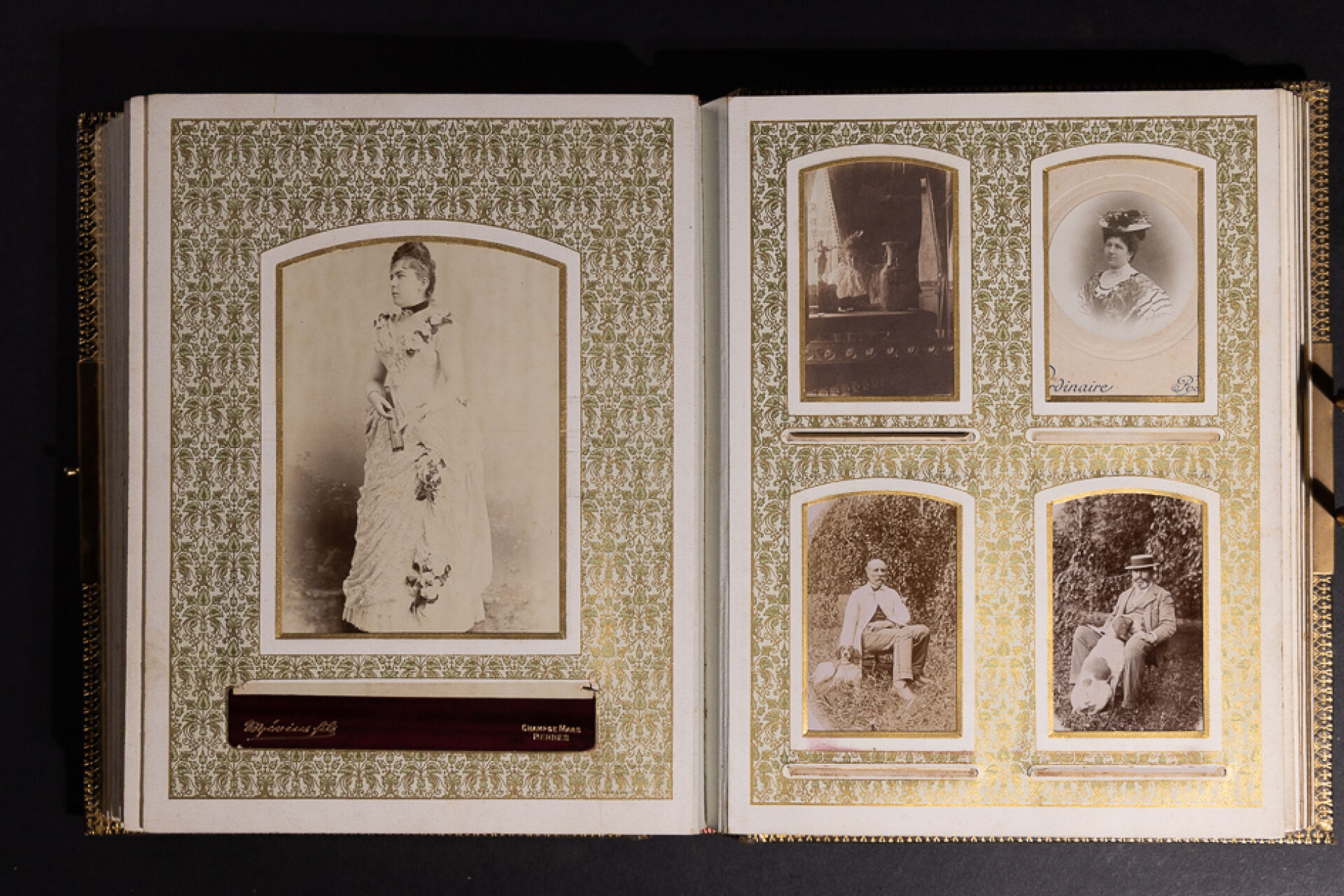 Album de photographies à pages cartonnées, la reliure en cuir vert à décor enluminé de volutes, fermoir en métal doré, comprenant diverses photos et portraits. Vers 1900. Haut. : 27.5 cm - Larg. : 21 cm