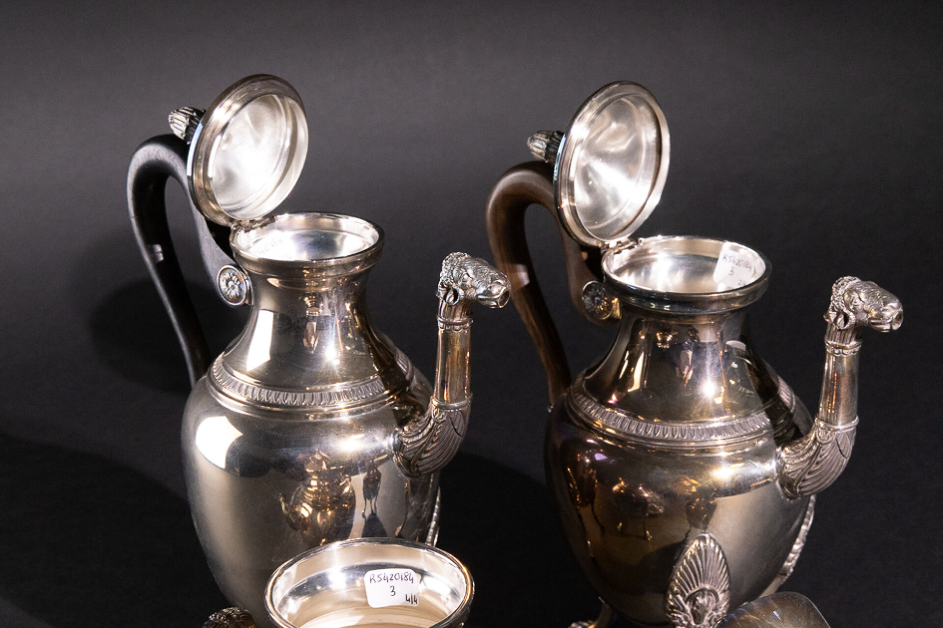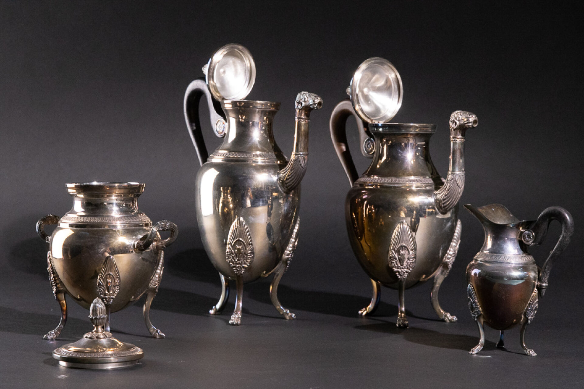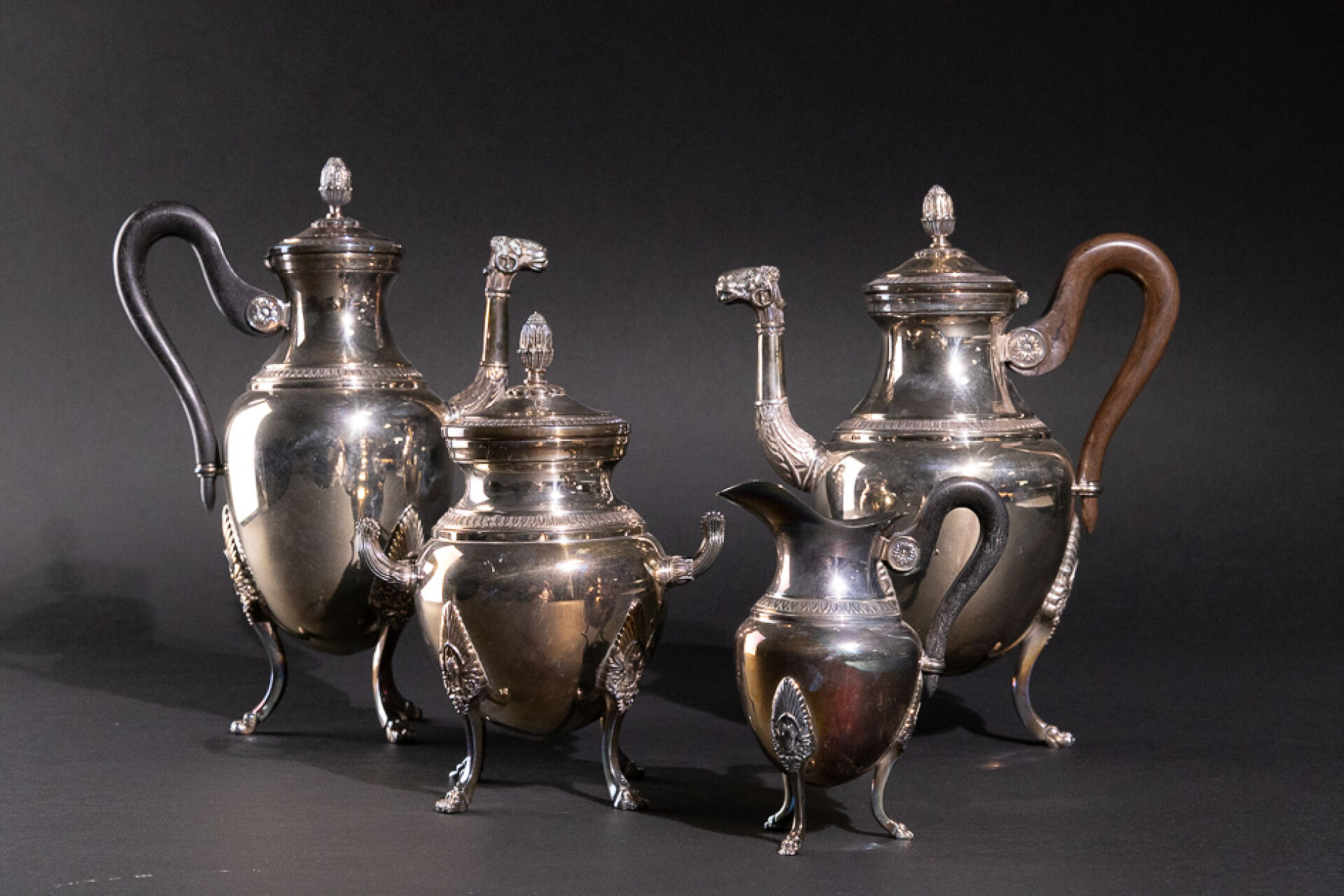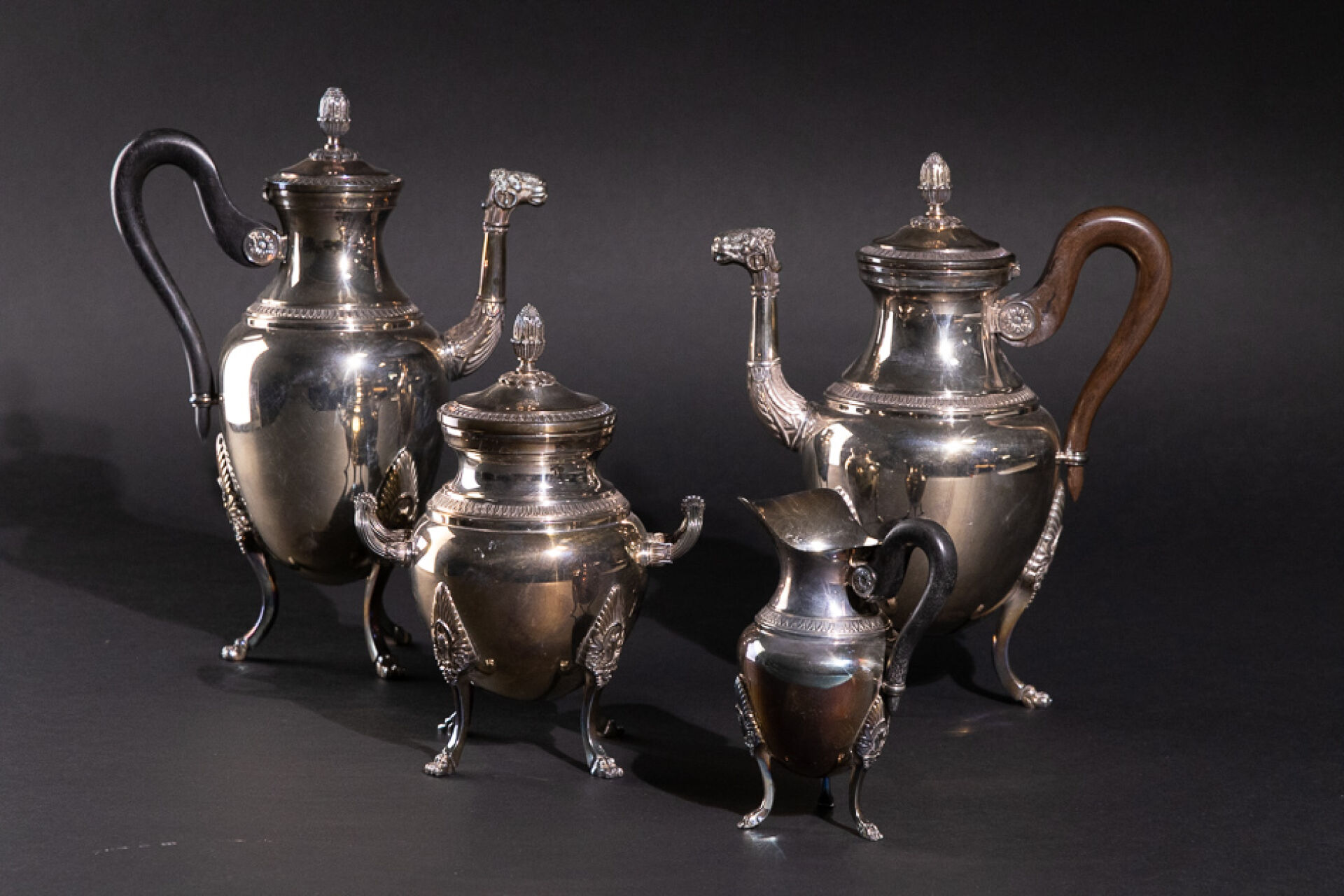Maison CHRISTOFLE. Partie de service modèle MALMAISON à café et à thé en métal argenté à anse en bois et bec verseur au bélier comprenant : - Cafetière. Haut. : 30 cm ; - Théière. Haut. : 29 cm ; - Pot à lait. Haut. : 14 cm ; - Sucrier. Haut. : 23 cm