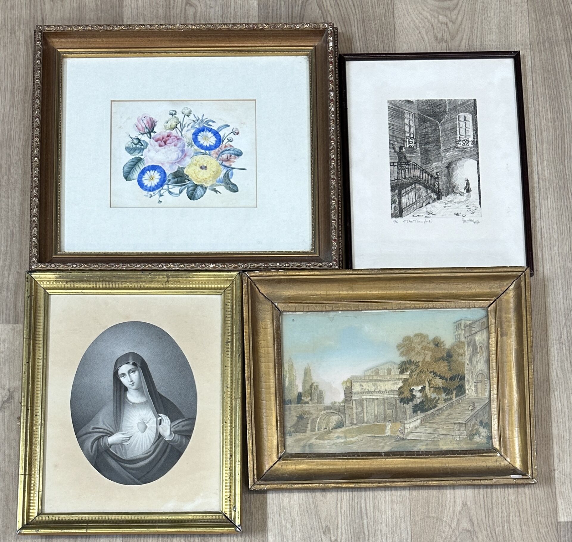 Ecole du XIXe siècle. Bouquet de fleurs sauvage. Aquarelle Ecole du XIXe siècle. Paysage architecturé. Broderie. On joint : Deux gravures en noir encadrées dont : Sainte-Marguerite à La Coque Vue d'une cage d'escalier.