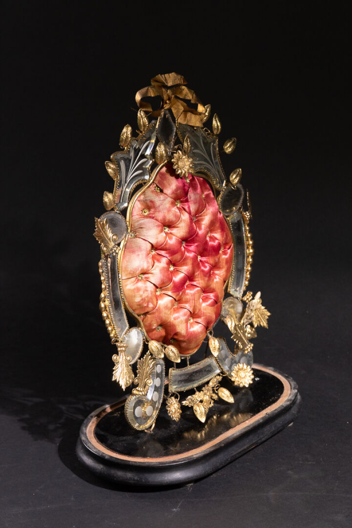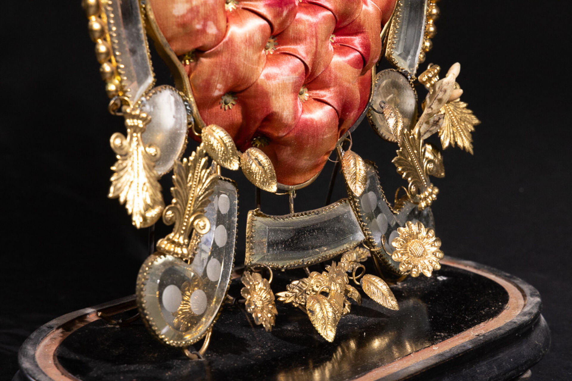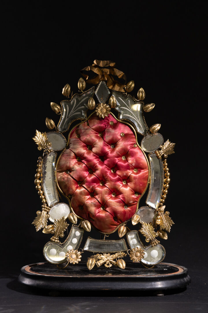 Globe dit de marié comprenant un présentoir en métal doré orné de miroirs gravé dans une monture en métal doré fleuri et présentant en son centre un cousin capitonné rouge (usures). Vers 1900. Haut. : 50 cm - Larg. : 35 cm