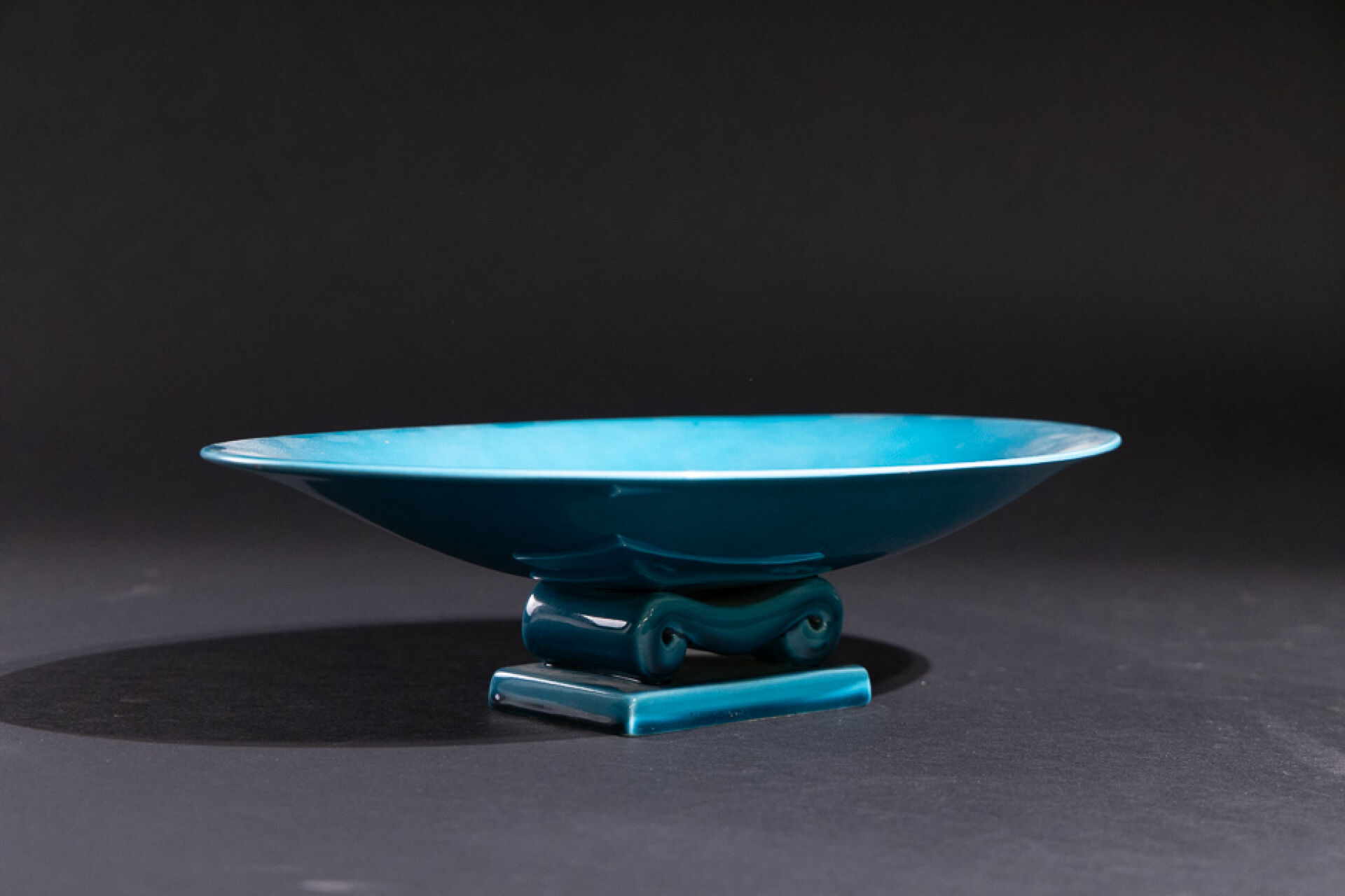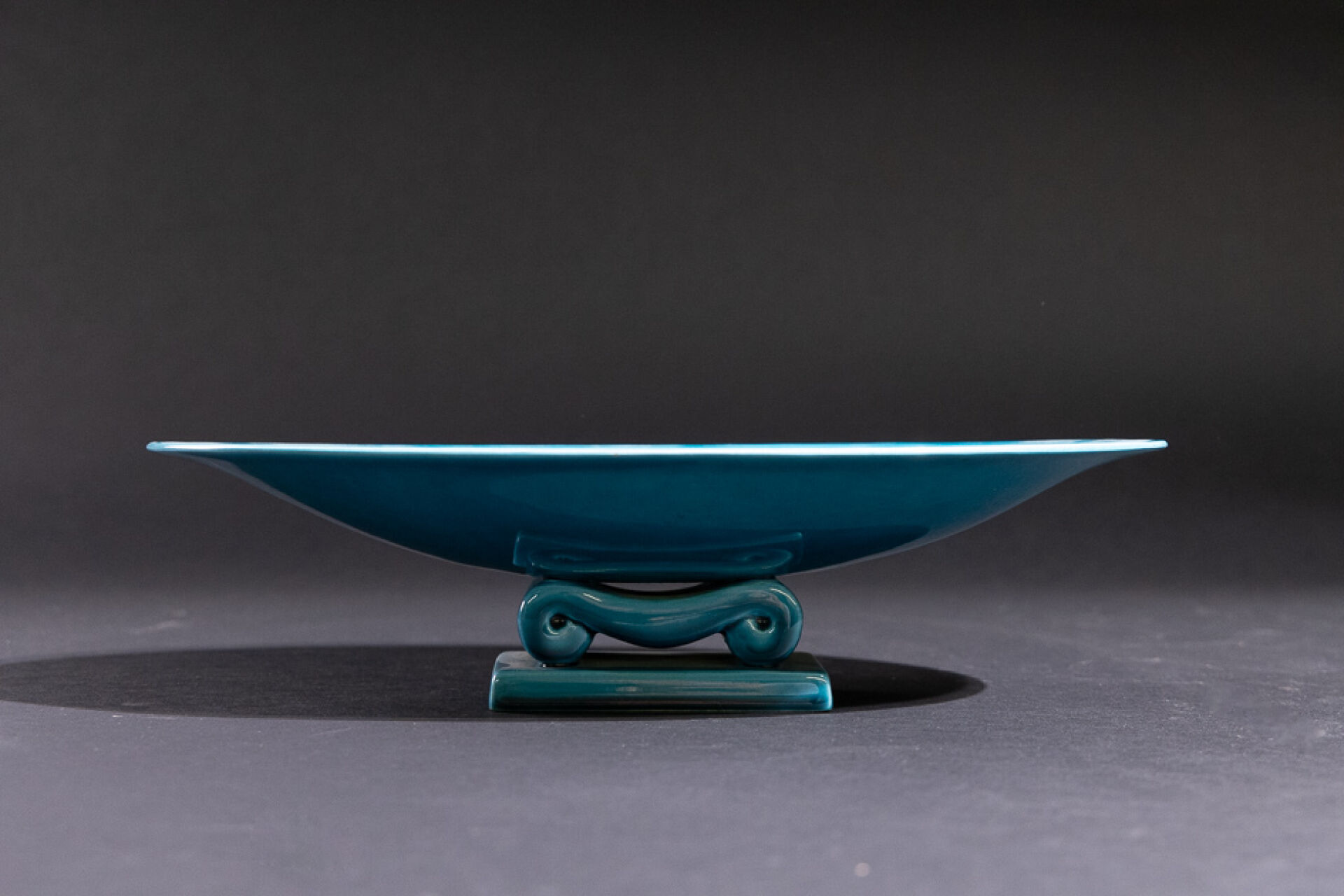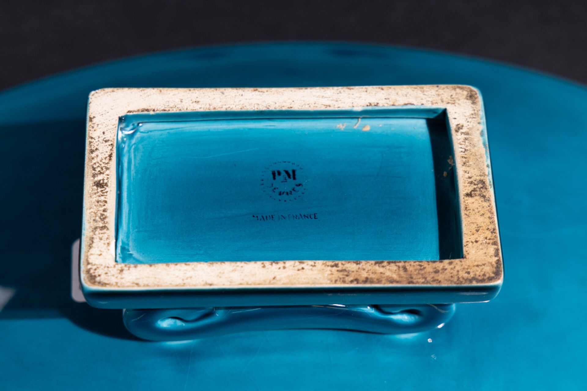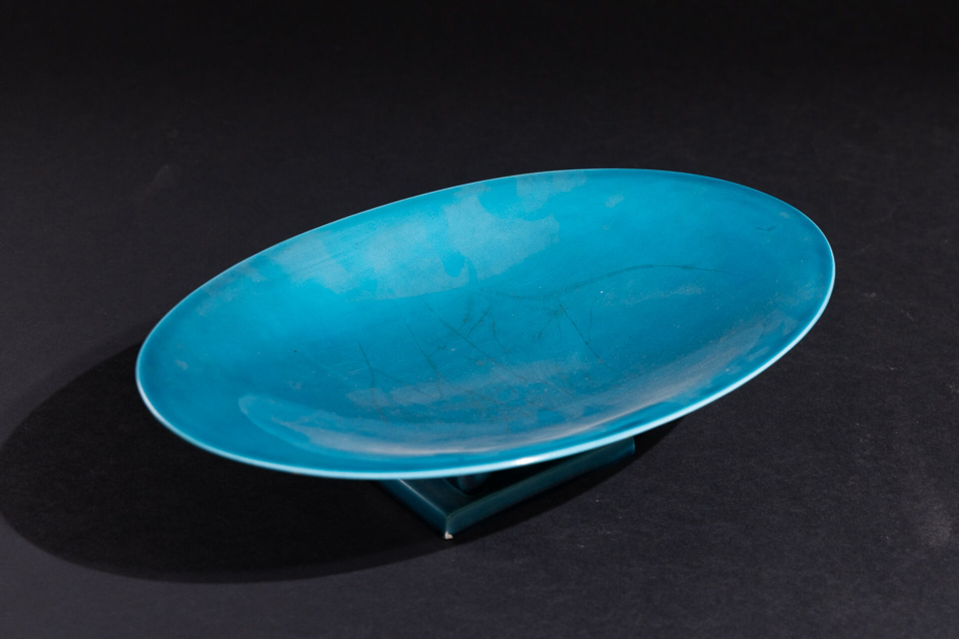 Paul MILET (1870-1950) à Sèvres. Coupe oblongue turquoise marquée au revers (éclats). Long. : 35 cm - Larg. : 22 cm - Haut. : 9 cm