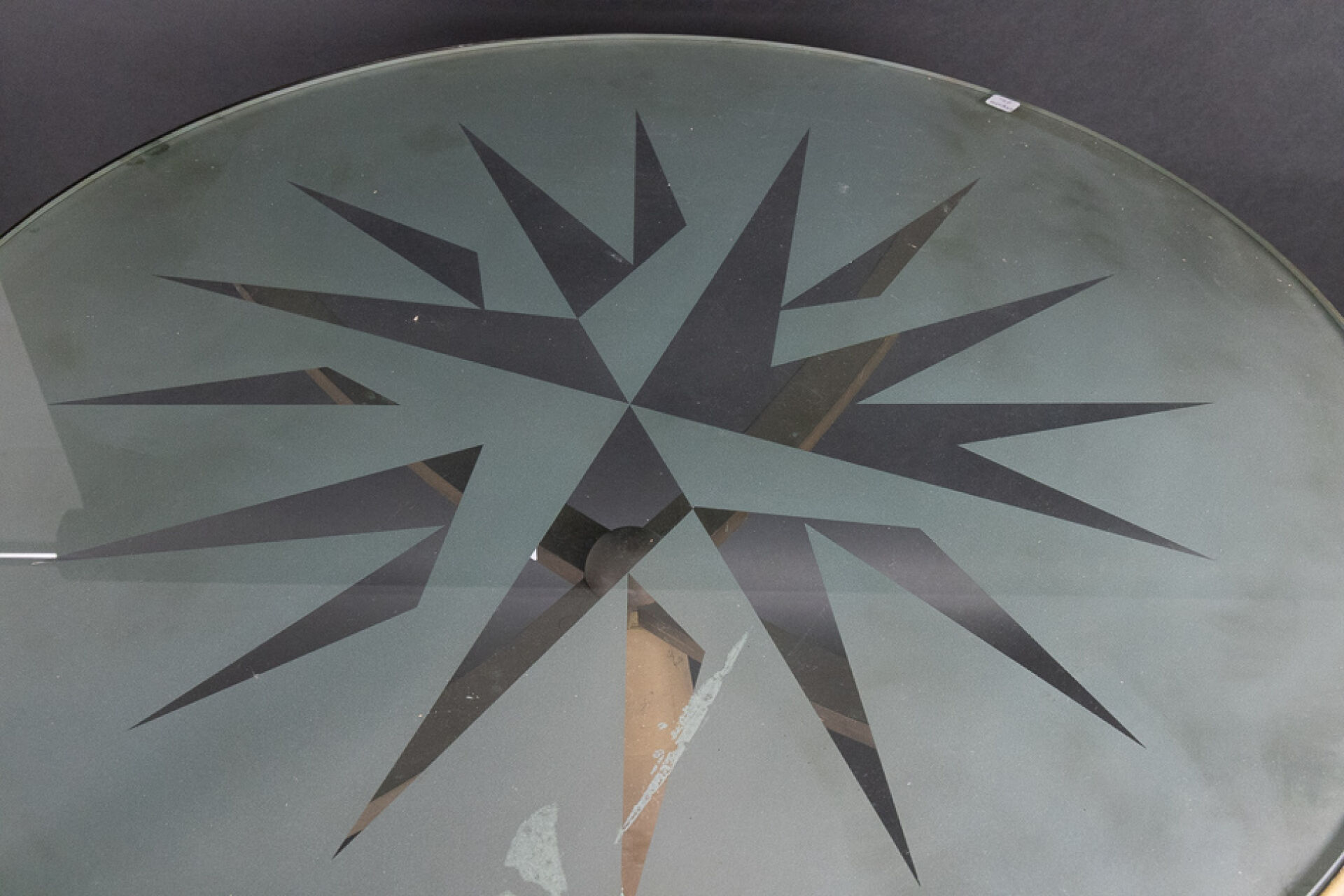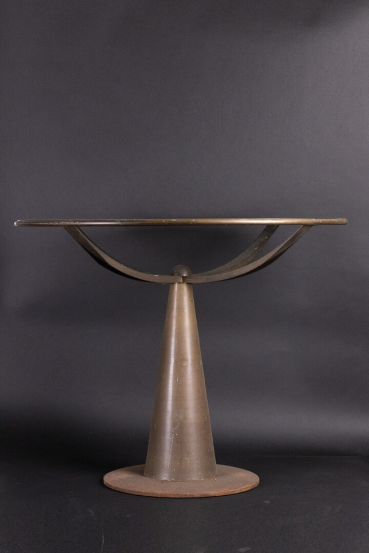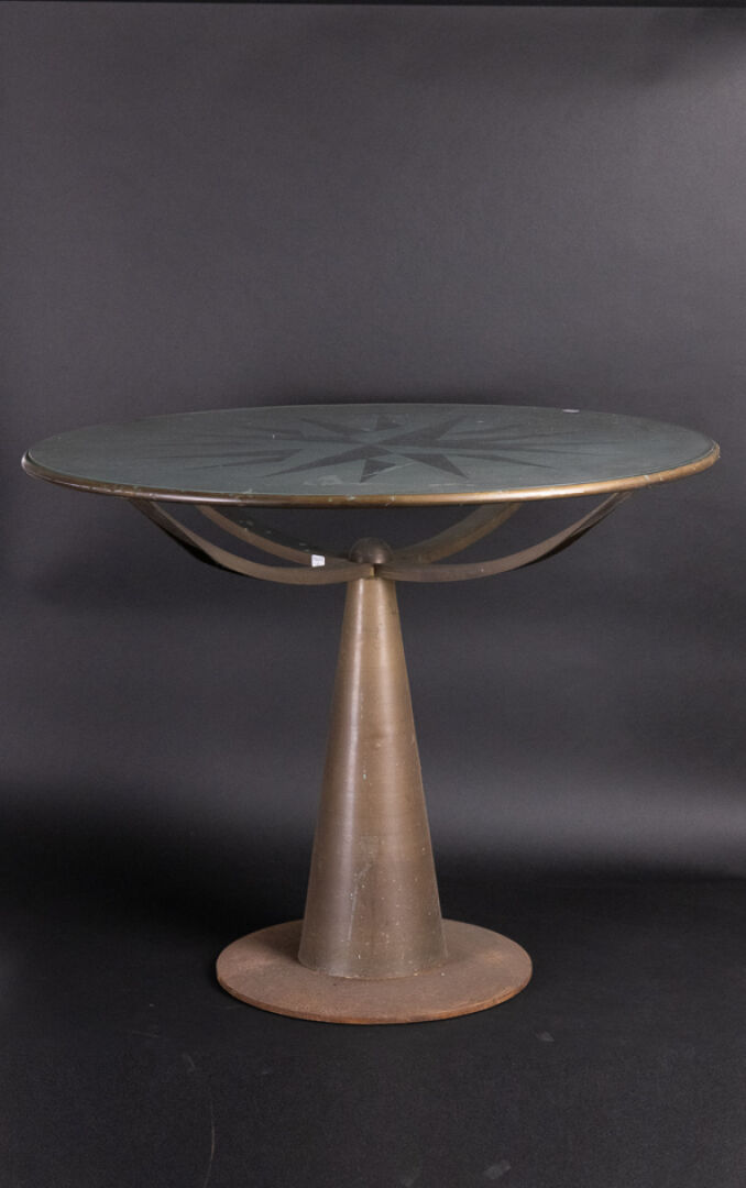 Oscar TUSQUESTS (né en 1941) pour les éditions ALEPH DRIADE Guéridon modèle "Astrolabio" soutenu par quatre bras elliptiques, à plateau en verre sablé à motif de rose des vents, piétement circulaire en métal patiné (oxydations). Haut. : 72 cm - Larg. : 90 cm