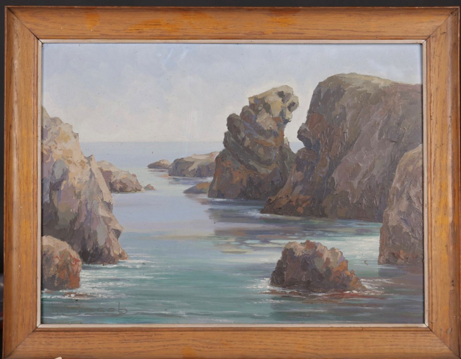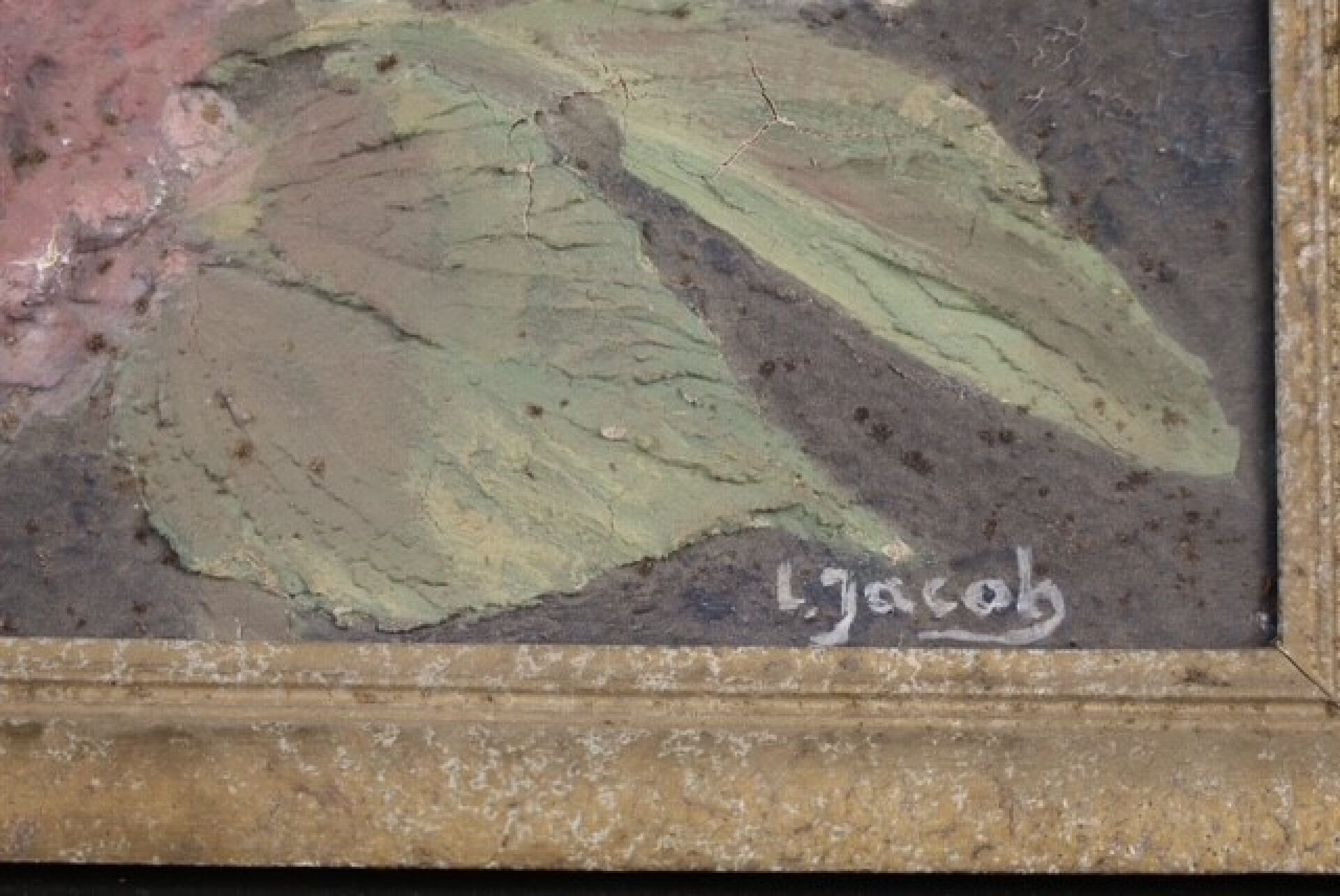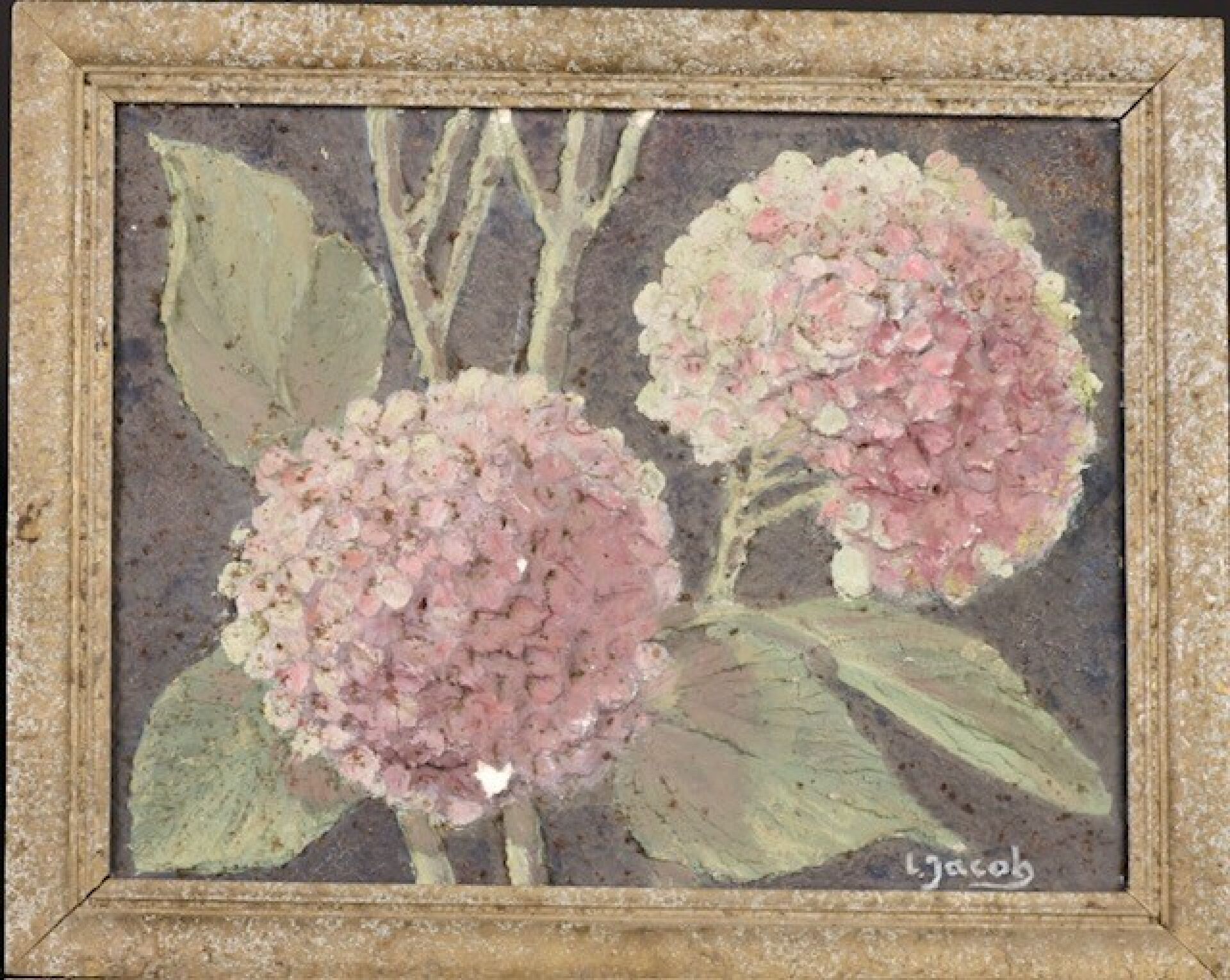 Louis JACOB (1876-1972). La grande côte au Pouliguen. Huile signée en bas à gauche, située au revers. Haut. : 39 cm - Larg. : 53 cm On joint : Louis JACOB (1876-1972). Hortensias. Composition mixte sur panneau signée en bas à droite. Haut. : 24 cm - Larg. : 31 cm
