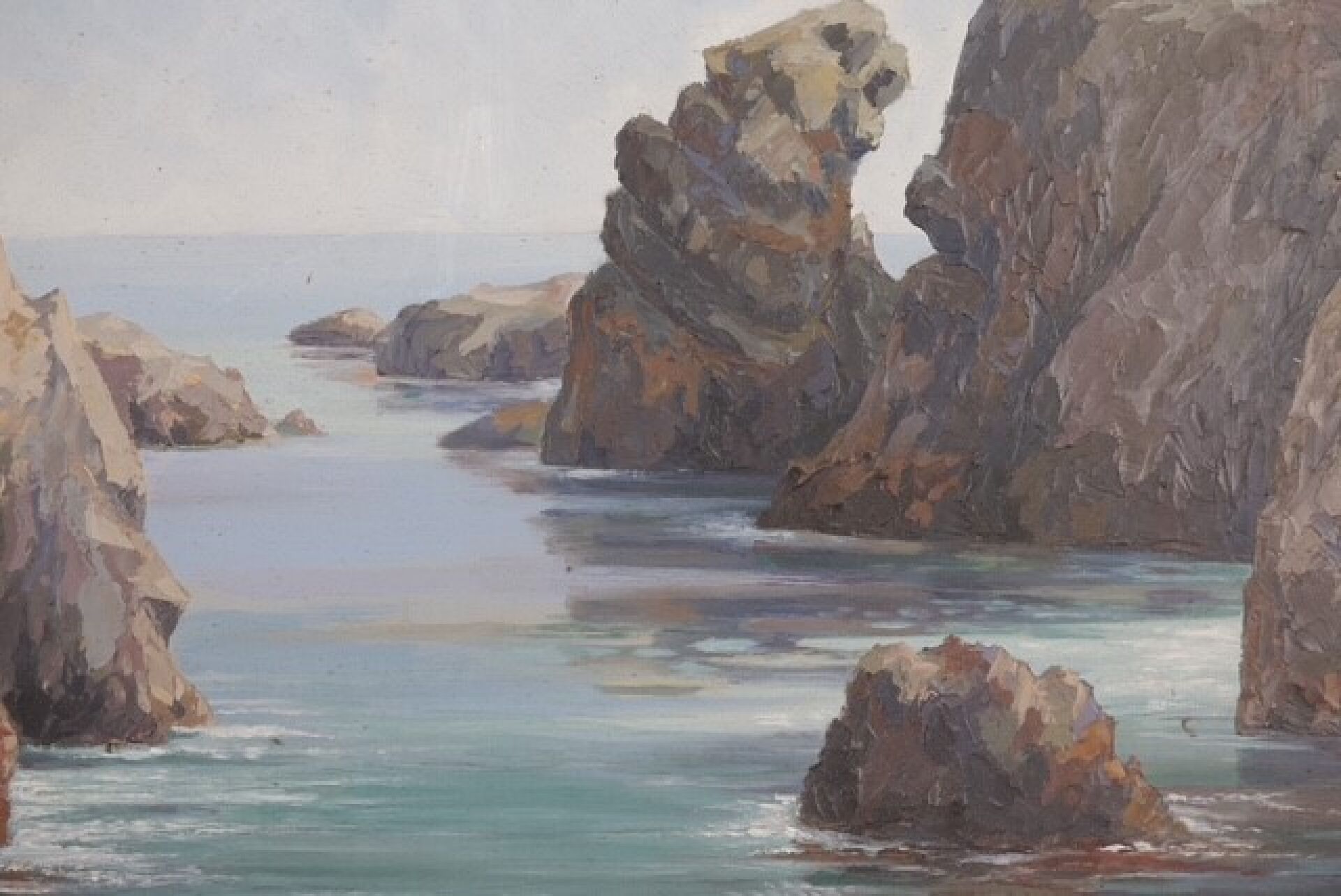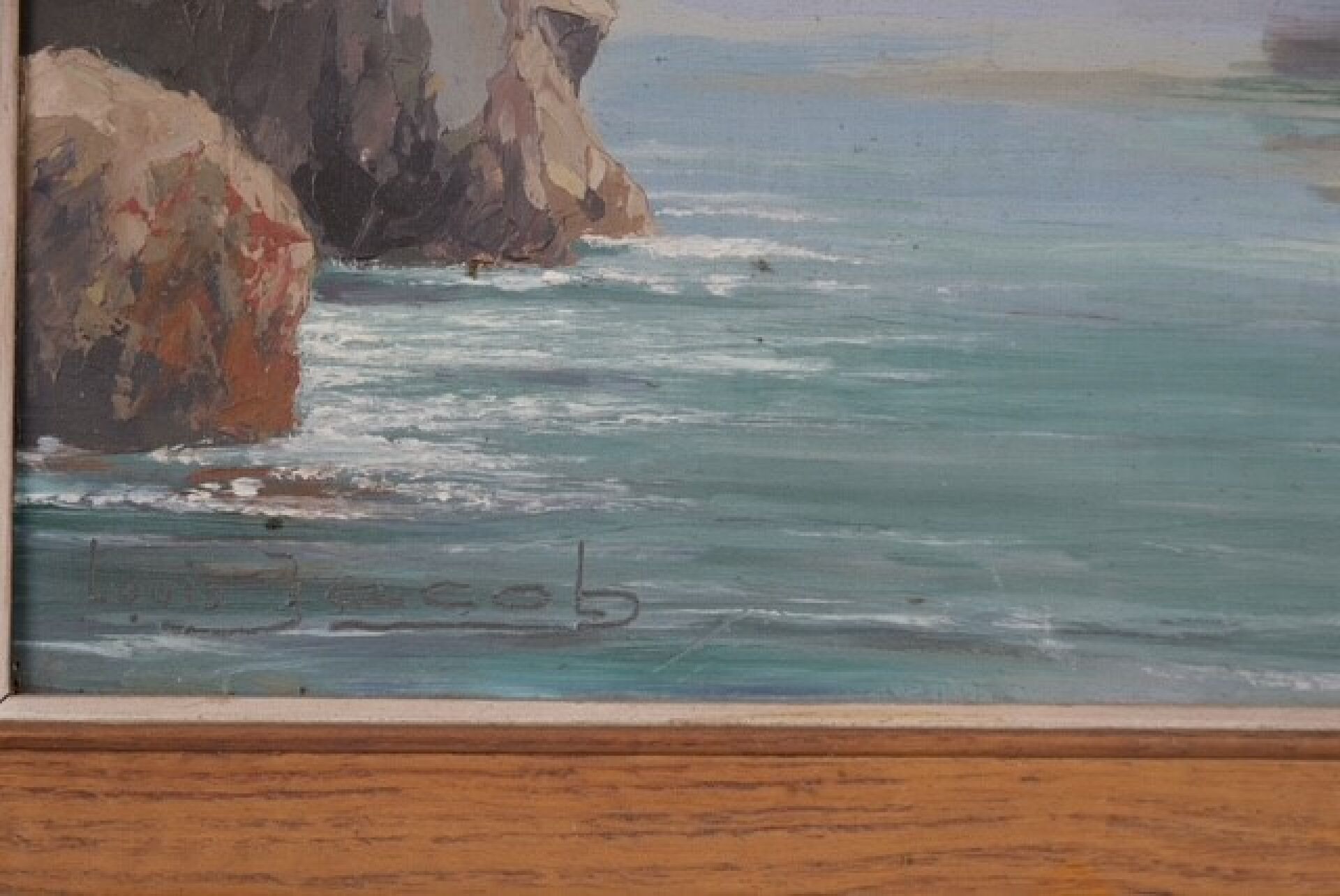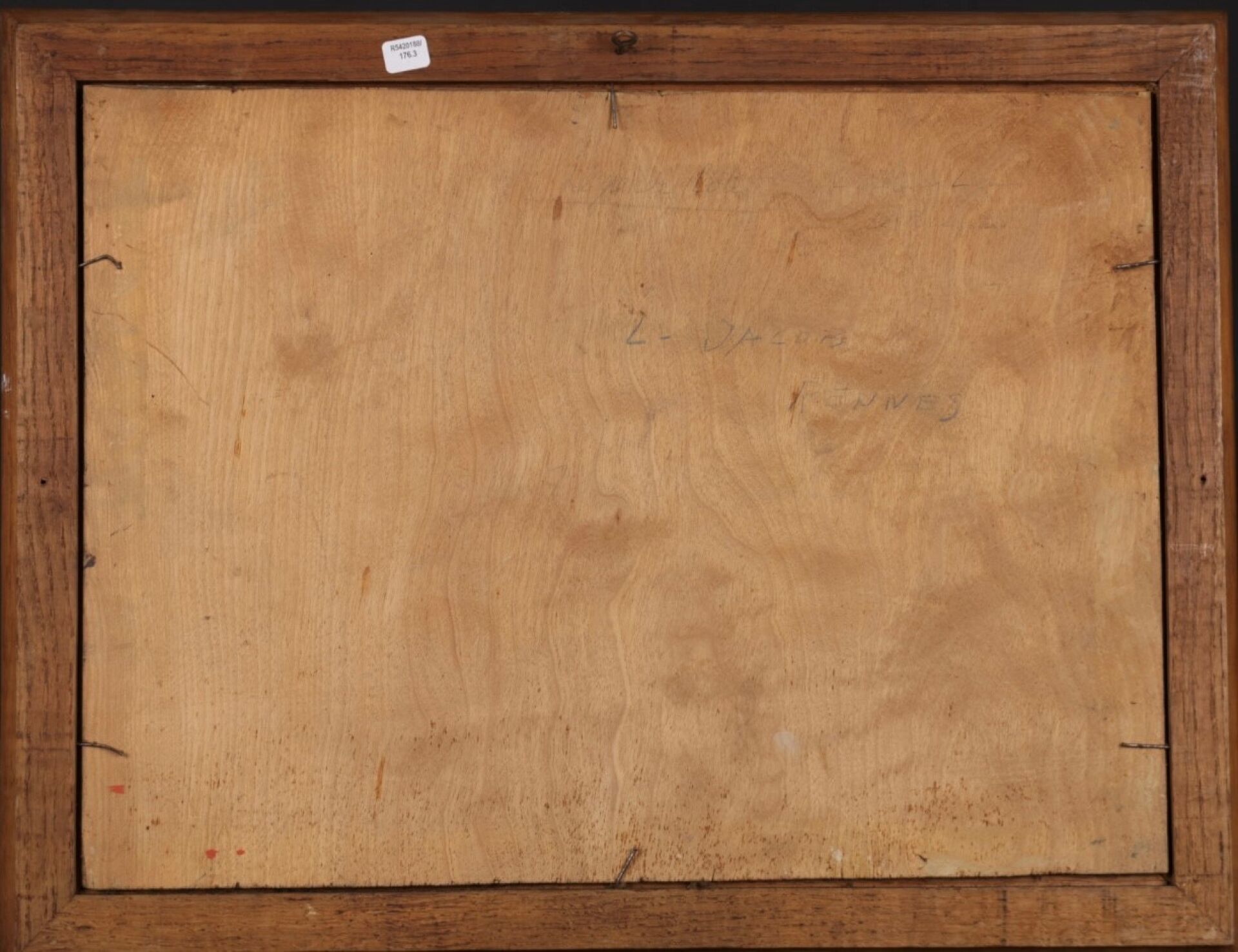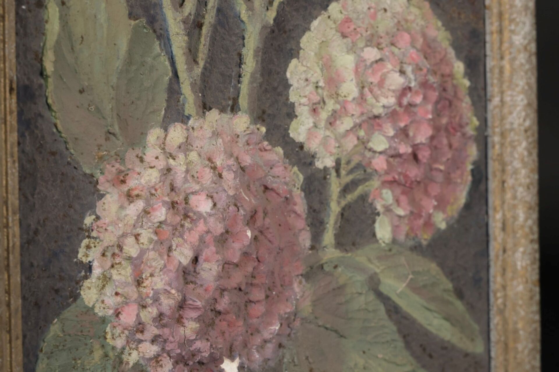 Louis JACOB (1876-1972). La grande côte au Pouliguen. Huile signée en bas à gauche, située au revers. Haut. : 39 cm - Larg. : 53 cm On joint : Louis JACOB (1876-1972). Hortensias. Composition mixte sur panneau signée en bas à droite. Haut. : 24 cm - Larg. : 31 cm