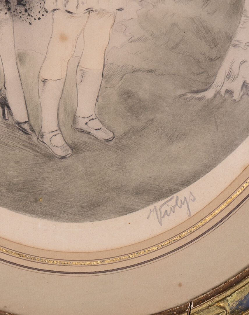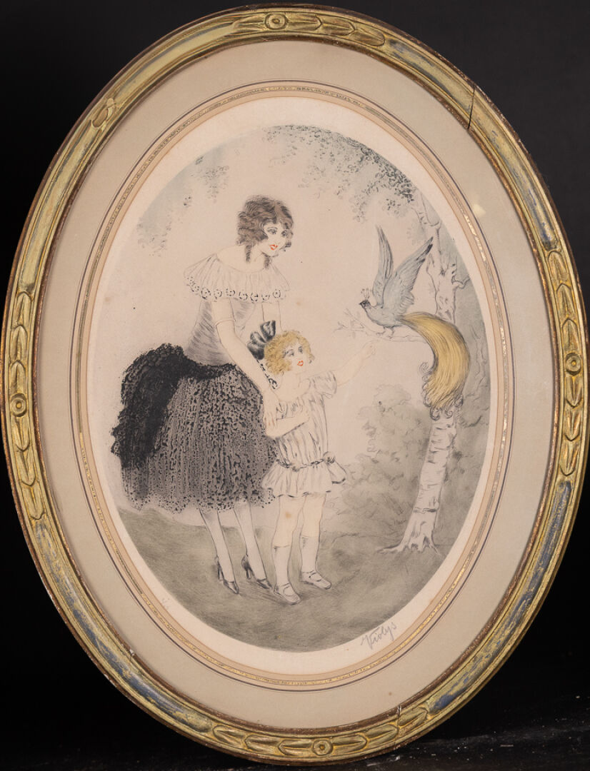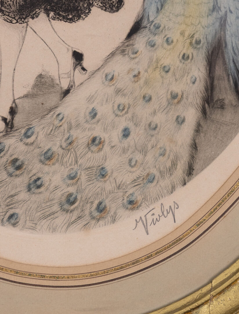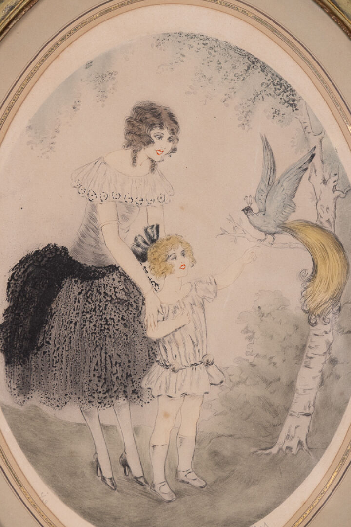 VIOLYS (XXe siècle). Paire de lithographies polychromes, à vue ovale, figurant : Une femme et sa fille, admirant un paon. Signée et numérotée 6/250, dans la planche. Une femme et sa fille admirant un oiseau de paradis. Signée et numérotée 1/10 (?), dans la planche.