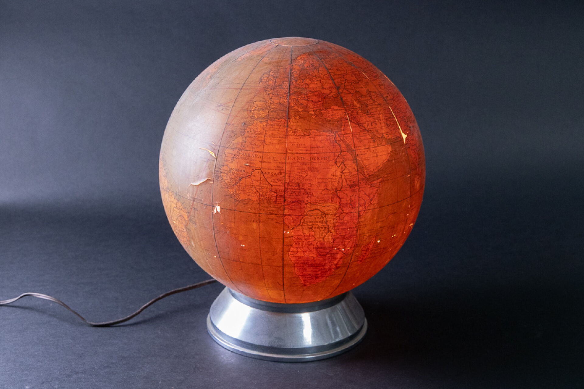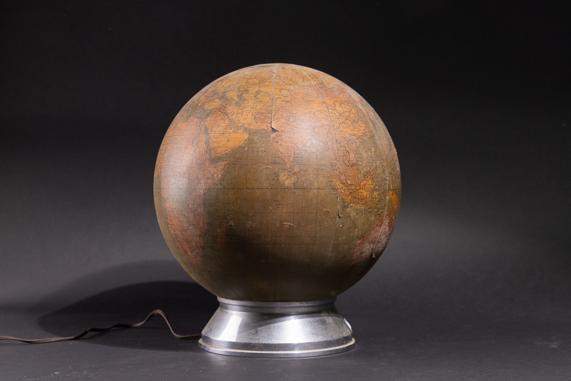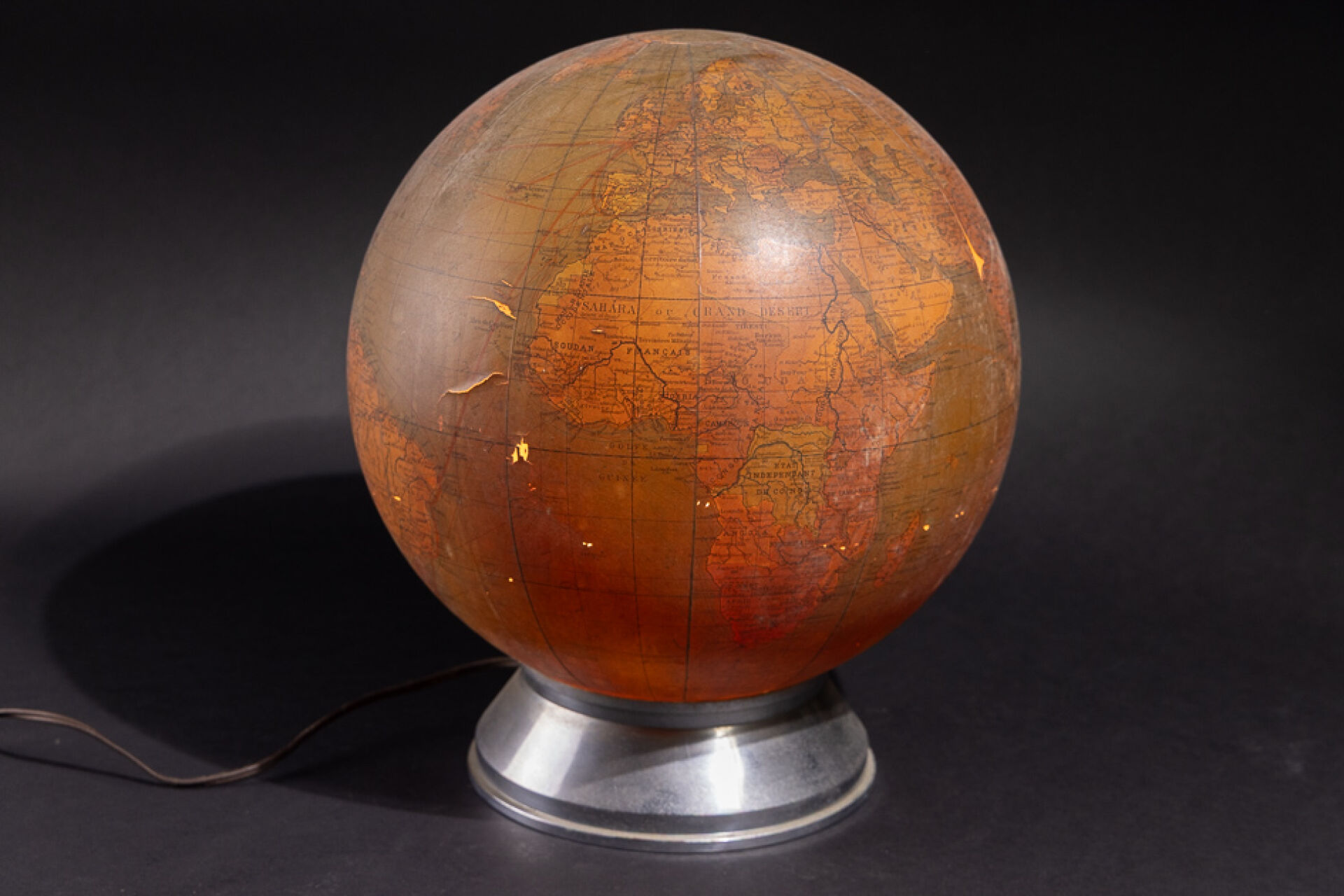 Globe terrestre monté en lampe, le socle en métal (chocs). Marqué " GLOBE COMMERCIAL " (état d'usage, soulèvements). Vers 1930. Haut. : 78 cm