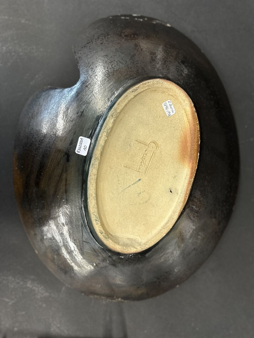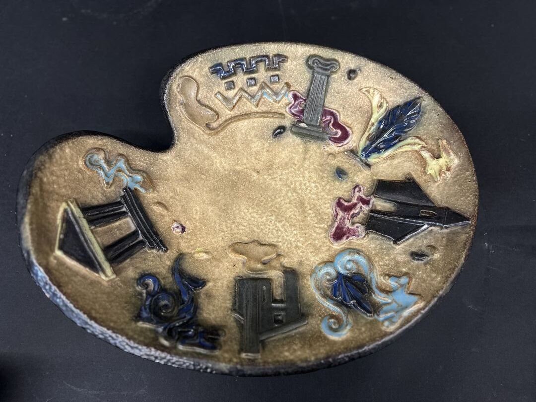 ROGER GUERIN (1896-1954) sujet en grès polychrome figurant une palette de peintre le pourtour orné d'éléments et motifs architecturaux tels que acanthes, méandre, colonne cannelée au chapiteau ionique, templion (petits éclats) Signée au revers vers 1940. Haut. : 11,5 cm - Larg. : 44 cm - Prof. : 34 cm
