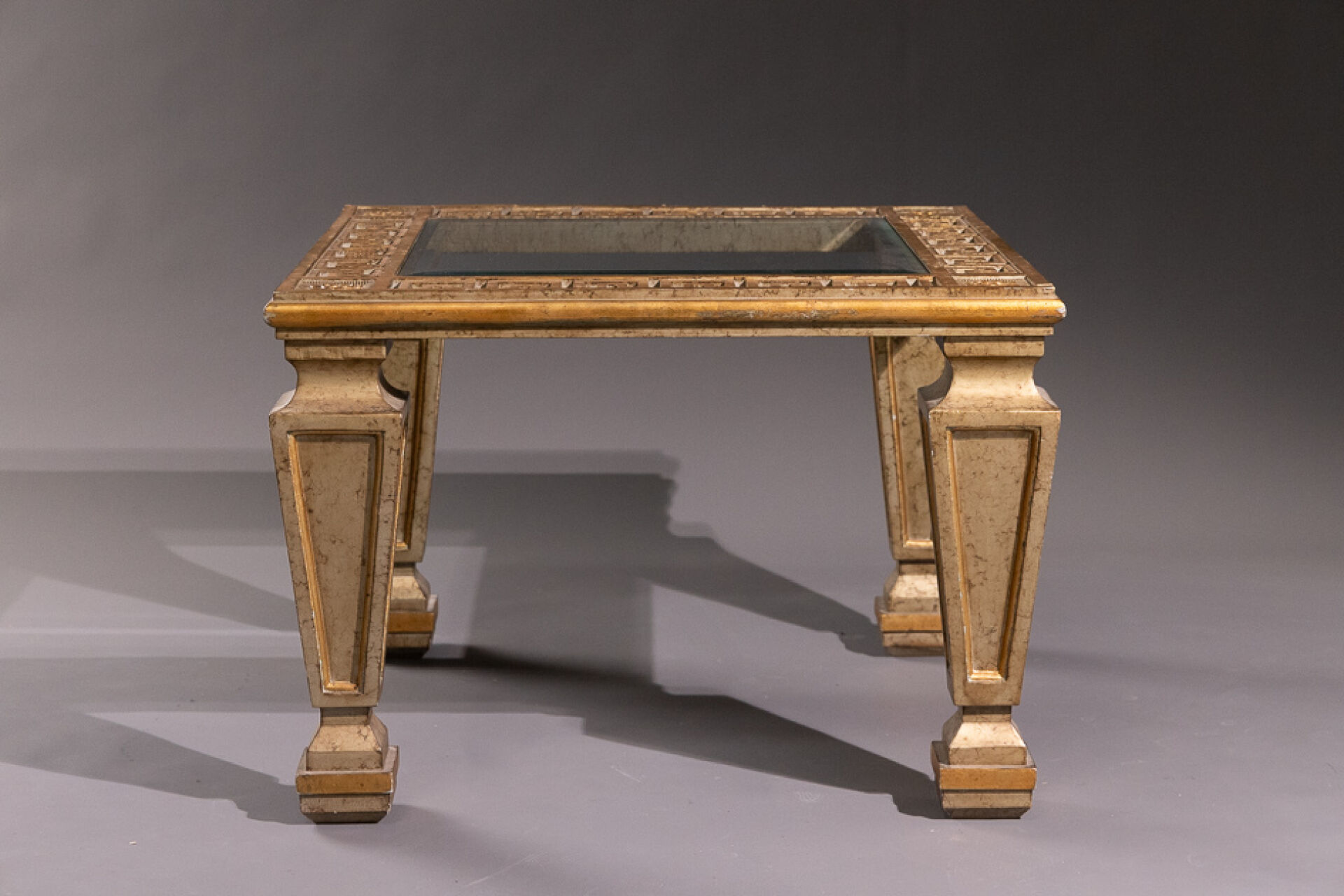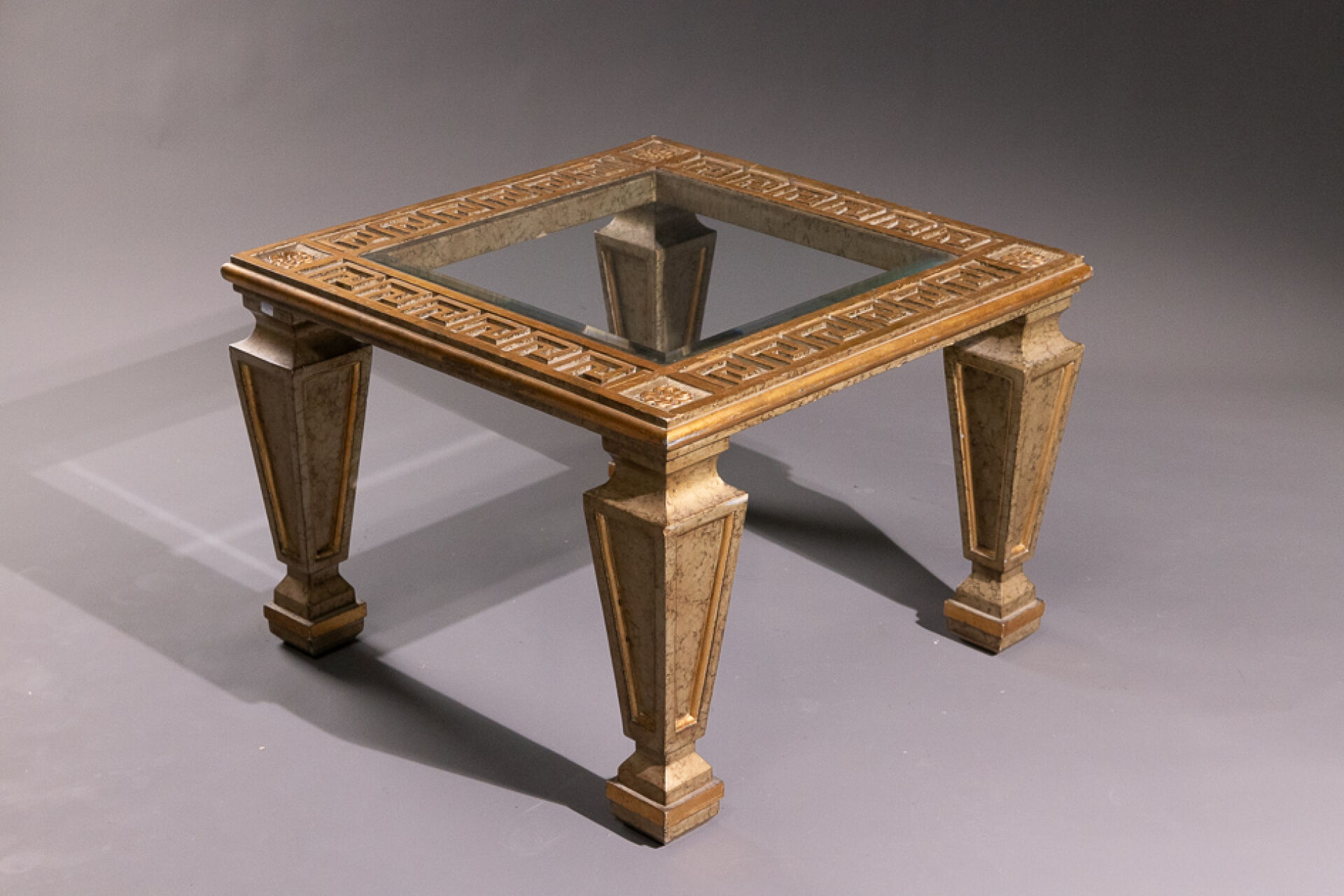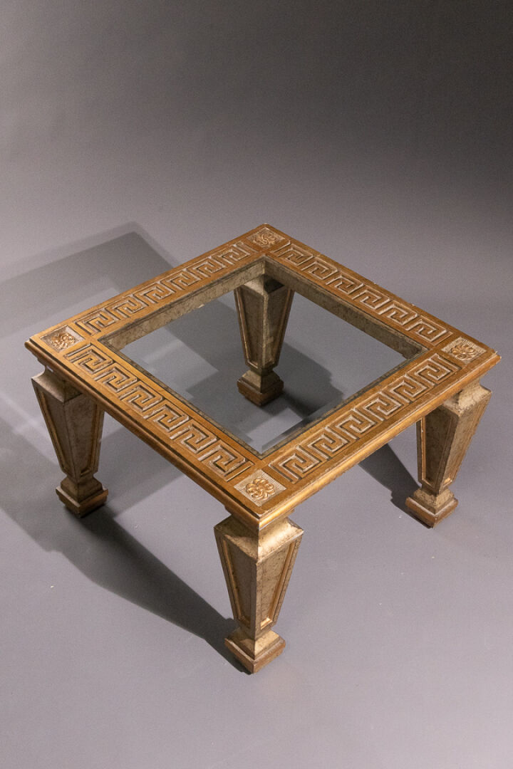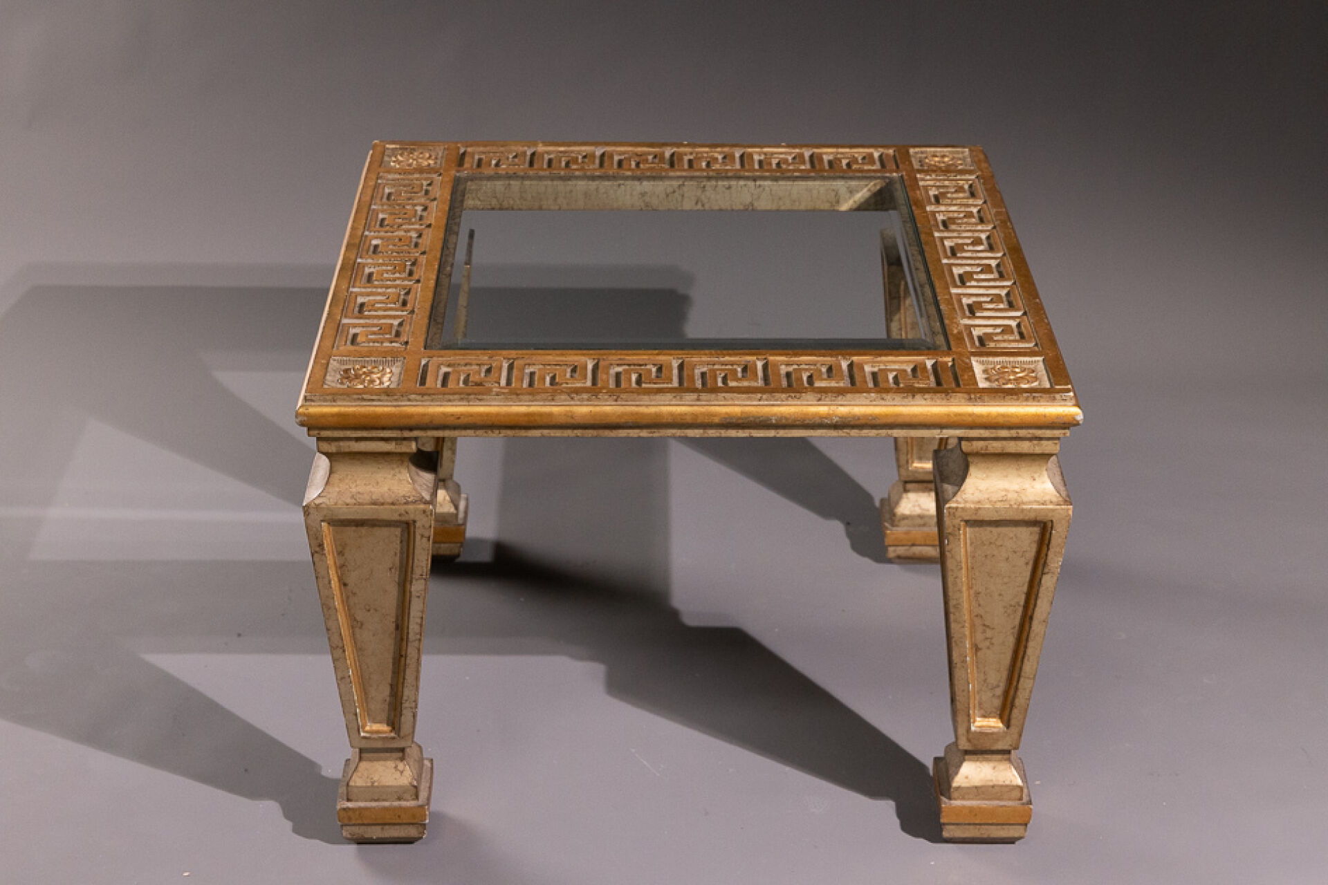 Table basse carrée en bois et stuques laqués à l'imitation du marbre et doré, le plateau carré à verre bizauté, ceinturé d'une frise de méandres et de fleurettes. Les pieds en gaine (petits éclats et rayures d'usage). Style Néo- grecque dans le goût de Versace. Haut. : 52 cm - Côté : 72 cm