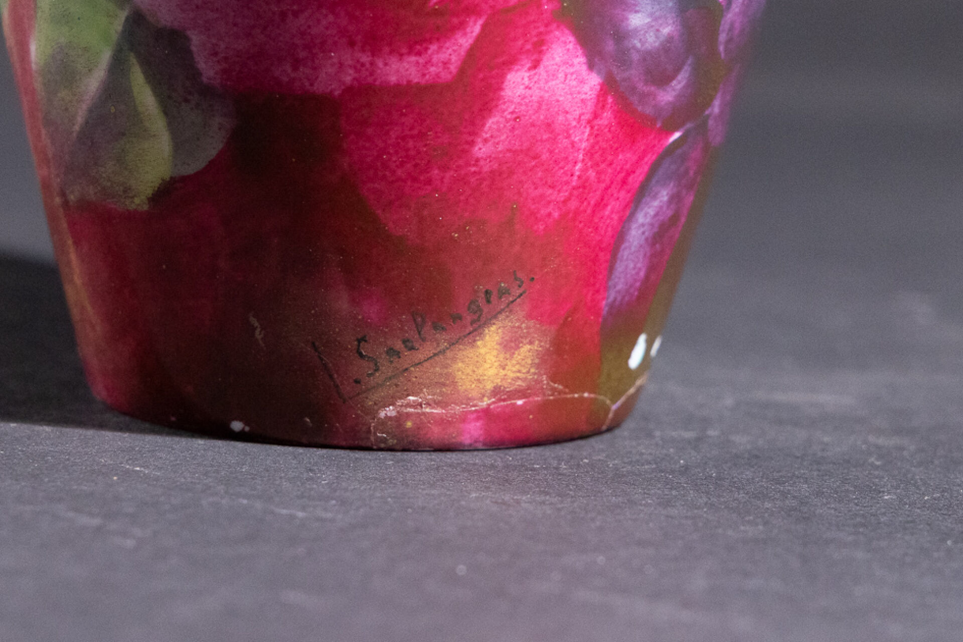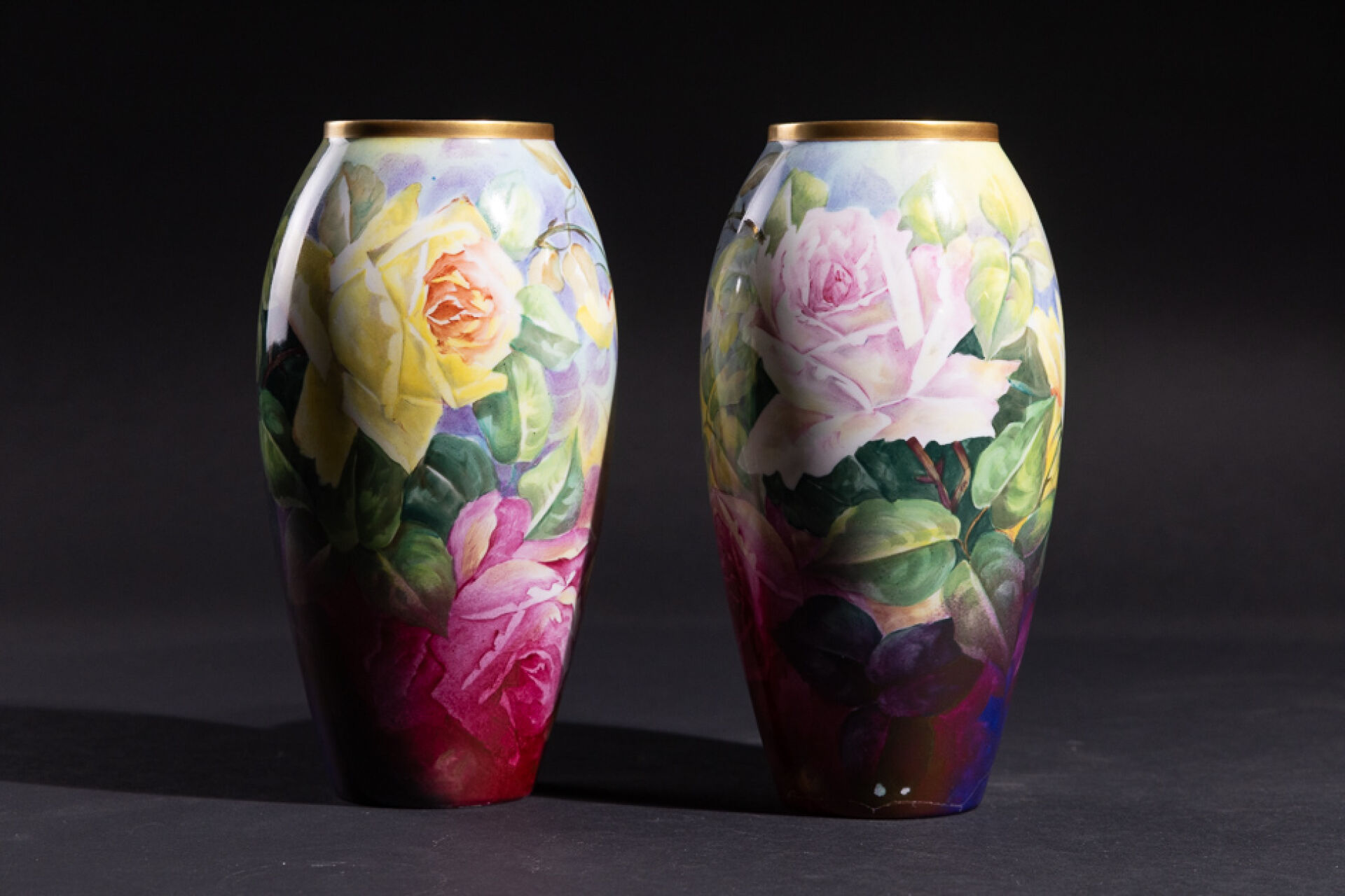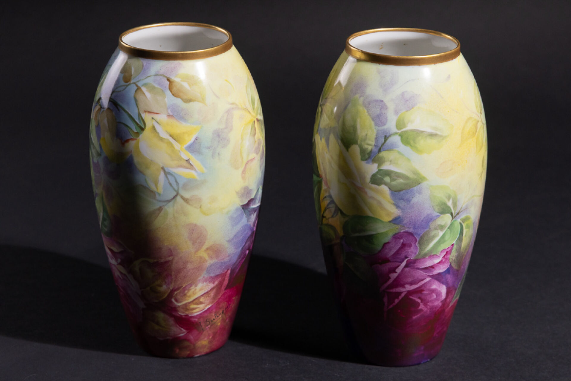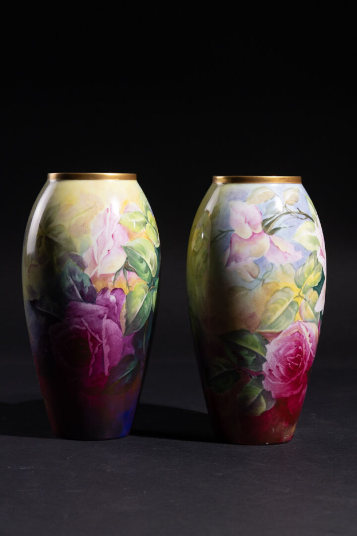 SARLANGEAS à Limoges. Paire de vases en porcelaine à décor couvrant de fleurs au naturel, signé. Le petit col doré. Marquée au revers "Peinture d'Art" (accident à la base d'un vase casé recollé, un petit manque). Vers 1960. Haut. : 26 cm