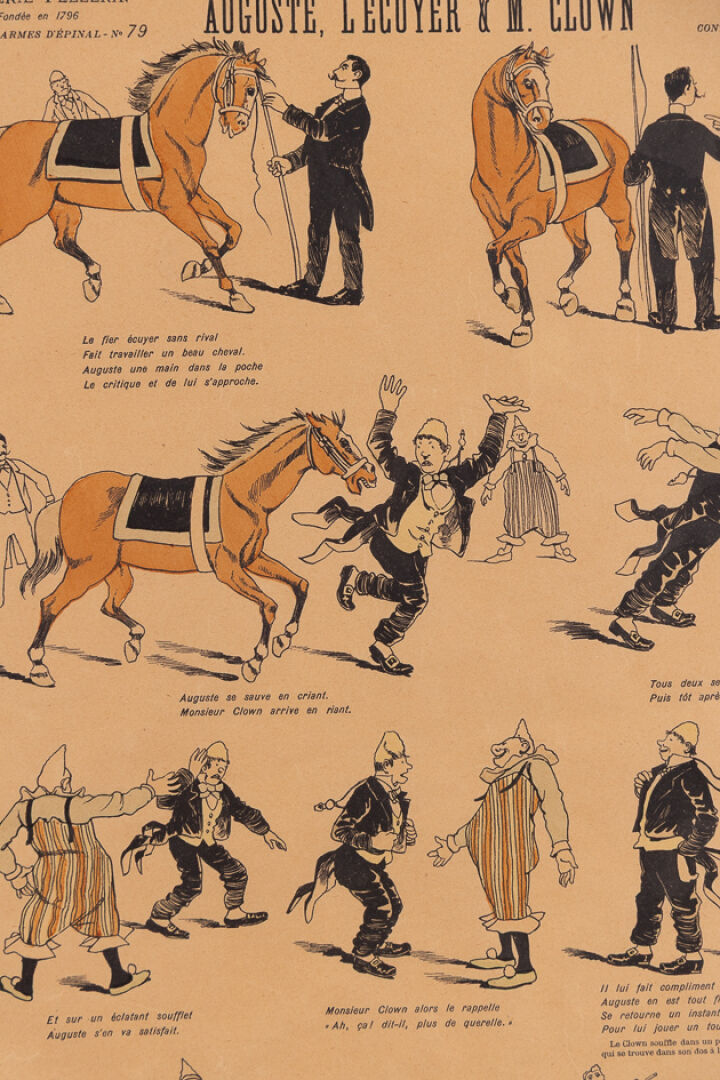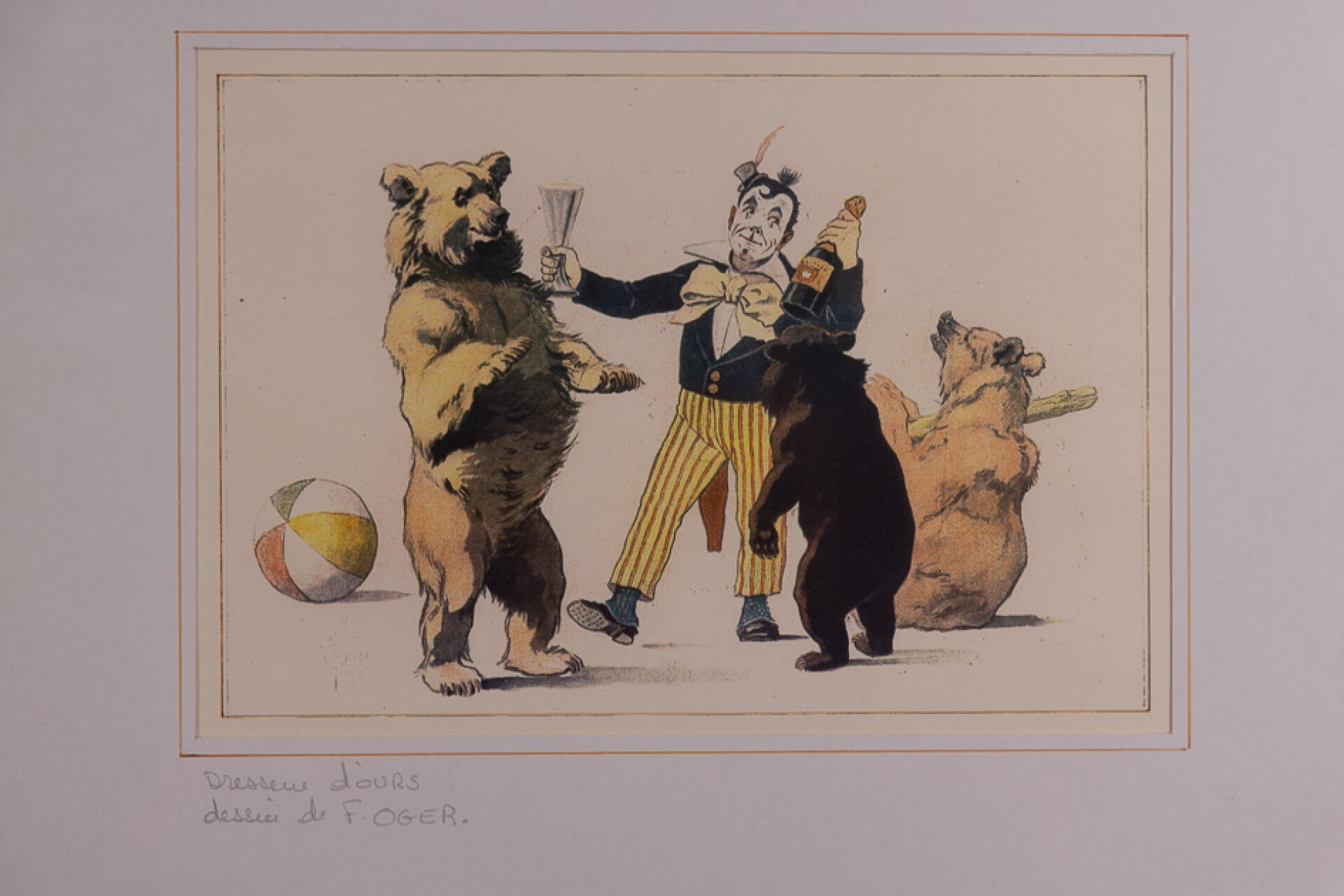 D'après Ferdinand OGER (1872-1929). Scènes de cirque : dresseur d'ours, les singes cavaliers, le défilé de chiens. Trois reproductions en couleur. Haut. : 14 cm - Larg. : 20 cm