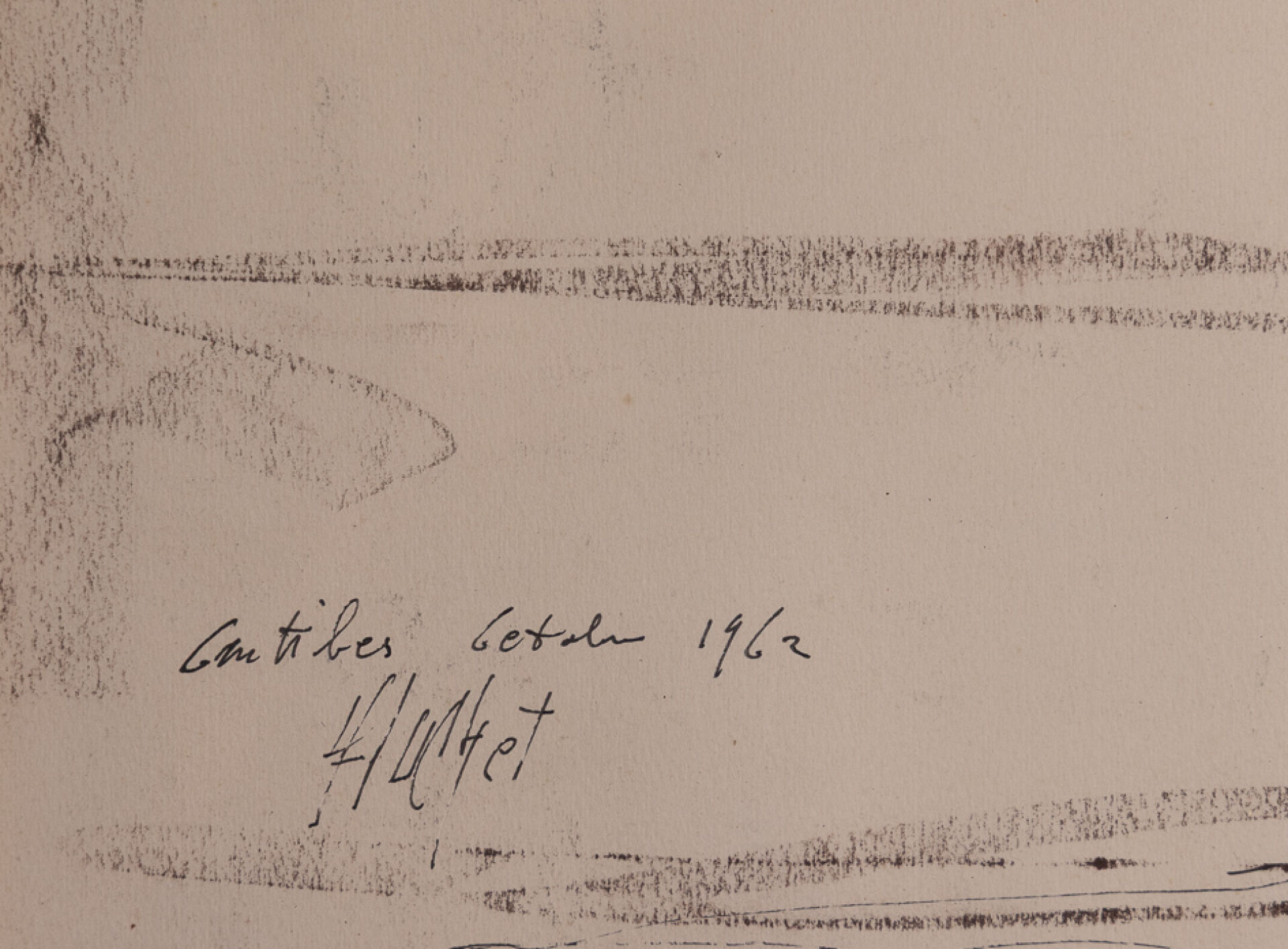 Urbain HUCHET (1930-2014). Vue du port d'Antibes. Dessin au fusain et encre de chine, signé, situé et daté "1962" en bas à gauche. Haut. : 64 cm - Larg. : 48 cm
