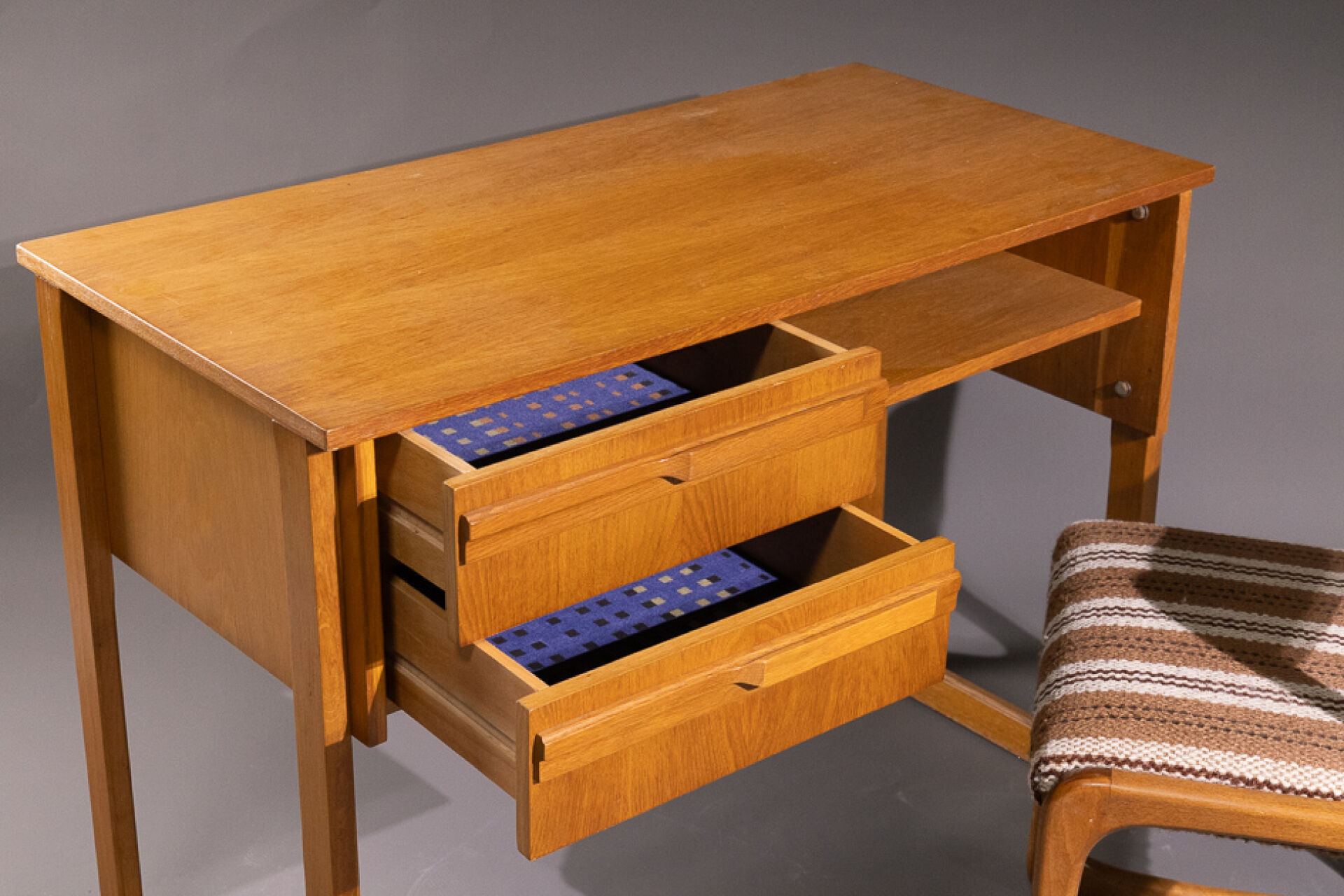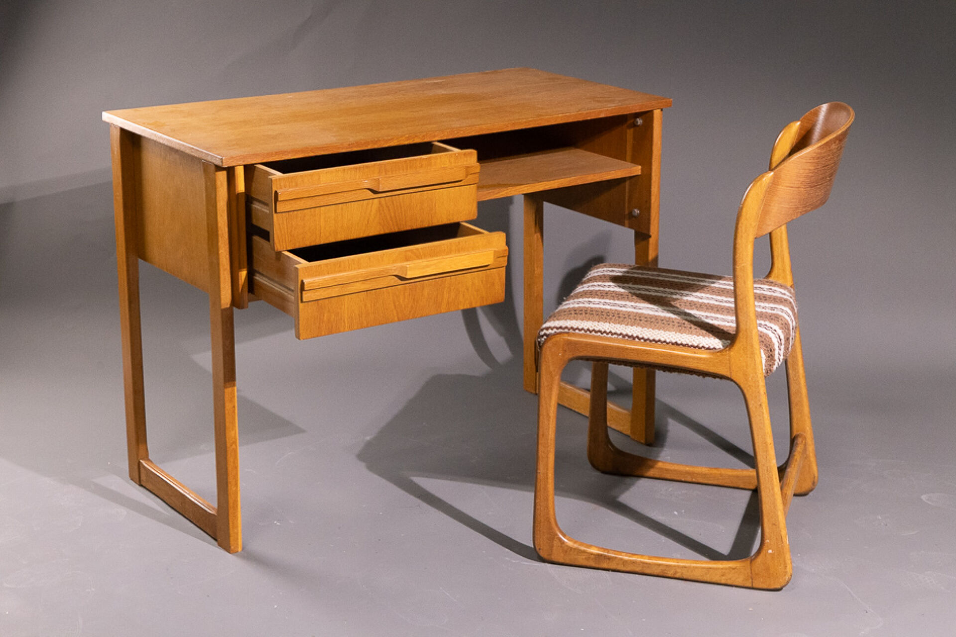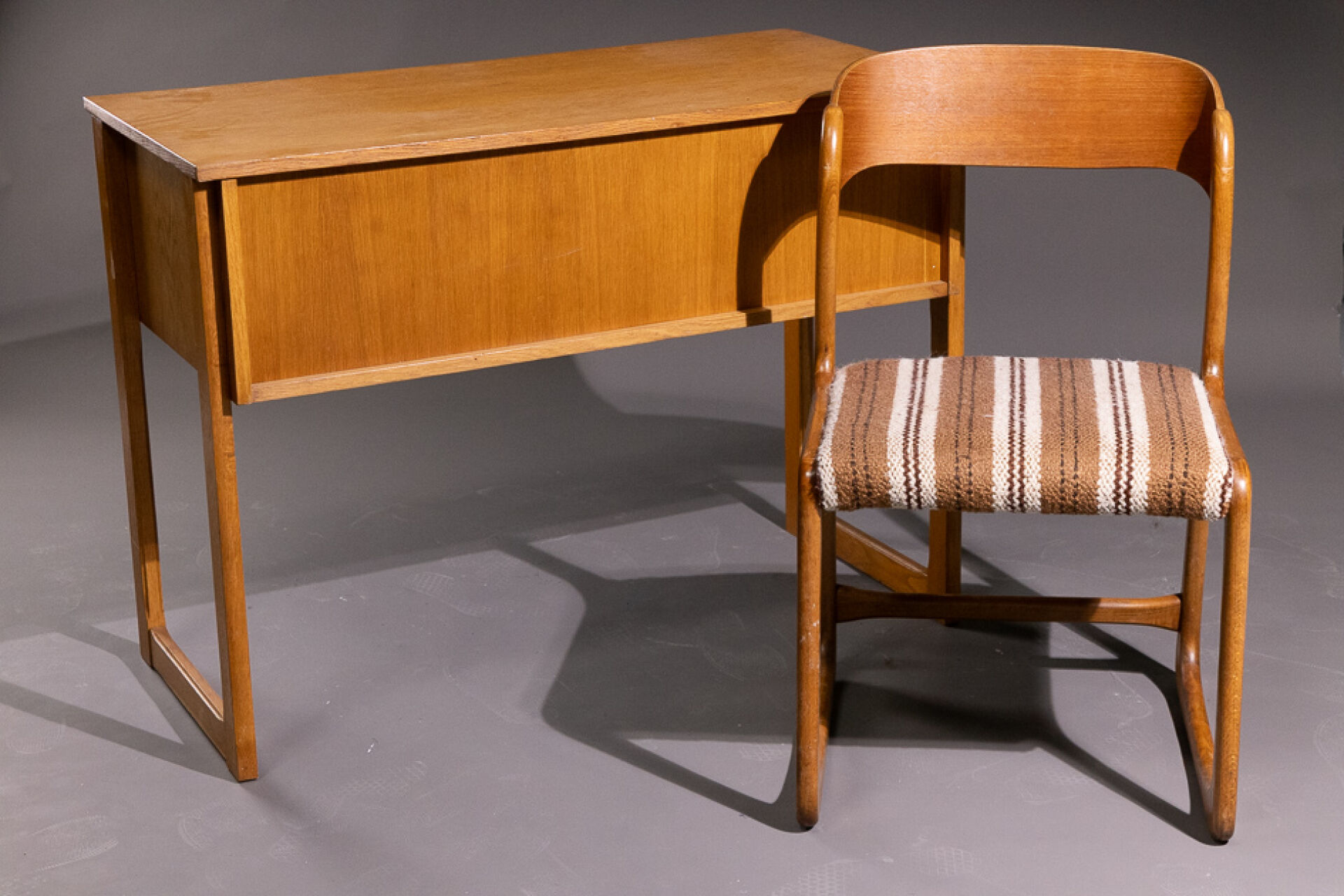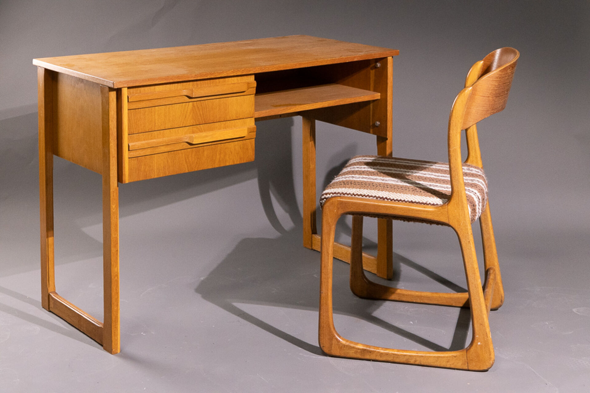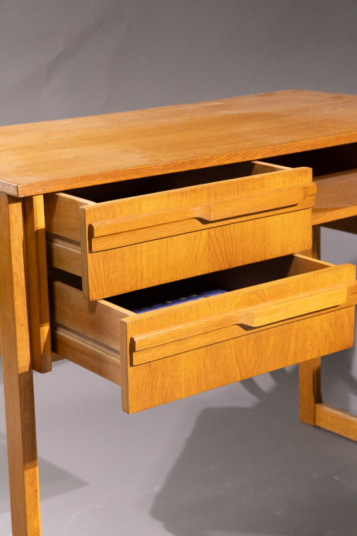 O.T.O (XXe siècle). Bureau en placage de chêne à deux tiroirs et un casier, piètement droit (traces d'usage). Années 1960/1970. Haut. : 75 cm - Larg. : 100 cm - Prof. : 50 cm On joint : Dans le goût de BAUMANN. Chaise traineau en chêne clair à dossier incurvé. Années 1970. Haut. : 81 cm - Larg. : 47 cm - Prof. : 46 cm