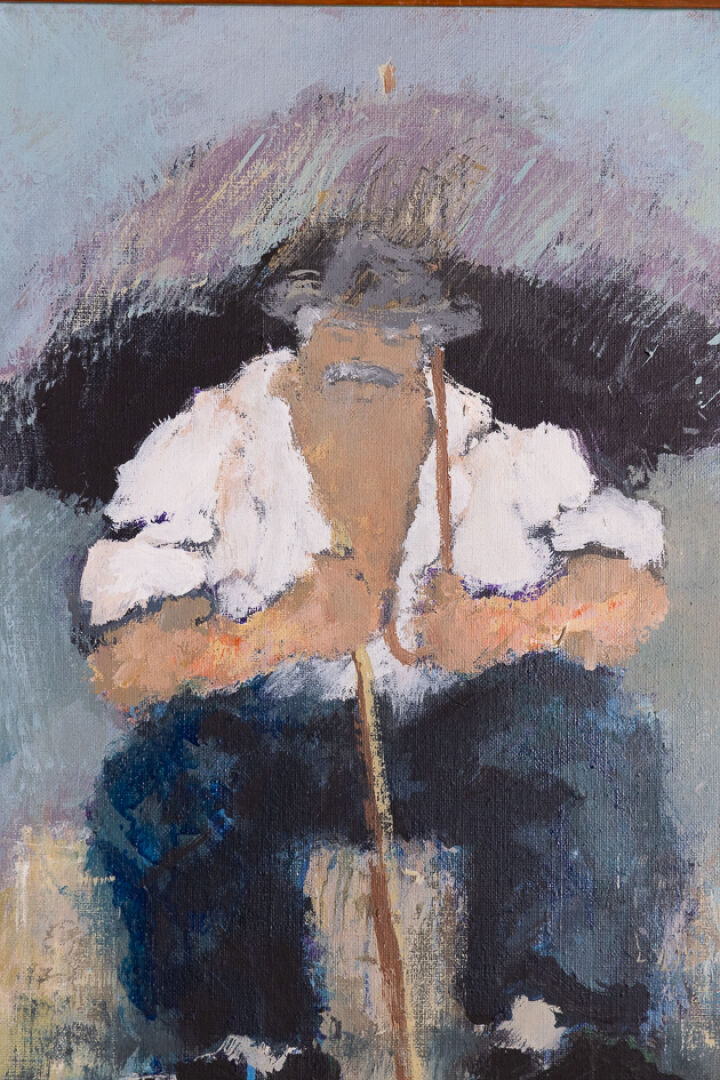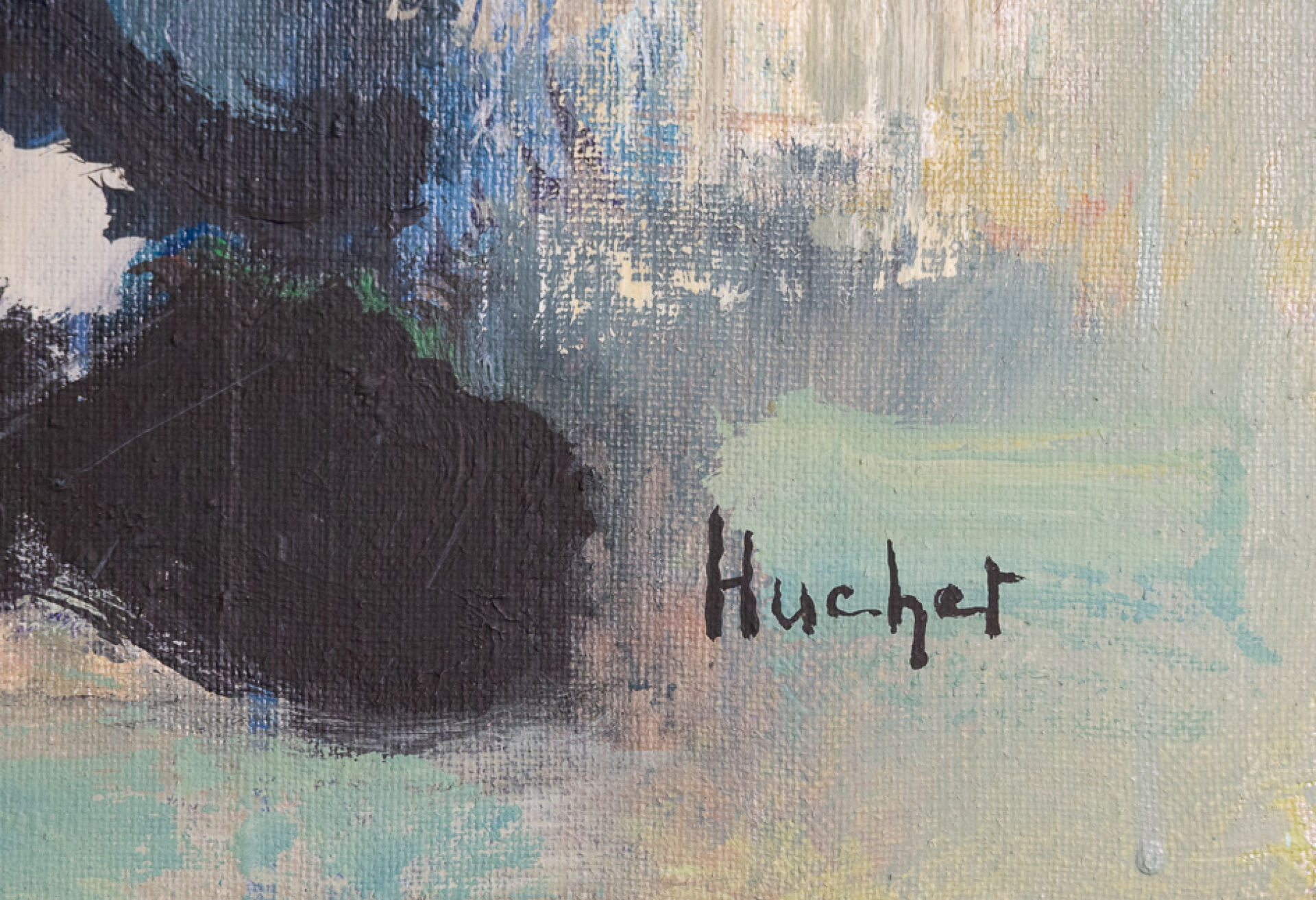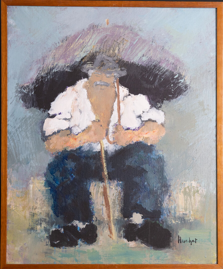 Urbain HUCHET (1930-2014). Homme sous un parapluie. Huile sur toile signée en bas à droite. Haut. : 60 cm - Larg. : 49 cm