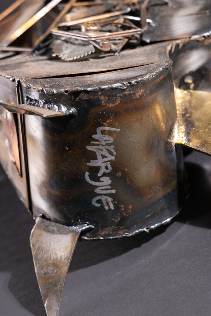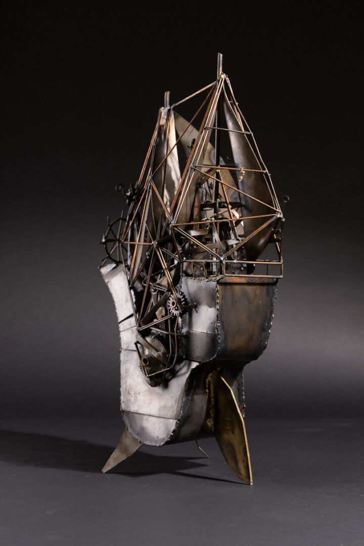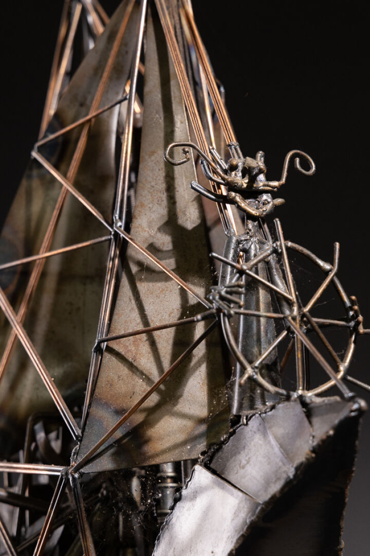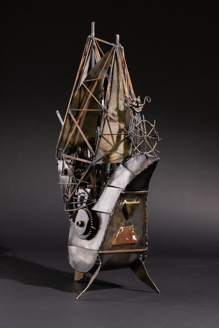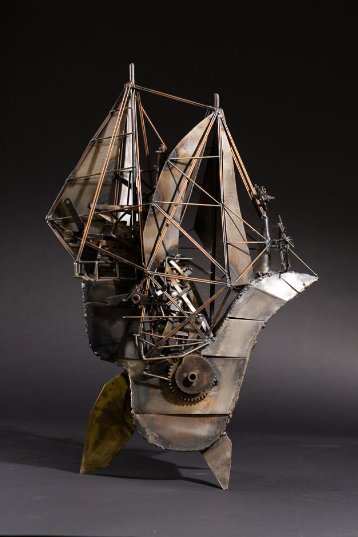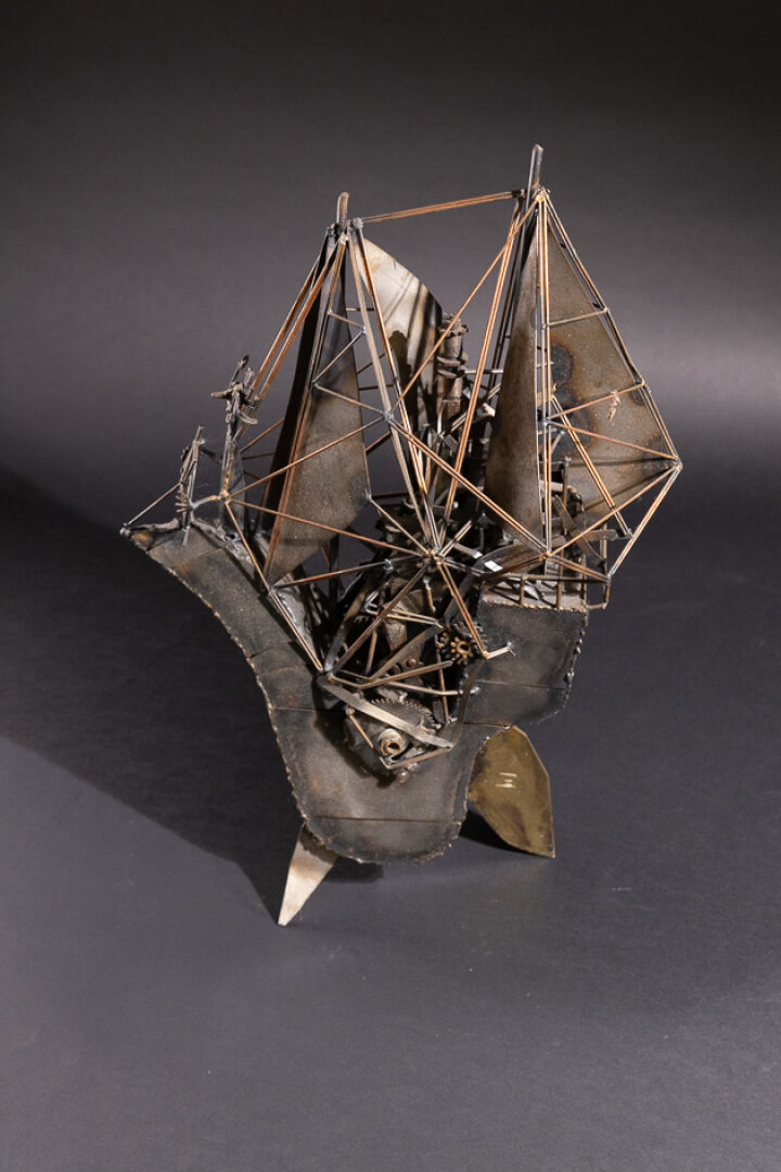 LAFARGUE (XXe siècle). Le navire au capitaine moustachu. Sculpture en métal signée au revers. Haut. : 56 cm - Larg. : 36 cm - Prof. : 22 cm