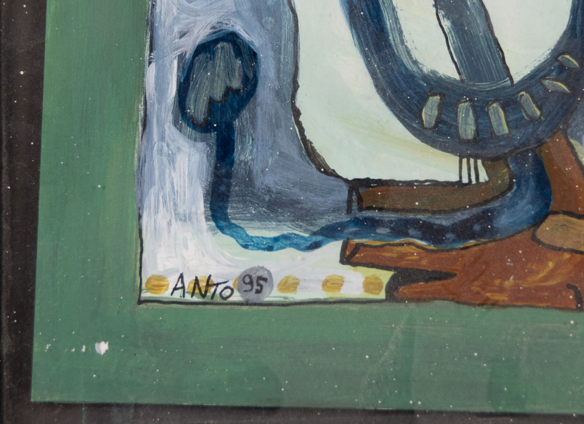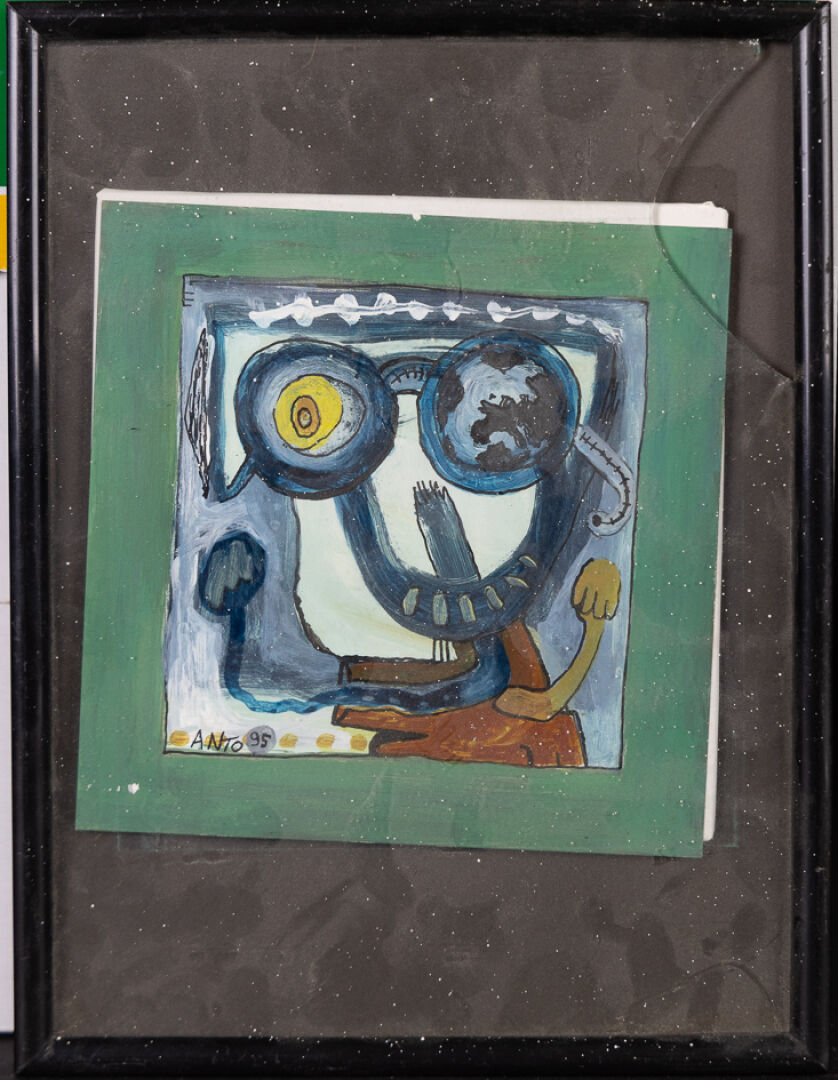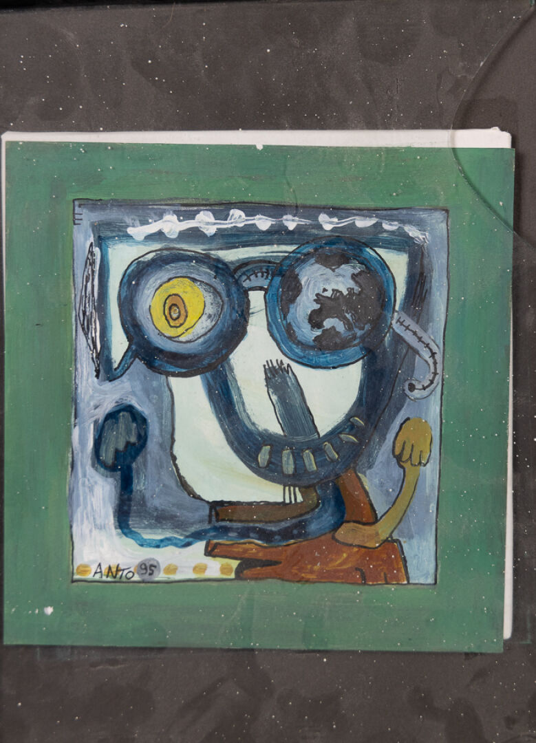 Laurent Michel VAYSSIERE dit ANTO (né en 1962). "Il voit le monde à travers ses lunettes", 95 Huile sur papier cartonnée, signée, datée et titrée au dos, signée et datée en bas à gauche Haut. : 15 cm - Larg. : 15 cm Collection d'un amateur, Monsieur F.
