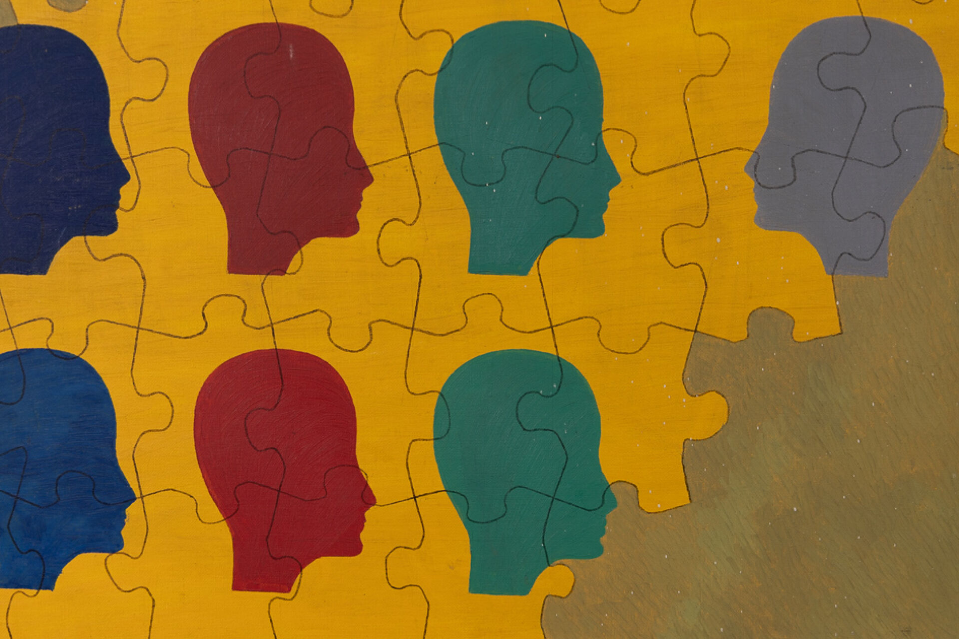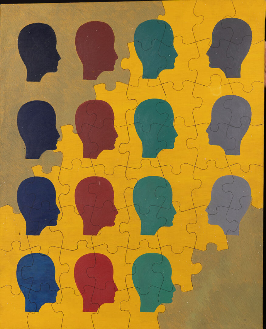 École Moderne. Composition abstraite au puzzle et profils. Huile sur toile (accidents). Haut. : 81 cm - Larg. : 65 cm Collection d'un amateur, Monsieur F.