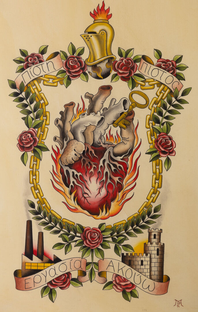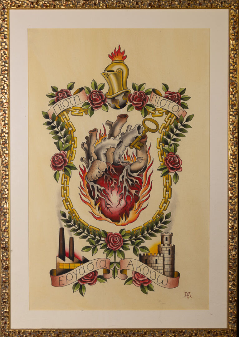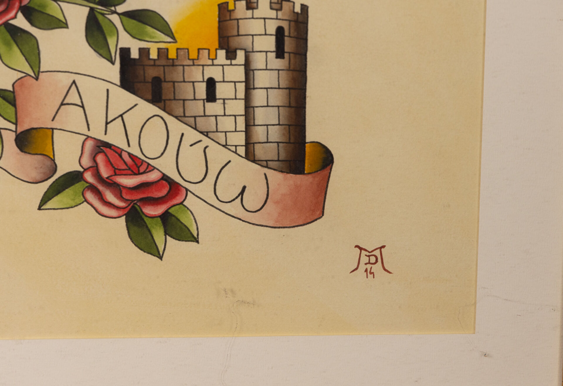 Mike DAVIS (XXe-XXIe siècle). Blason au cœur, Foi/Fidèle/Travail/Entendre. Dessin, monogrammé et numéroté 14 en bas à gauche. Dim à vue : Haut. : 85 cm - Larg. : 55 cm Collection d'un amateur, Monsieur F. Mike Davis est un peintre surréaliste moderne vivant et travaillant actuellement à San Francisco, Californie. Ayant des centres d'intérêt variés, Davis commence à peindre en 1997. Il attribut son inspiration non seulement au fait d'avoir, durant son enfance, regardé continuellement sa mère mener de nombreux projets d'art, mais également à sa passion pour l'histoire de l'art, omniprésente tout au long de sa carrière. Aidant sa mère dans une panoplie d'activités telles que la menuiserie, le travail du cuir ou le réagencement de la demeure familiale, et s'intéressant de près à l'art ancien et aux peintres néerlandais de la Renaissance nordique, Davis est un peintre autodidacte qui s'évertue à créer des scènes complexes d'un réel surréaliste, remplies de symboles de mortalité, de folie et d'orgueil, fixées à travers des compositions fantasques. En plus de sa vocation de peintre, Mike Davis est un musicien et un menuisier de même que le propriétaire d'un célèbre salon de tatouage, le Everlasting Tattoo. Ses peintures ont fait l'objet d'acquisition de plusieurs collections permanentes muséales et son travail a figuré dans de nombreuses publications telles que Juxtapoz Magazine; Hi-Fructose; Art Ltd; Pop Surrealism : The Rise of Underground Art ; Tatt Book : Visionares of Tattoo ; Beyond Tattoo; et plusieurs blogues de renom destinés au monde de l'Art. Clients internationaux et célèbres, la liste des personnes que Davis a tatouées est vaste et ne peut se comparer qu'à la liste de ses œuvres présentes dans les plus prestigieuses collections d'art privées aux États-Unis, au Canada, au Japon et en Europe.
