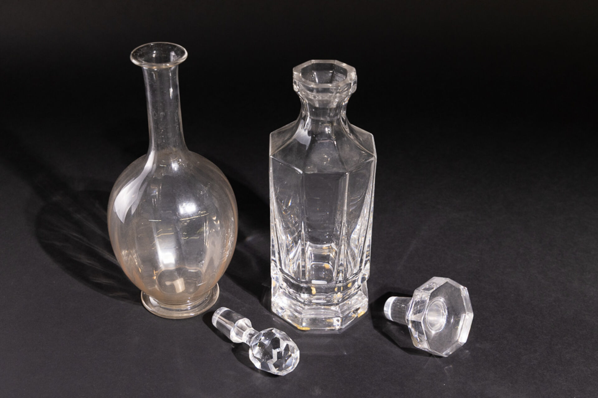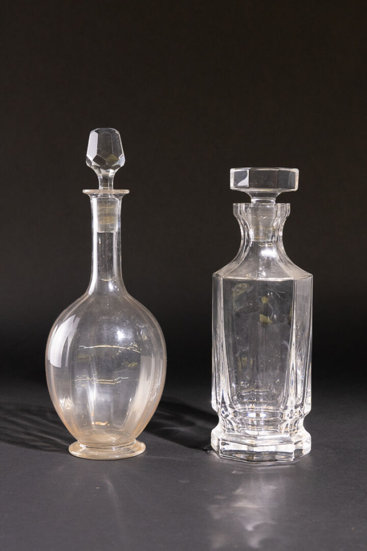 Cristallerie de SEVRES. Carafe à whisky octogonale en cristal, la base légèrement étranglée. Haut. : 27.5 cm On joint : Carafe à panse à légers godrons, bouchon rapporté à facettes. Haut. : 31 cm