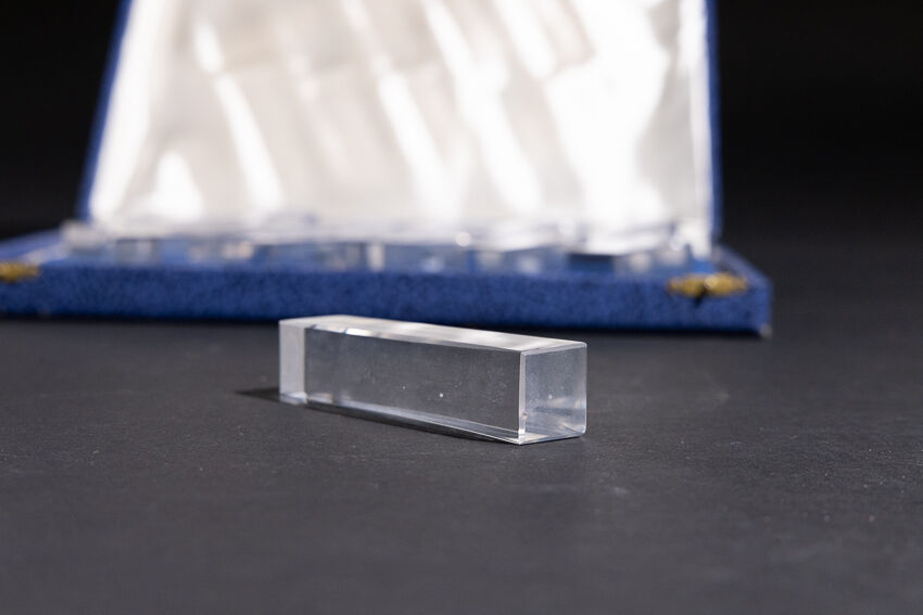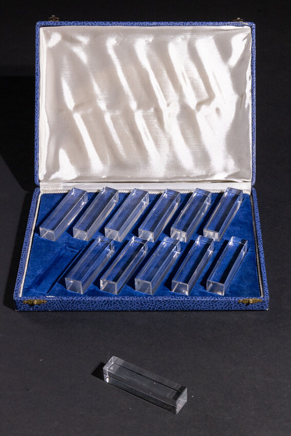 Cristallerie SAINT-LOUIS. Douze porte-couteaux en cristal de forme parallélépipédique, signés (petits éclats sur certains). Long. : 8 cm Dans leur coffret.