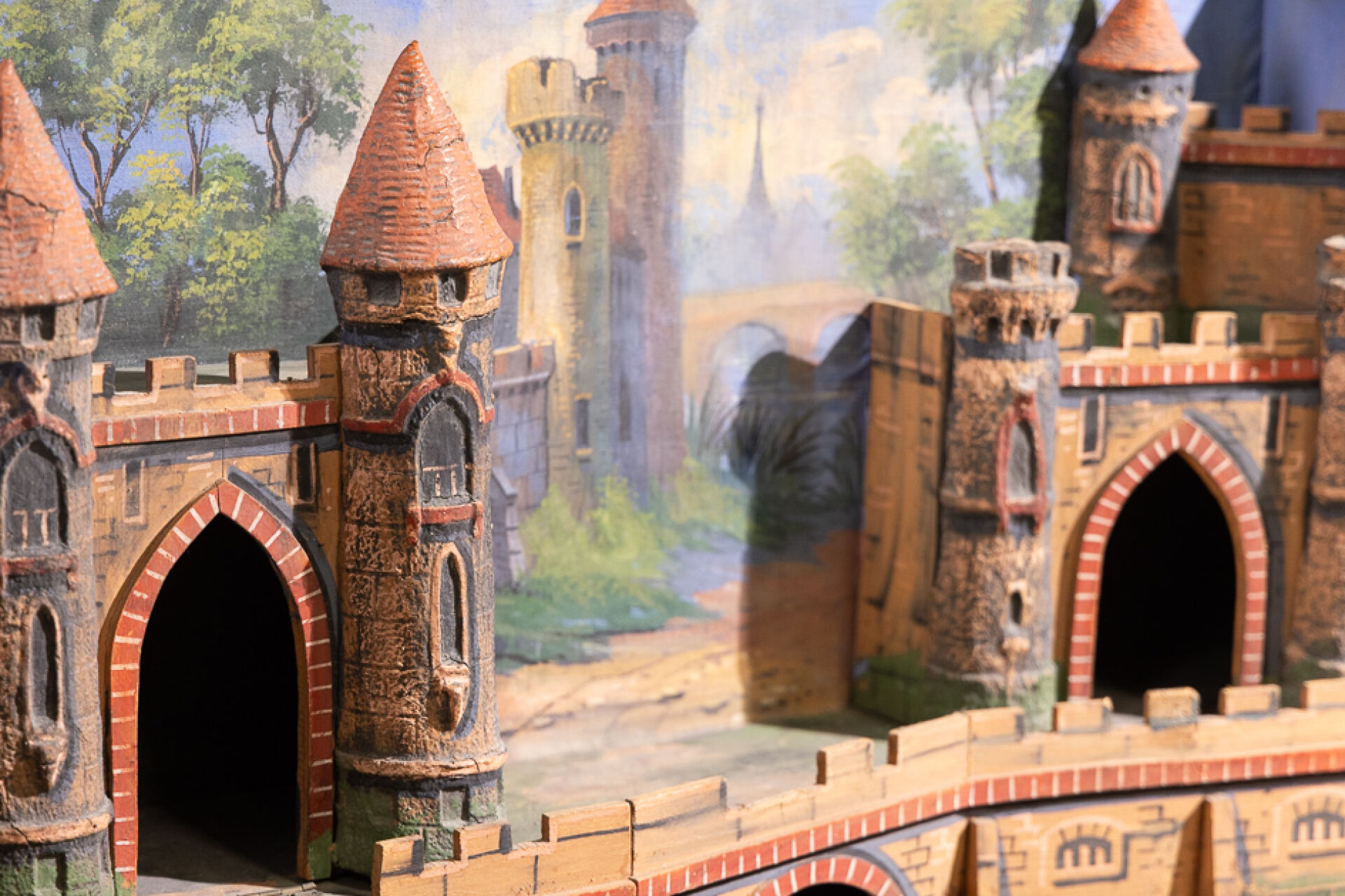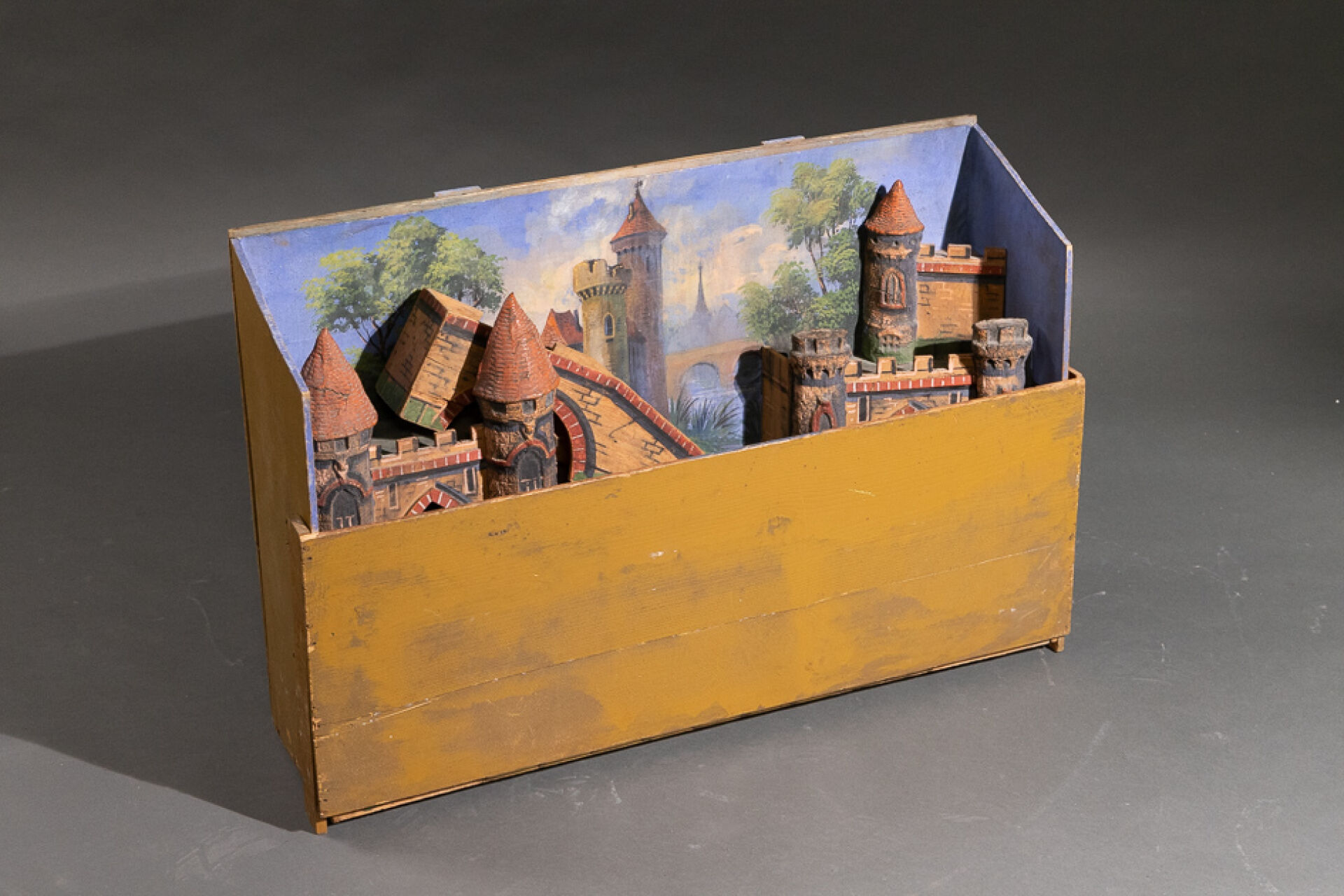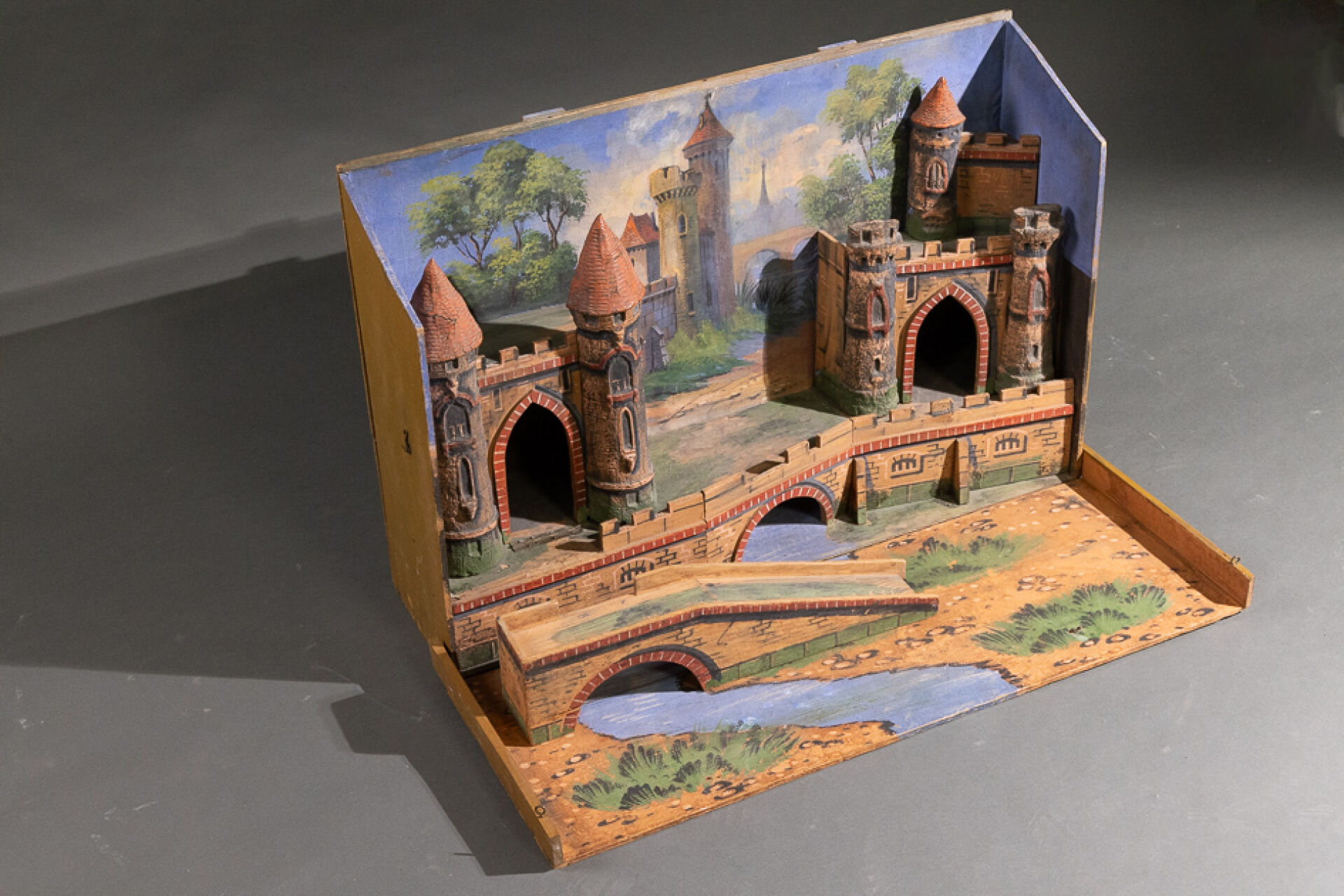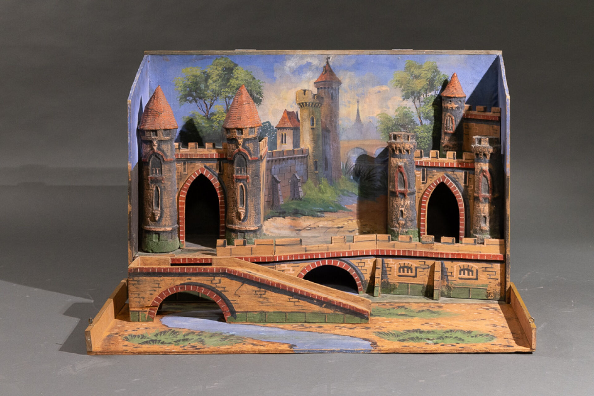 Château en bois et carton pâte, le fond peint en trompe l'œil, la partie avant rabattable permet de placer un pont (état d'usage). XXe siècle. Haut. : 53 cm - Larg. : 80 cm - Prof. dépliée : 51 cm