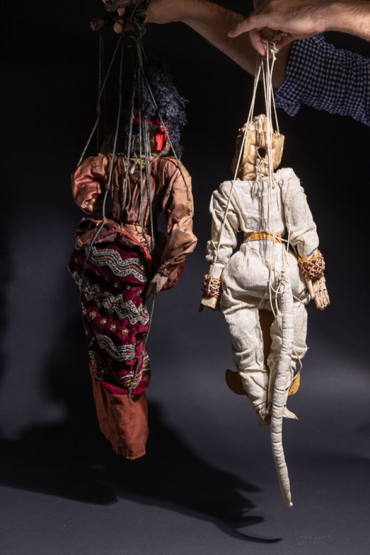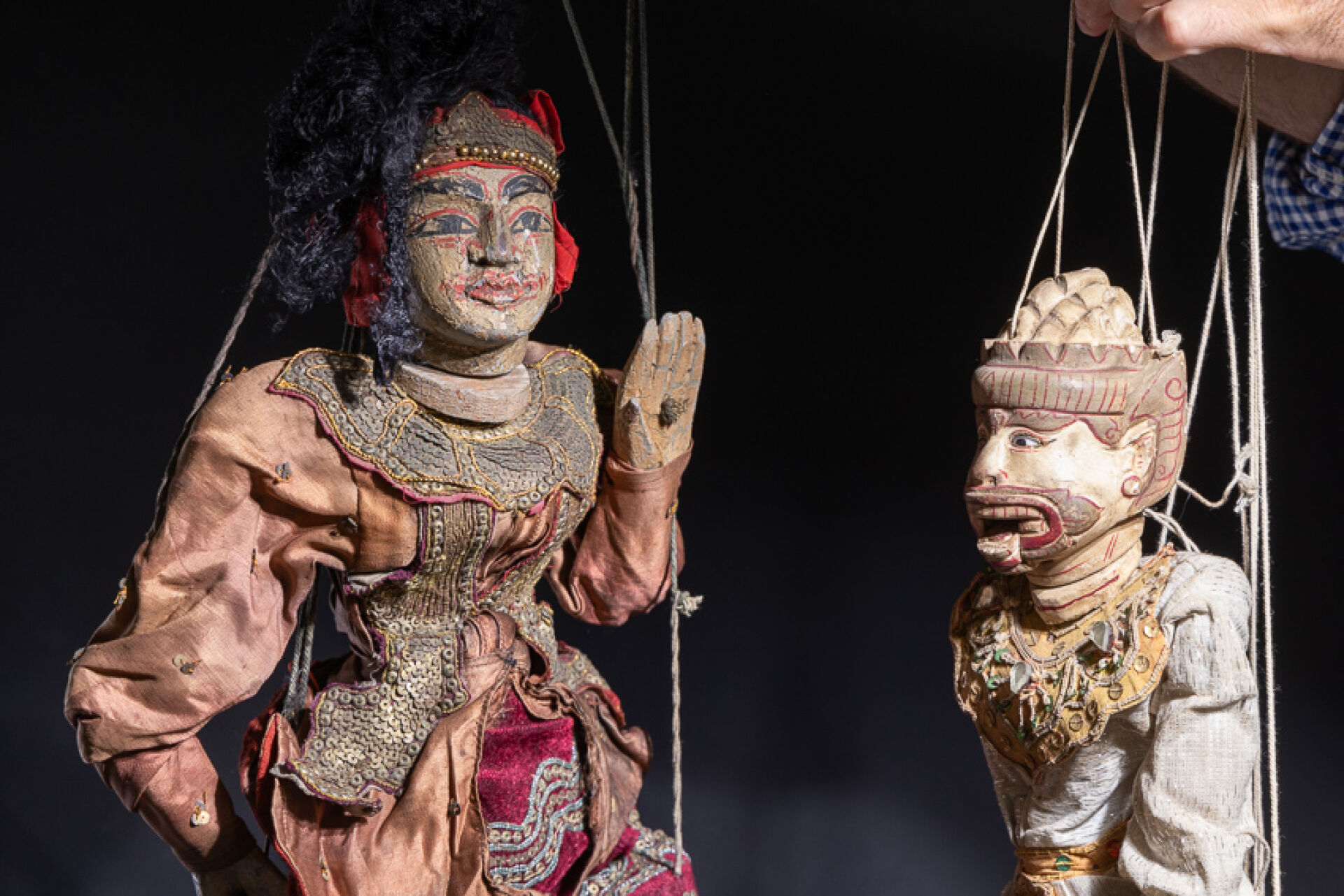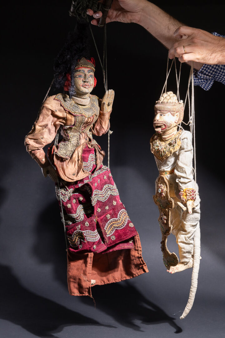 Ensemble de deux marionnettes en bois polychrome anthropomorphes, l'un à la mâchoire articulée (accidents). Birmanie, XXe siècle. Haut. : 48 et 62 cm