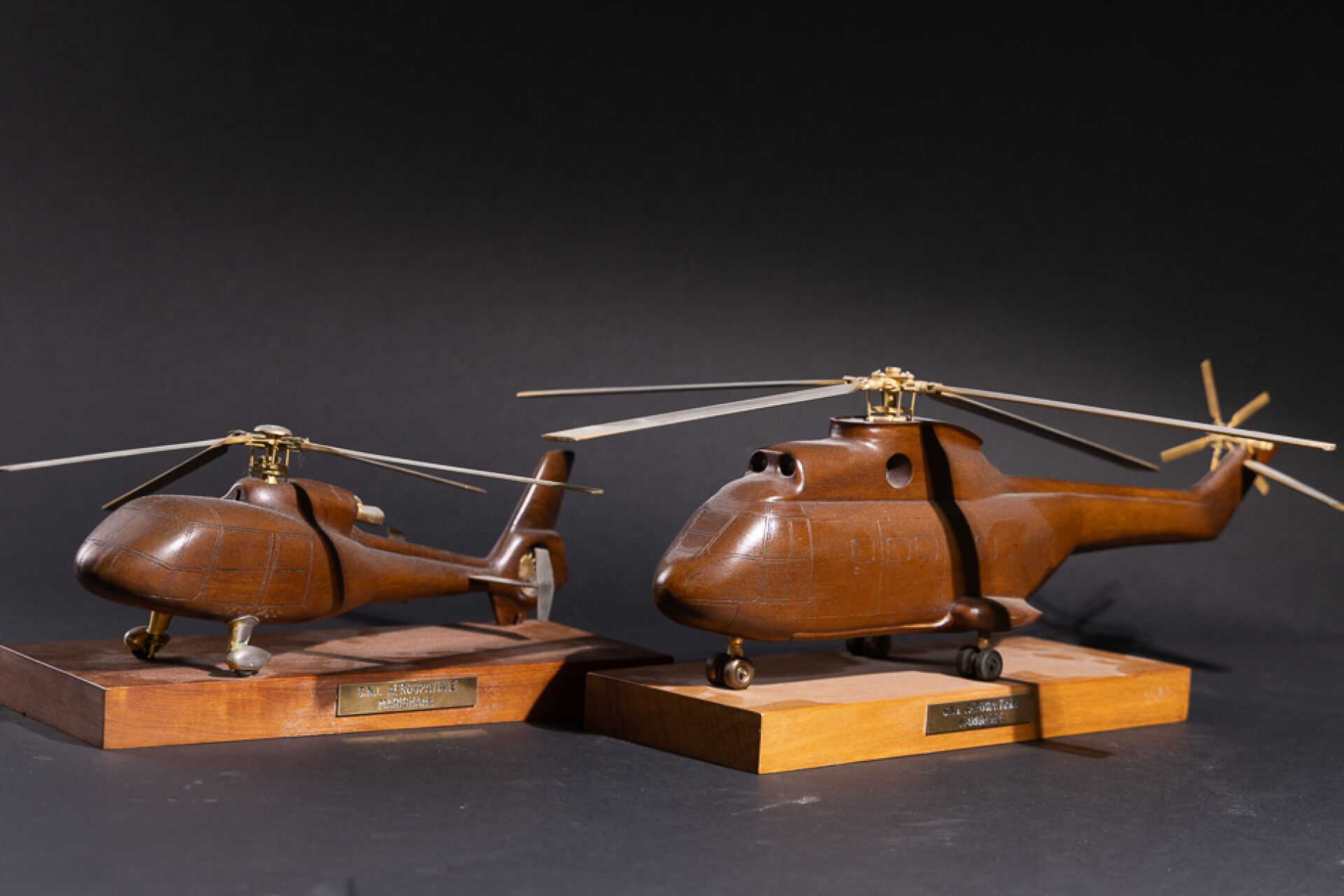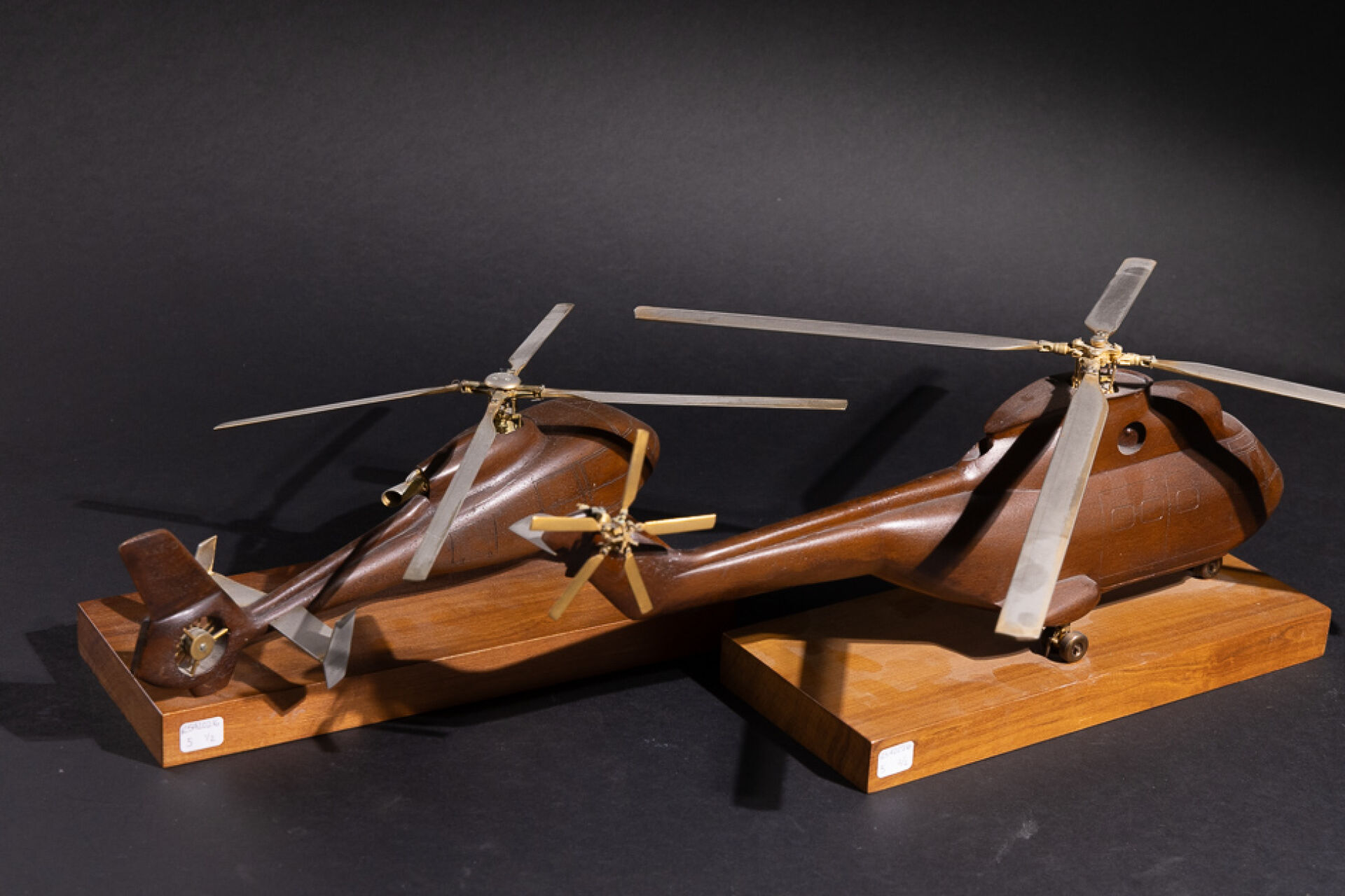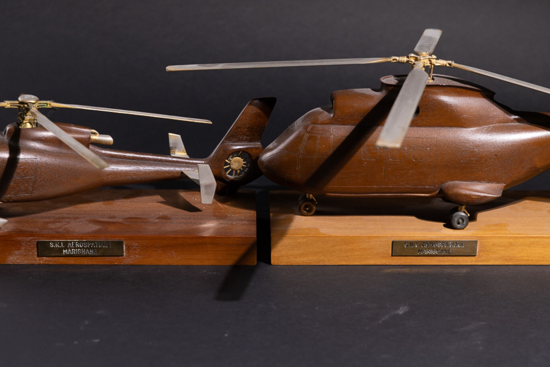 Deux modèles réduits en bois et métal figurant une gazelle et un puma présentés sur socle et titre SNI aérospatiale Marignane (accidents et manques). Long. : 40 et 50 cm