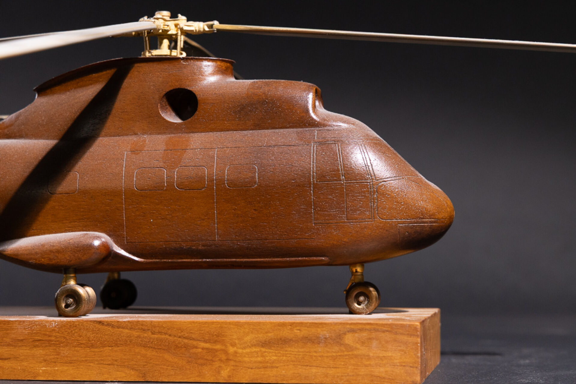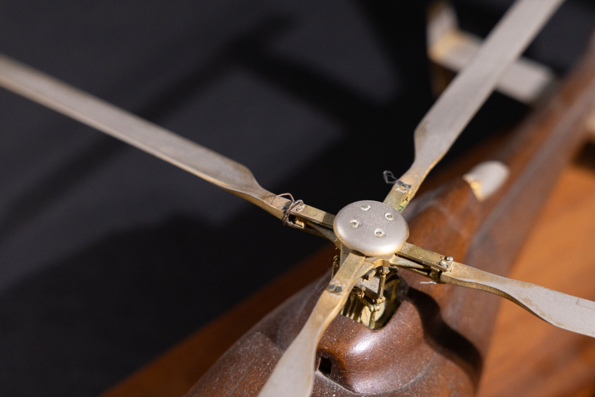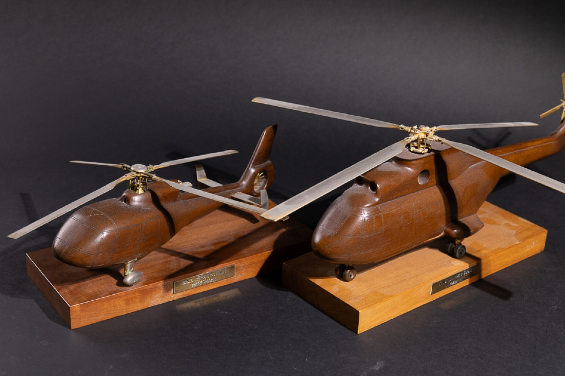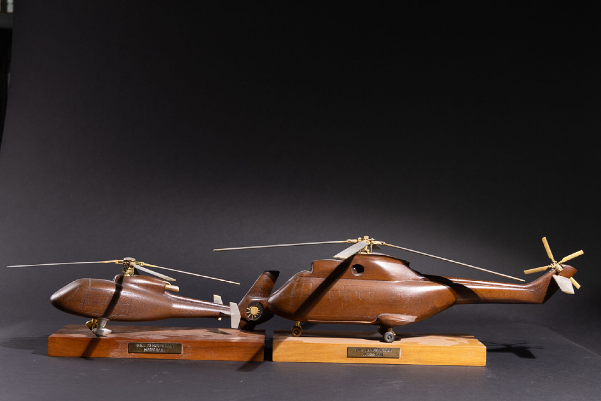 Deux modèles réduits en bois et métal figurant une gazelle et un puma présentés sur socle et titre SNI aérospatiale Marignane (accidents et manques). Long. : 40 et 50 cm