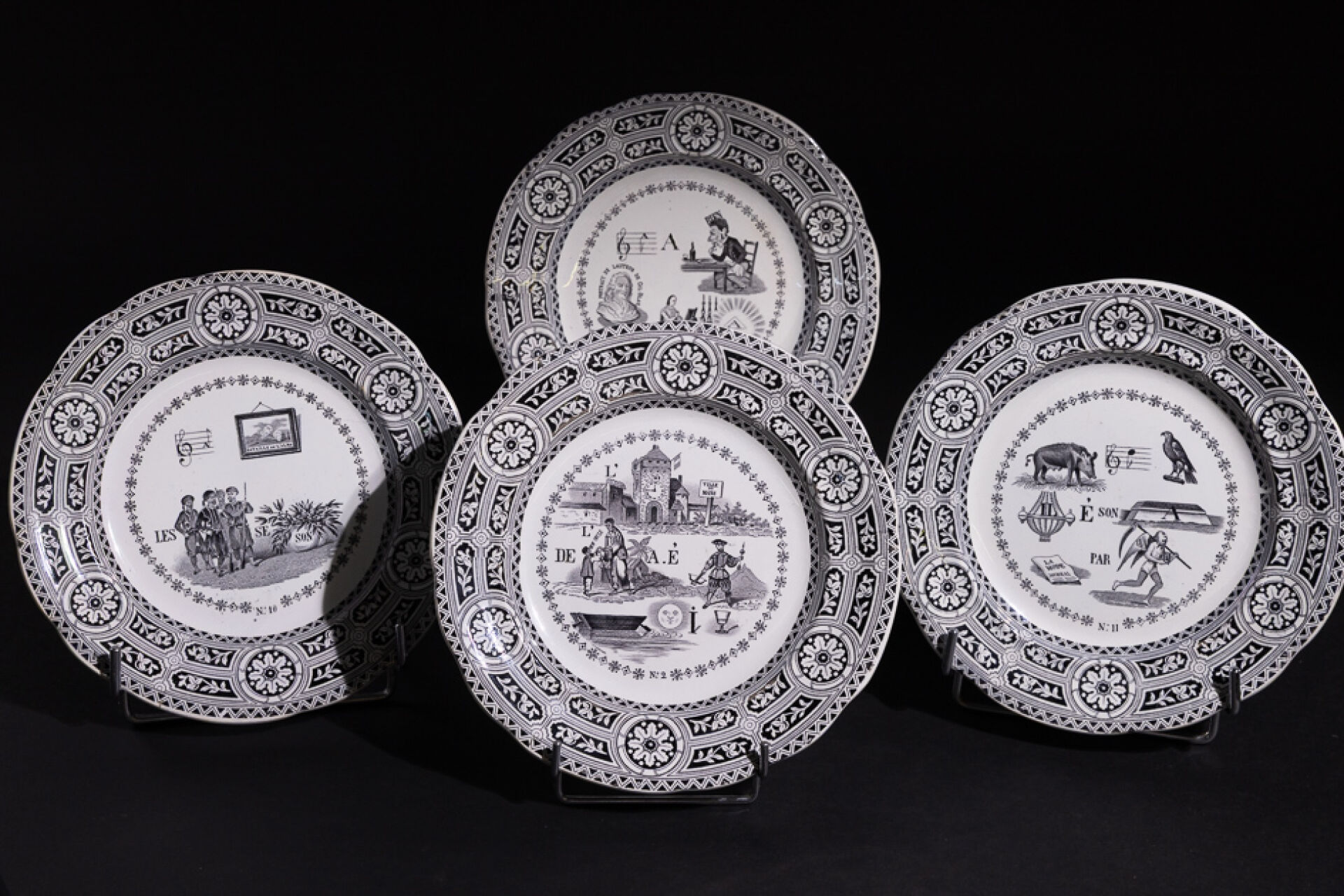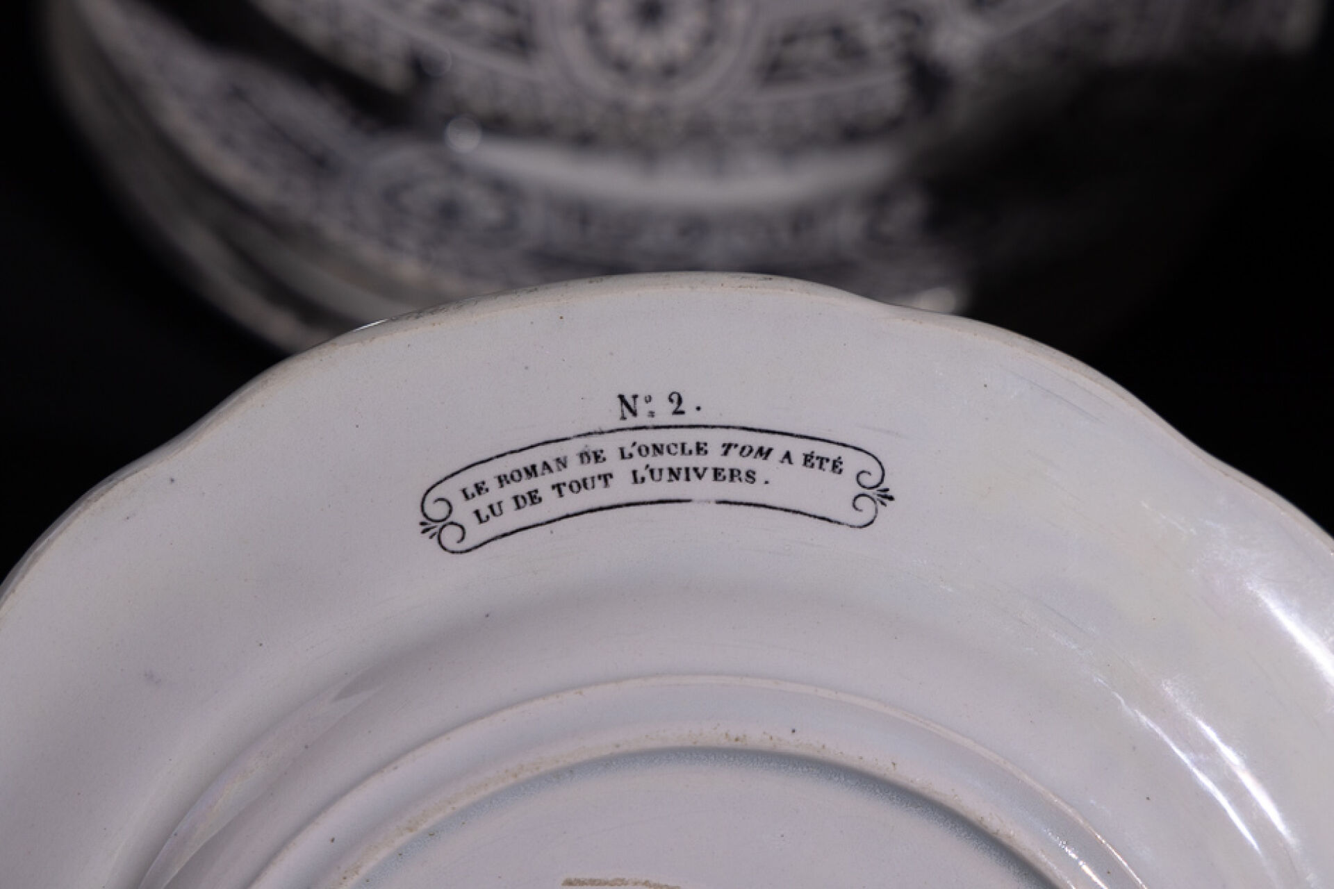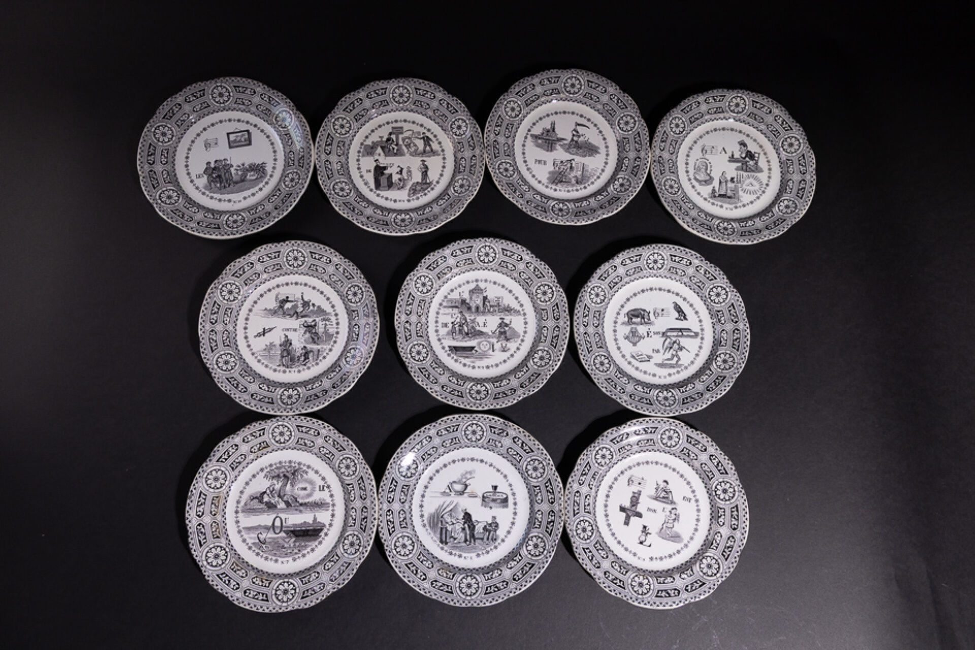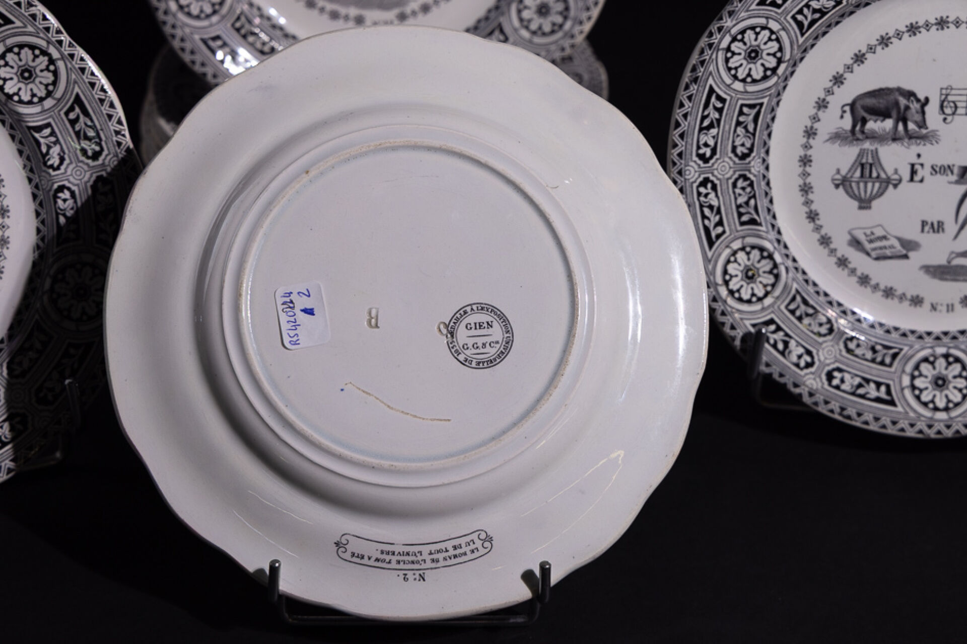 Manufacture de GIEN. Suite de dix assiettes charade en faïence fine à décor en grisaille, le bassin orné du rébus, l'aile à décor géométrique, marque et réponse au revers (manquent assiette 1 et 3). Diam. : 21 cm