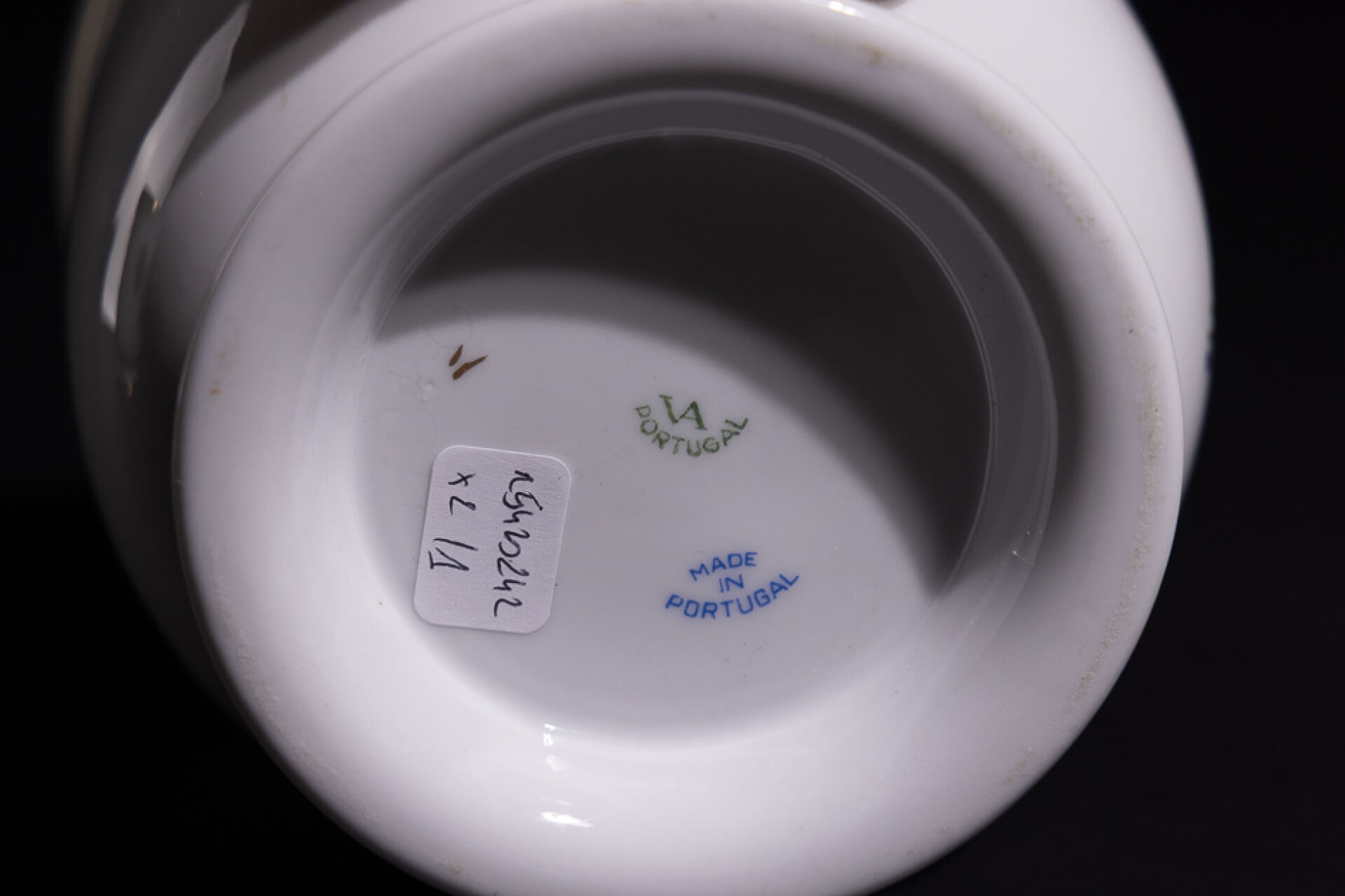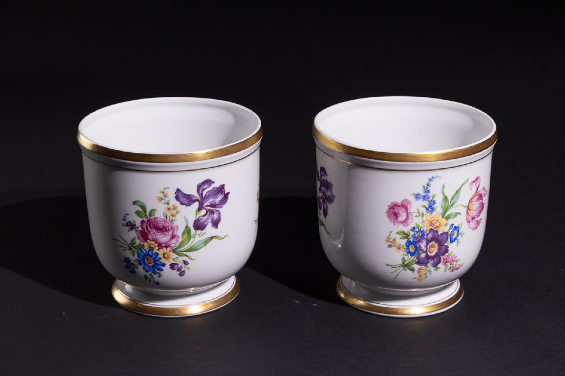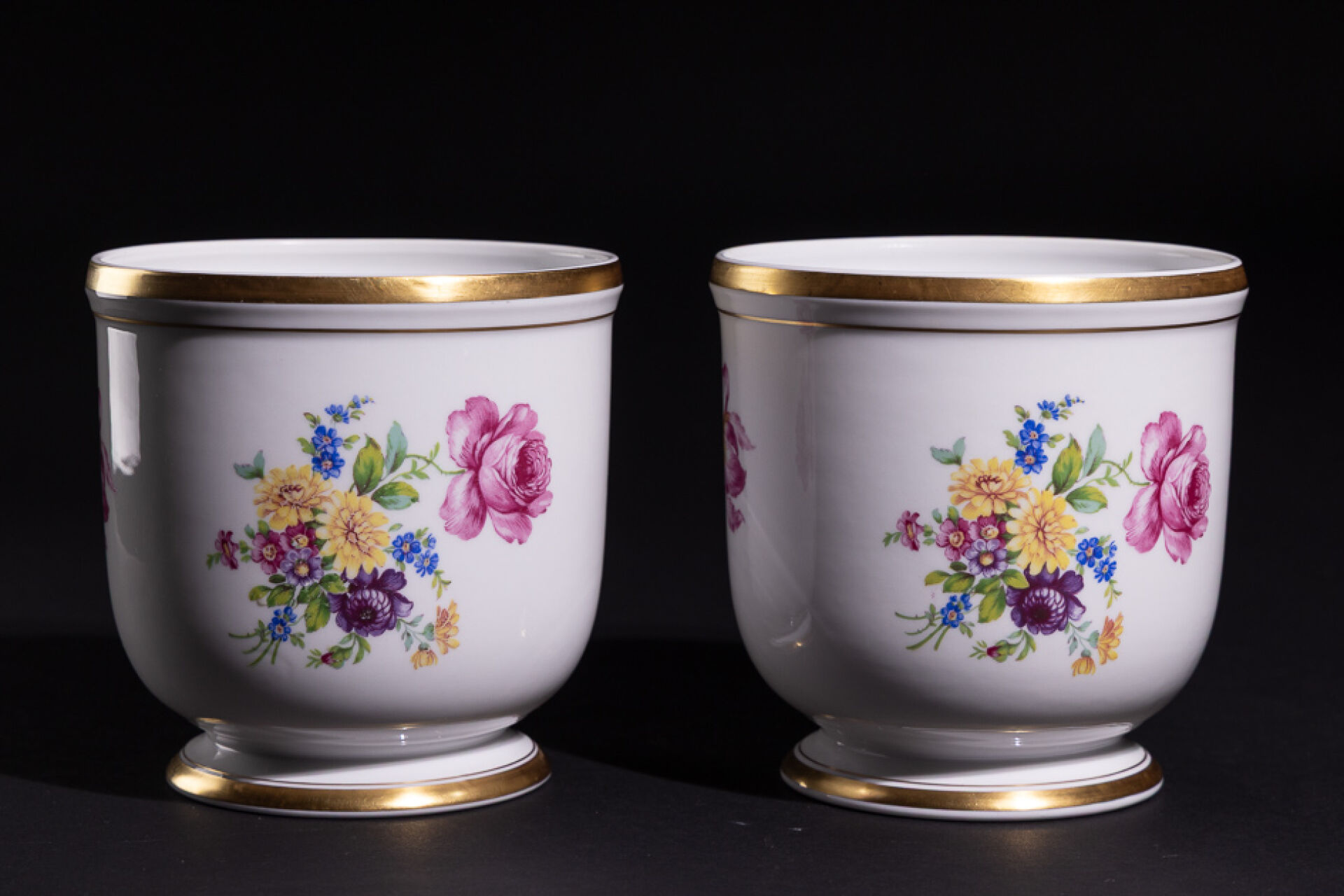 Paire de seaux à bouteille en porcelaine à décor polychrome de fleurs et filets dorés. Marqués au revers. Portugal, XXe siècle. Haut. : 16 cm - Larg. : 15.5 cm