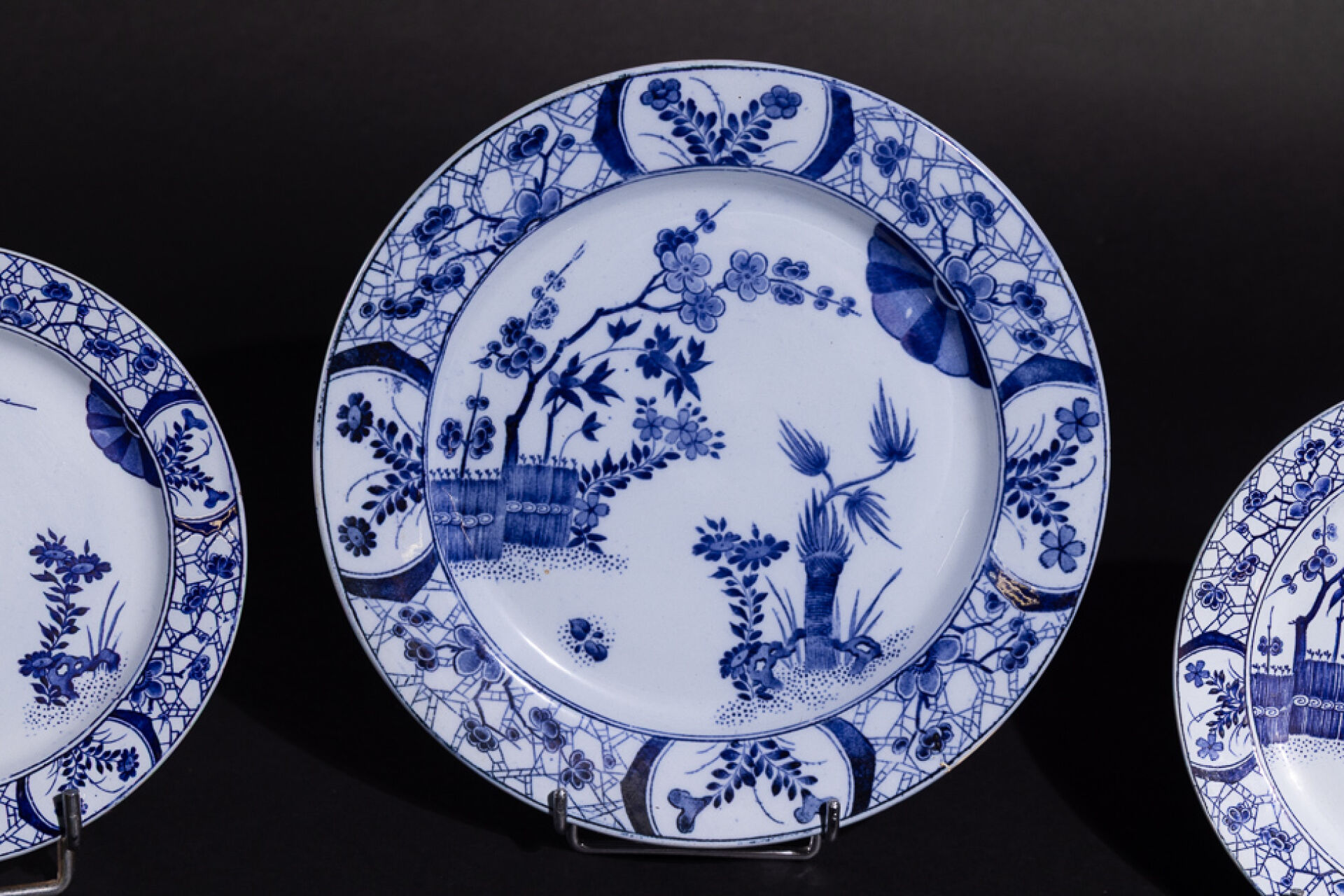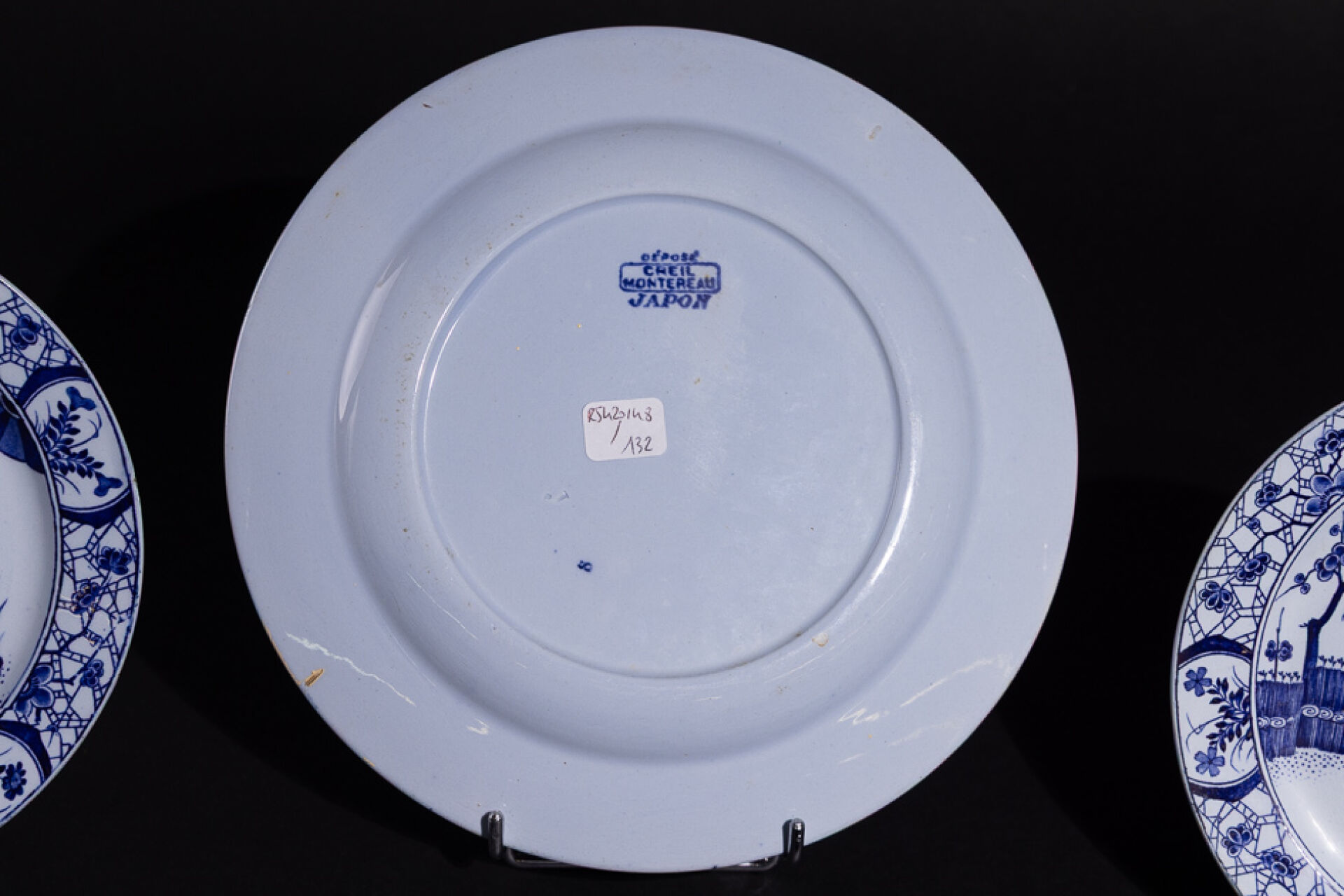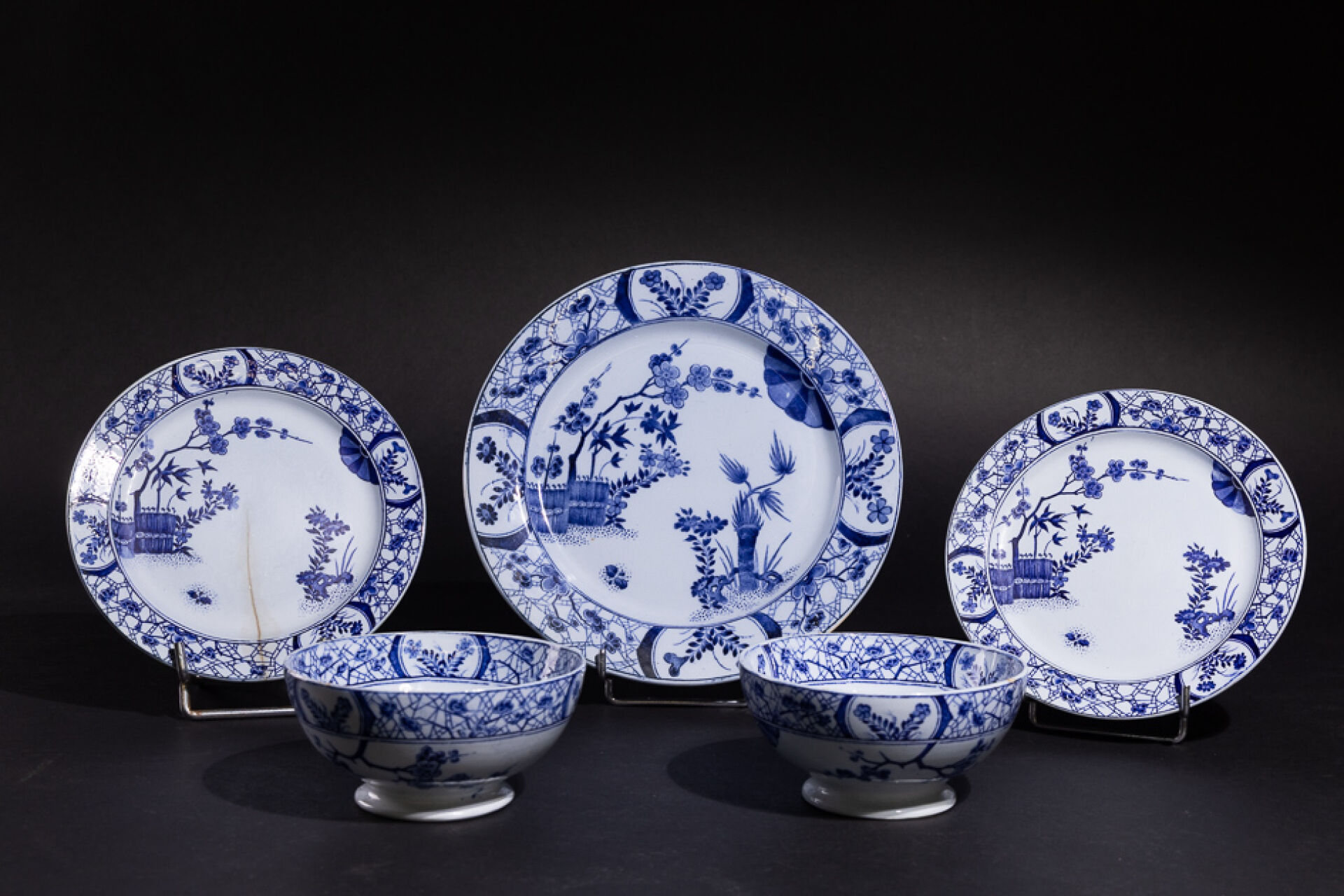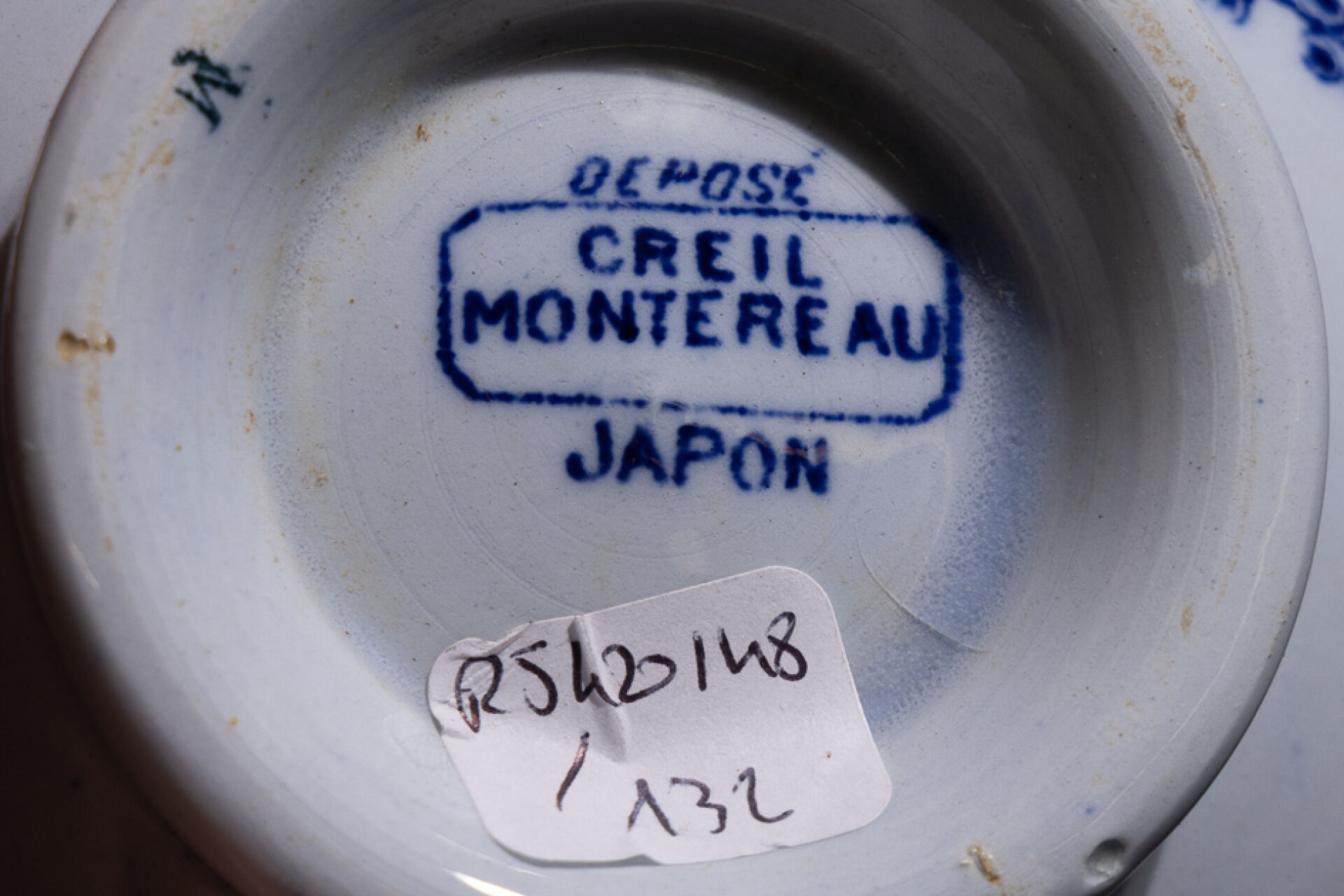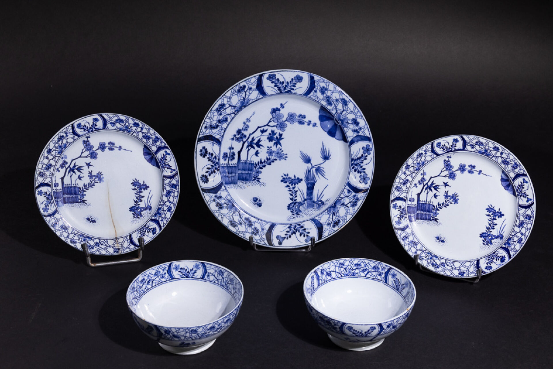 Manufacture CREIL-MONTEREAU. Ensemble de cinq pièces en faïence à décor décalcomanié modèle Japon comprenant : - Deux bols ; - Deux petites assiettes (l'une fêlée) ; - Grande assiette. Marquées au revers.