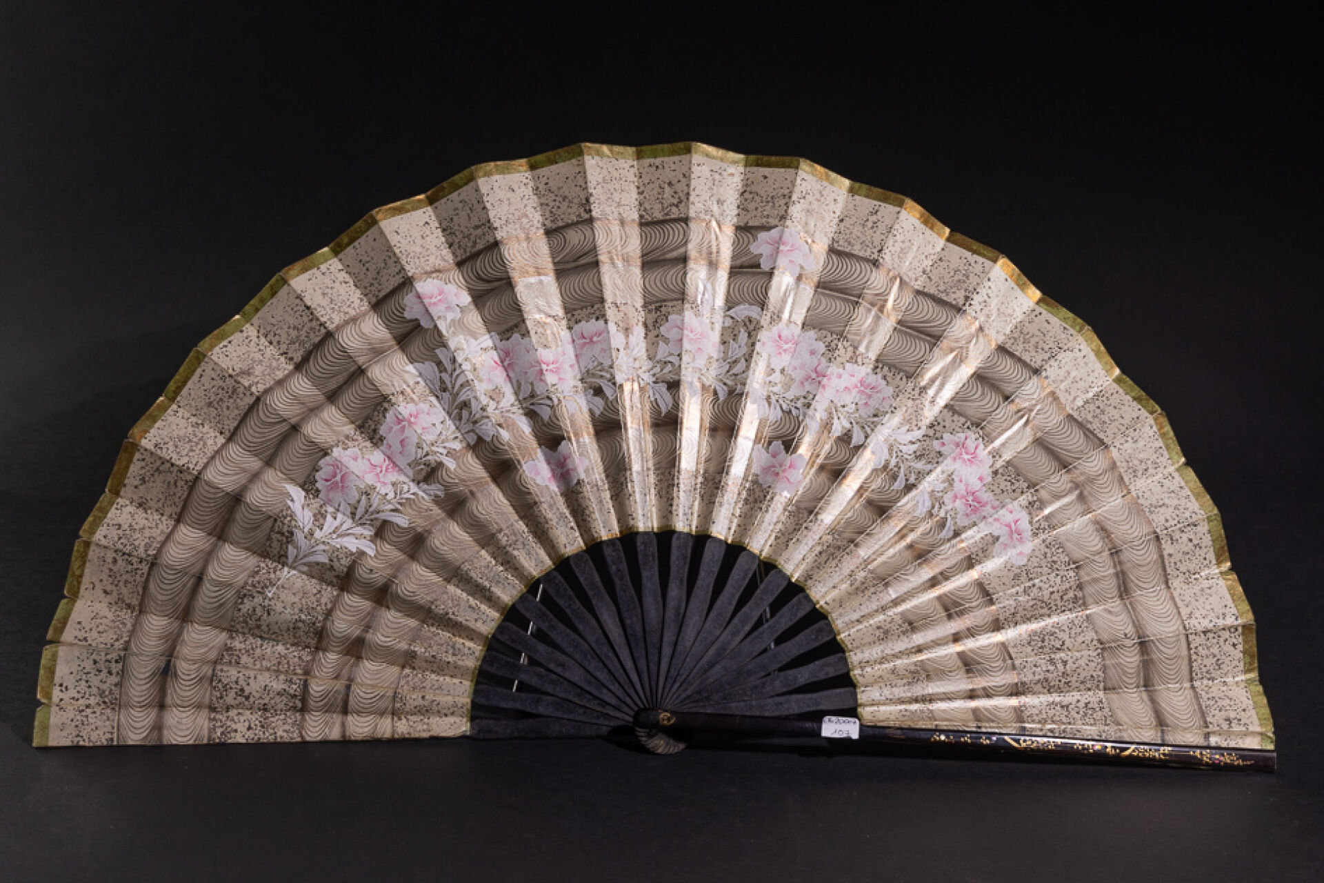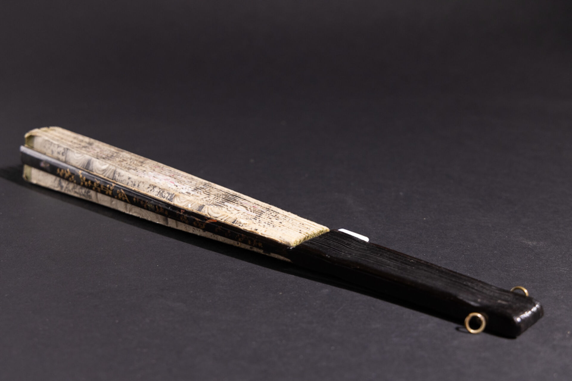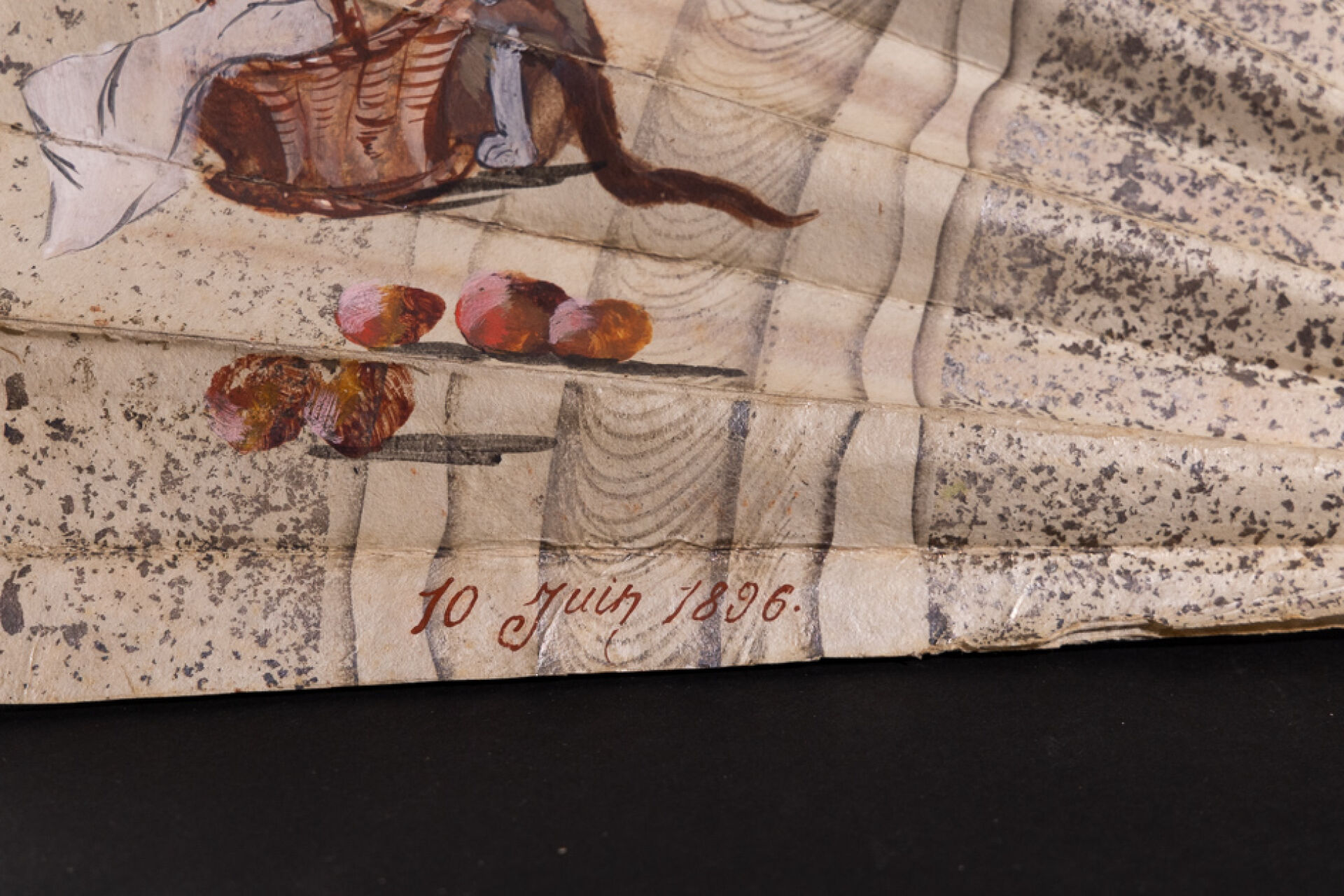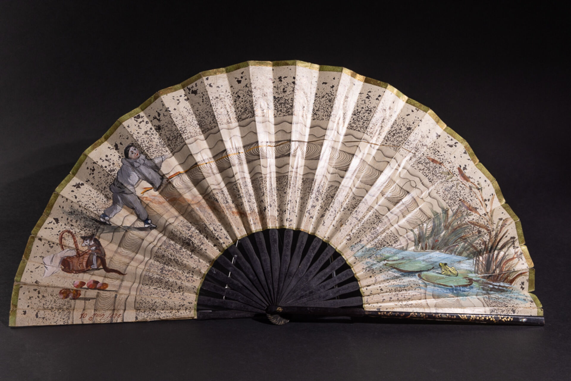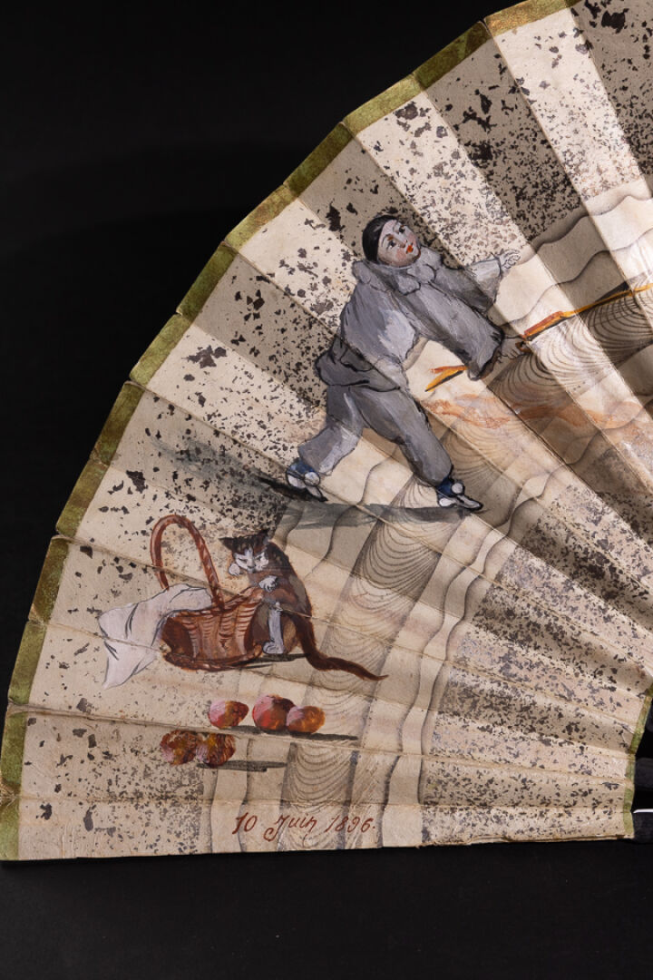 Éventail à la feuille peinte figurant Pierrot chassant la grenouille (manques et petits accidents) daté 10 juin 1896. Fin du XIXe siècle. Long. : 39.5 cm