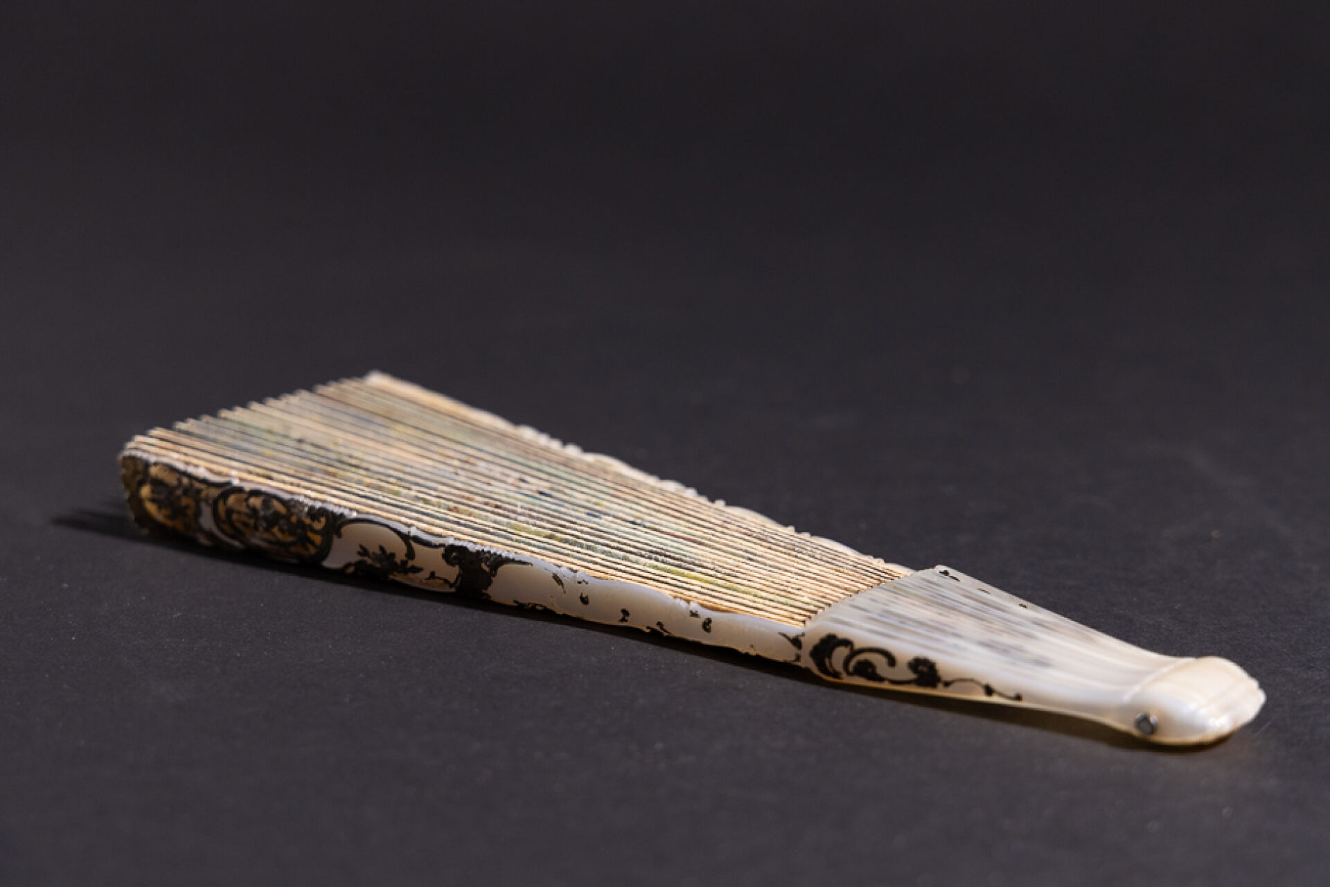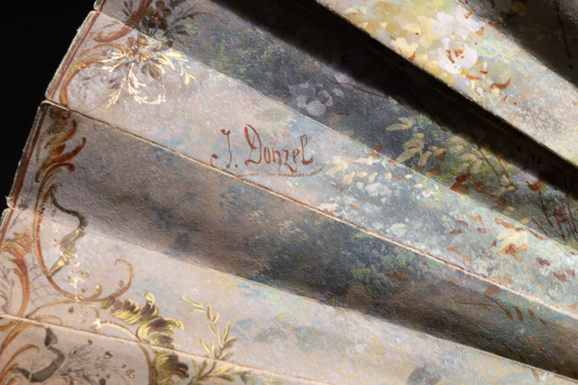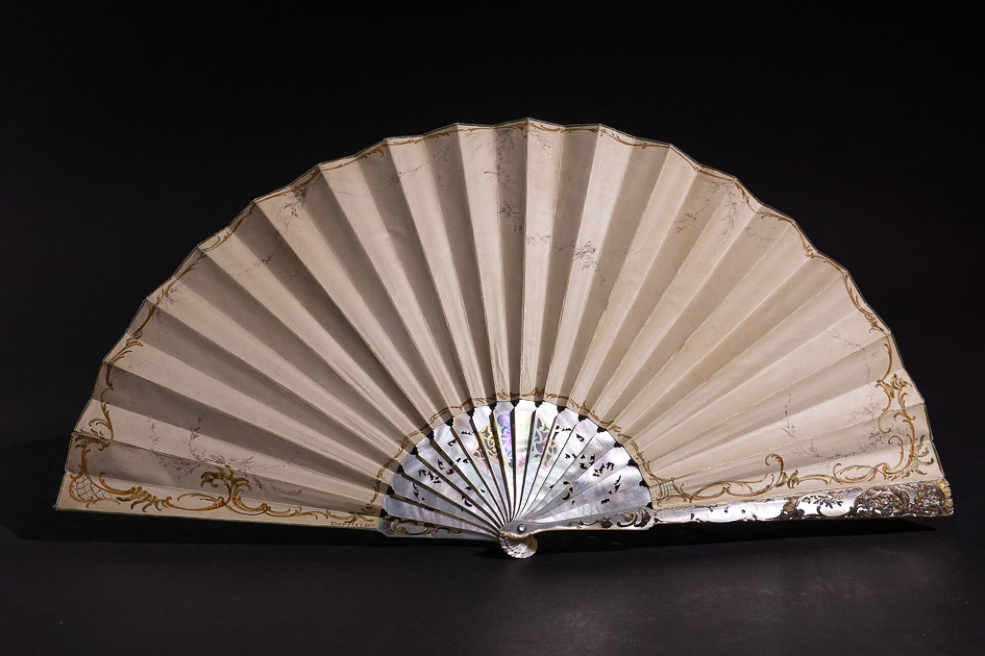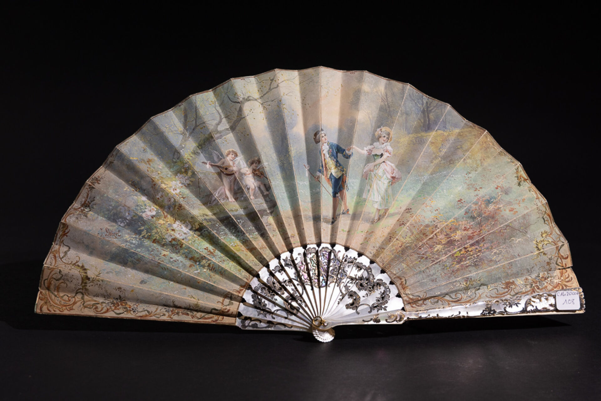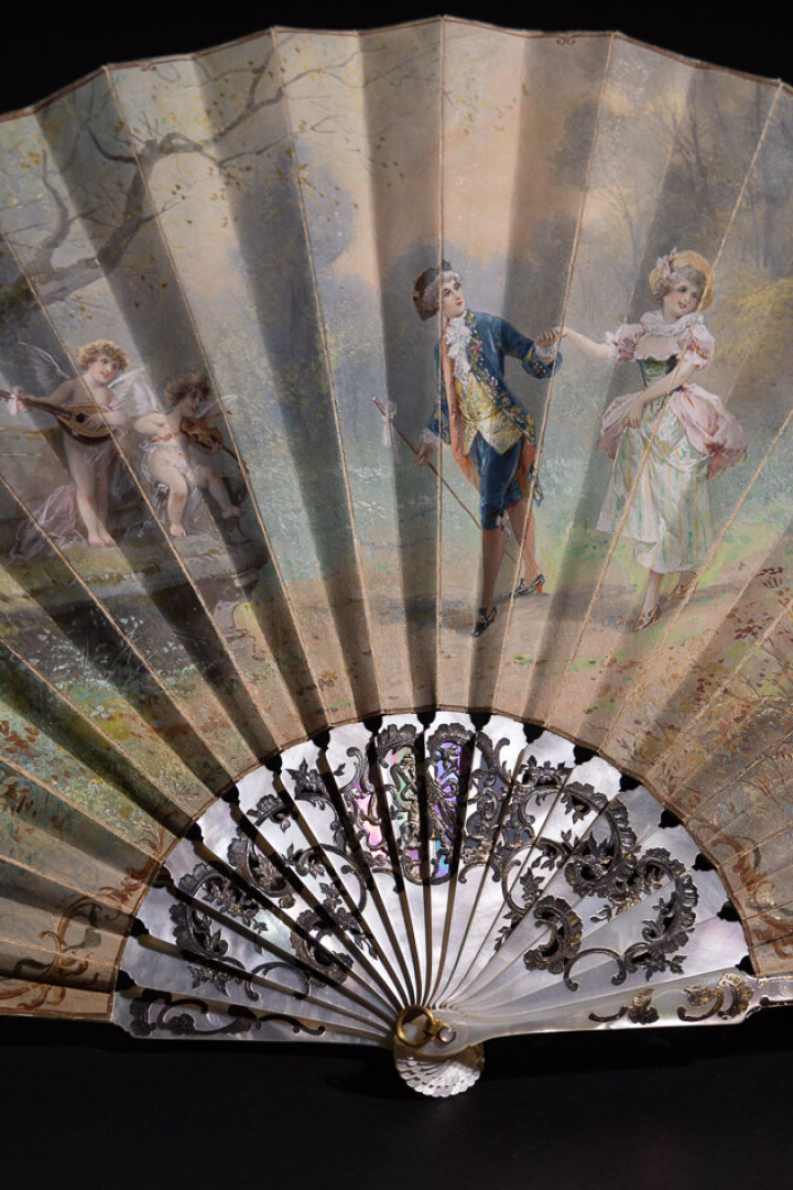 Éventail à dix-huit brins de nacre à réhauts de motifs rocailles, la feuille peinte d'une scène galante aux putti musiciens. Signé Jules-Pierre DONZEL (né en 1832) (petits accidents et petites déchirures). XIXe siècle Long. : 24.5 cm