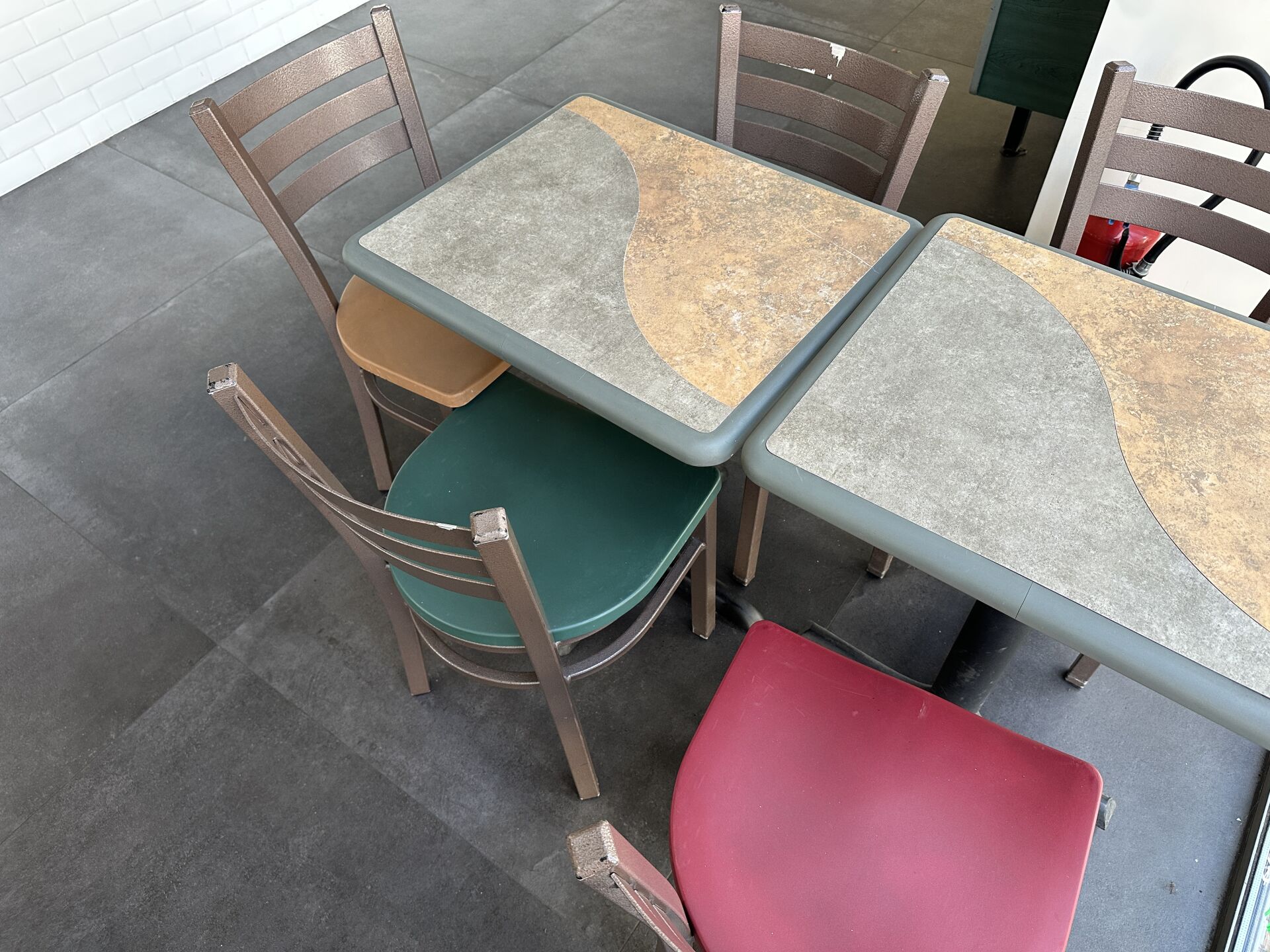 7 tables mélaminé (50 x 60 cm), piètement métal noir 16 chaises métal, assise verte , bordeaux ou camel 1 double banquette avec table intégrée mélaminé vert (100 x 62 cm),