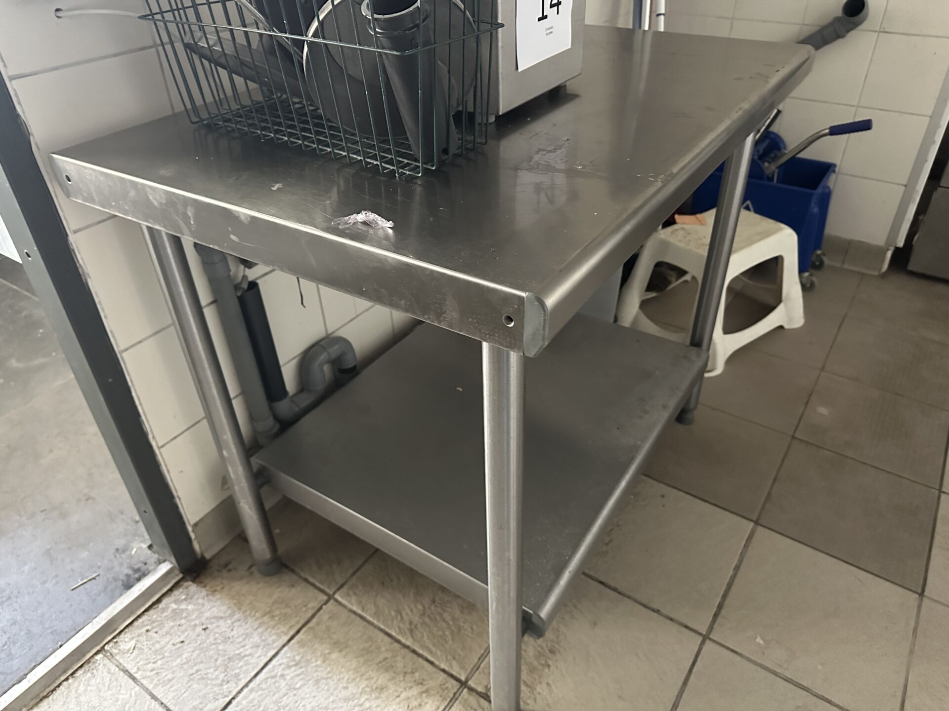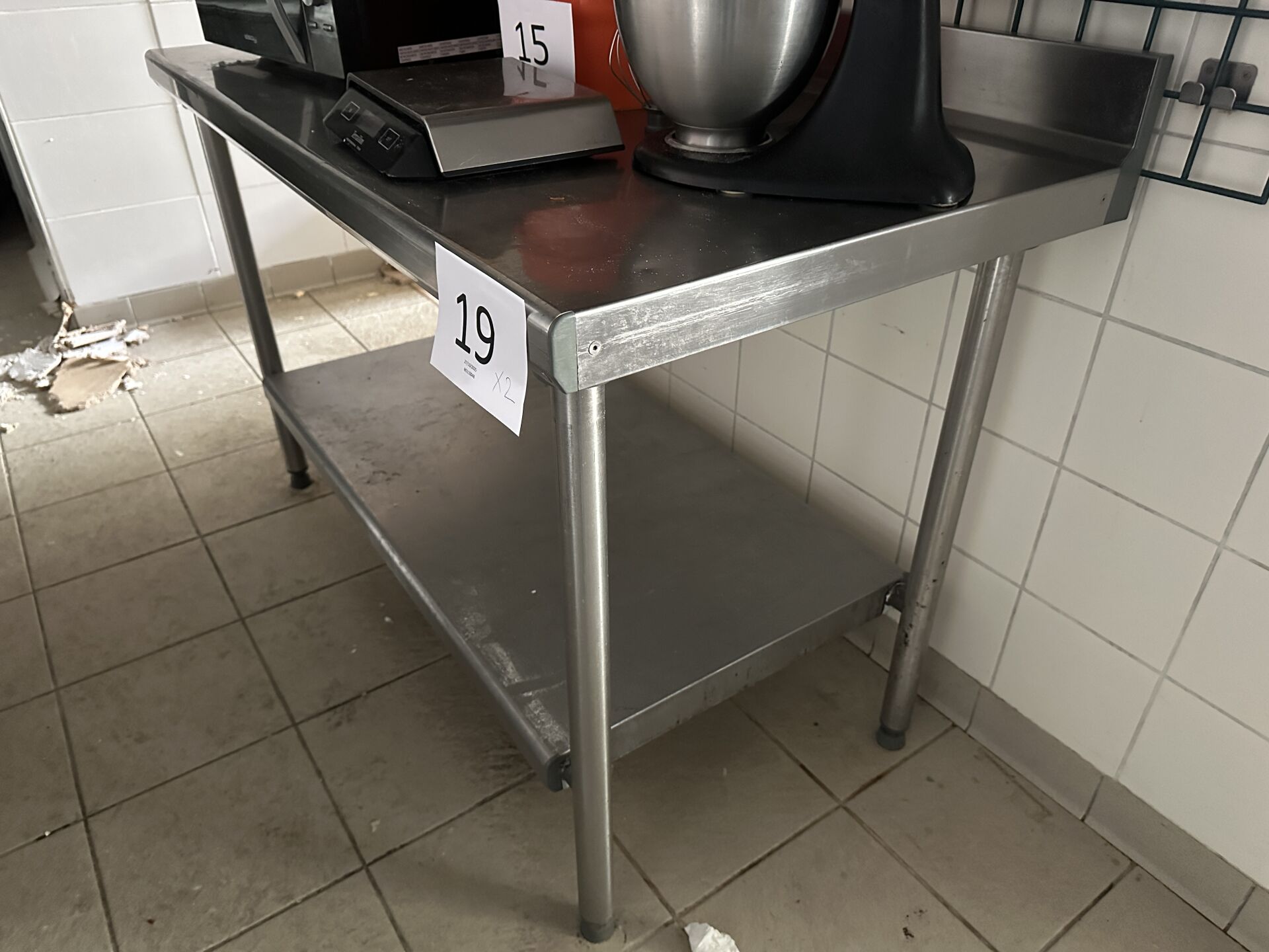 1 table inox avec plateau d'entrejambe (1000 x 700), 1 table inox avec plateau d'entre-jambes et dosseret (1400 x 700),