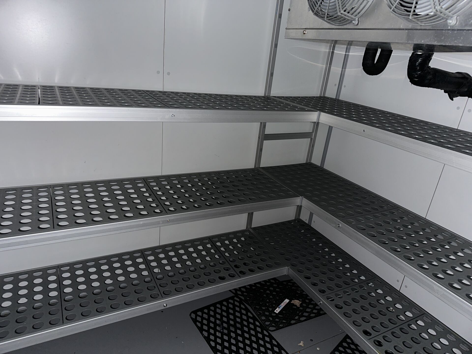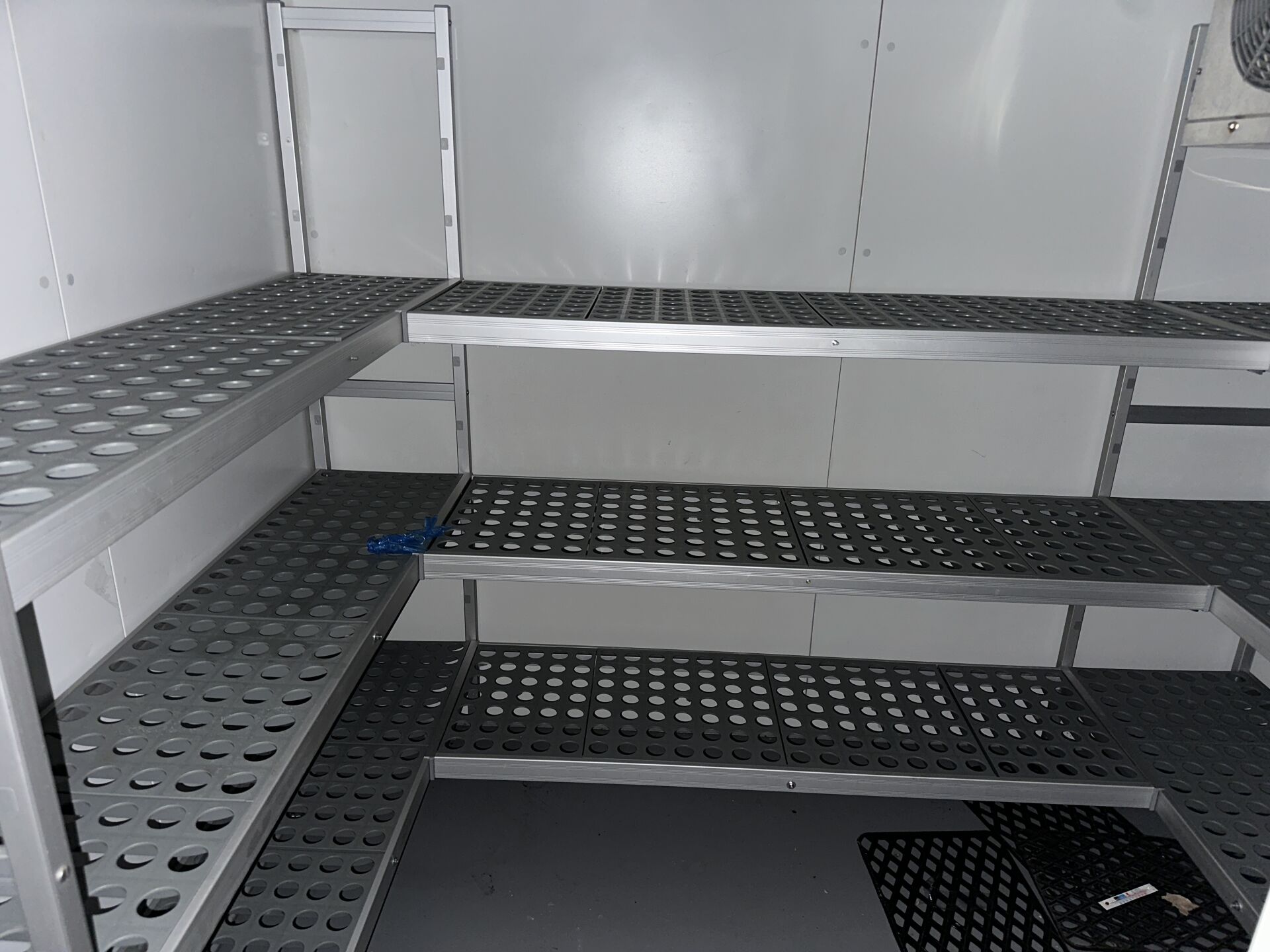 5 étagères : 2 en 150, 1 en U 226 x 145 cm, aluminium avec plateaux polyéthylène FERMOD P 35 cm, H 169 cm