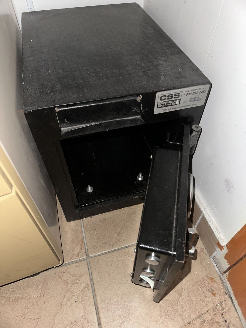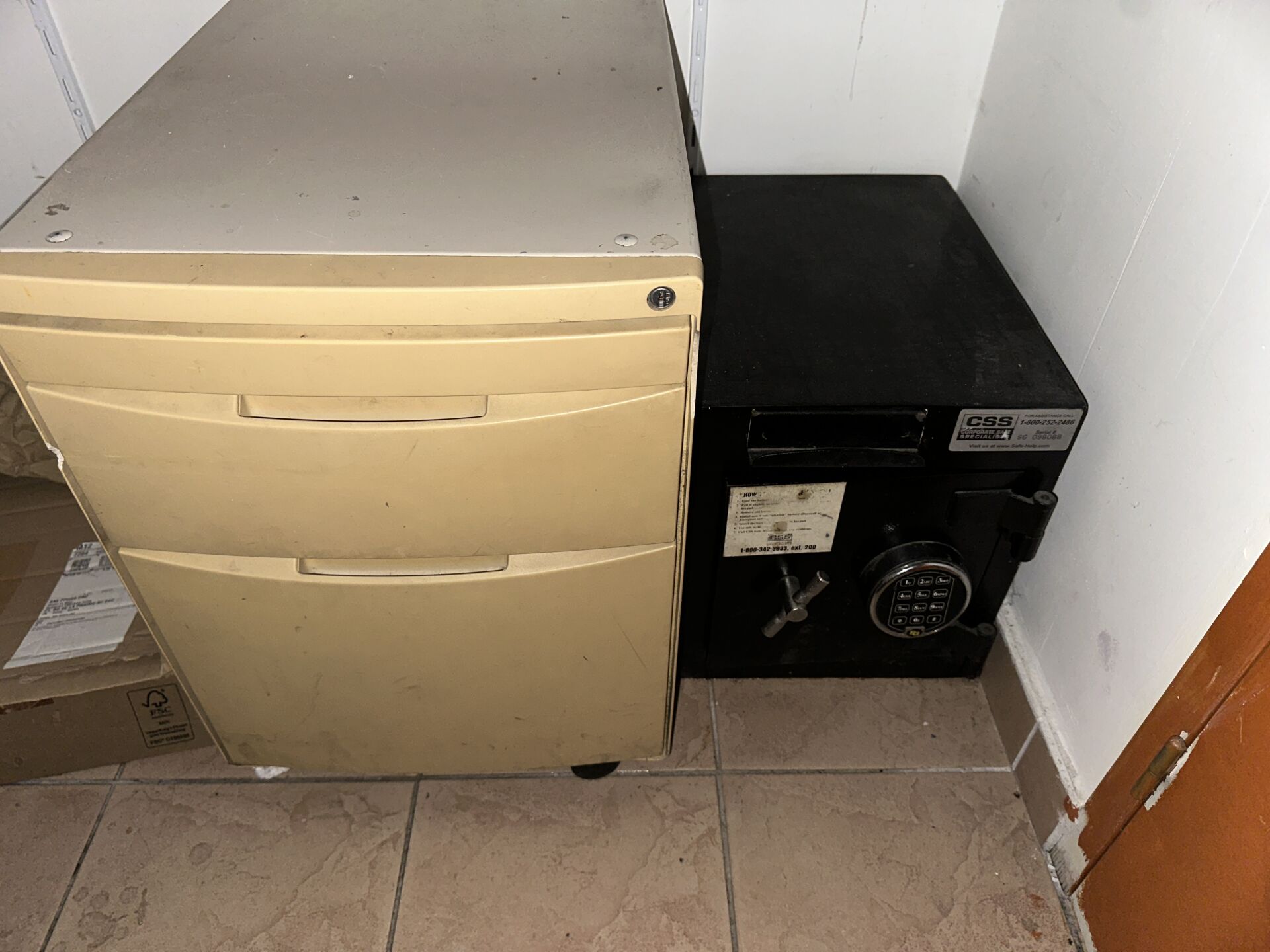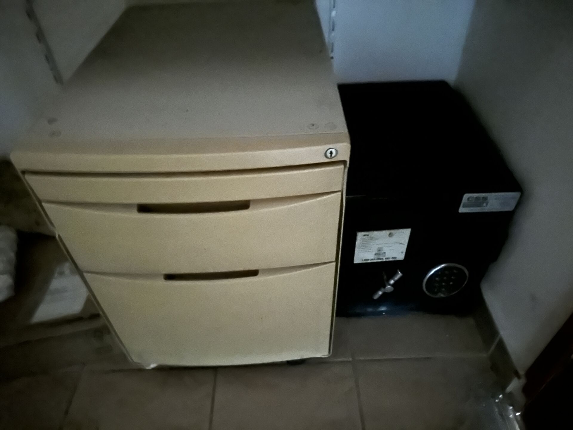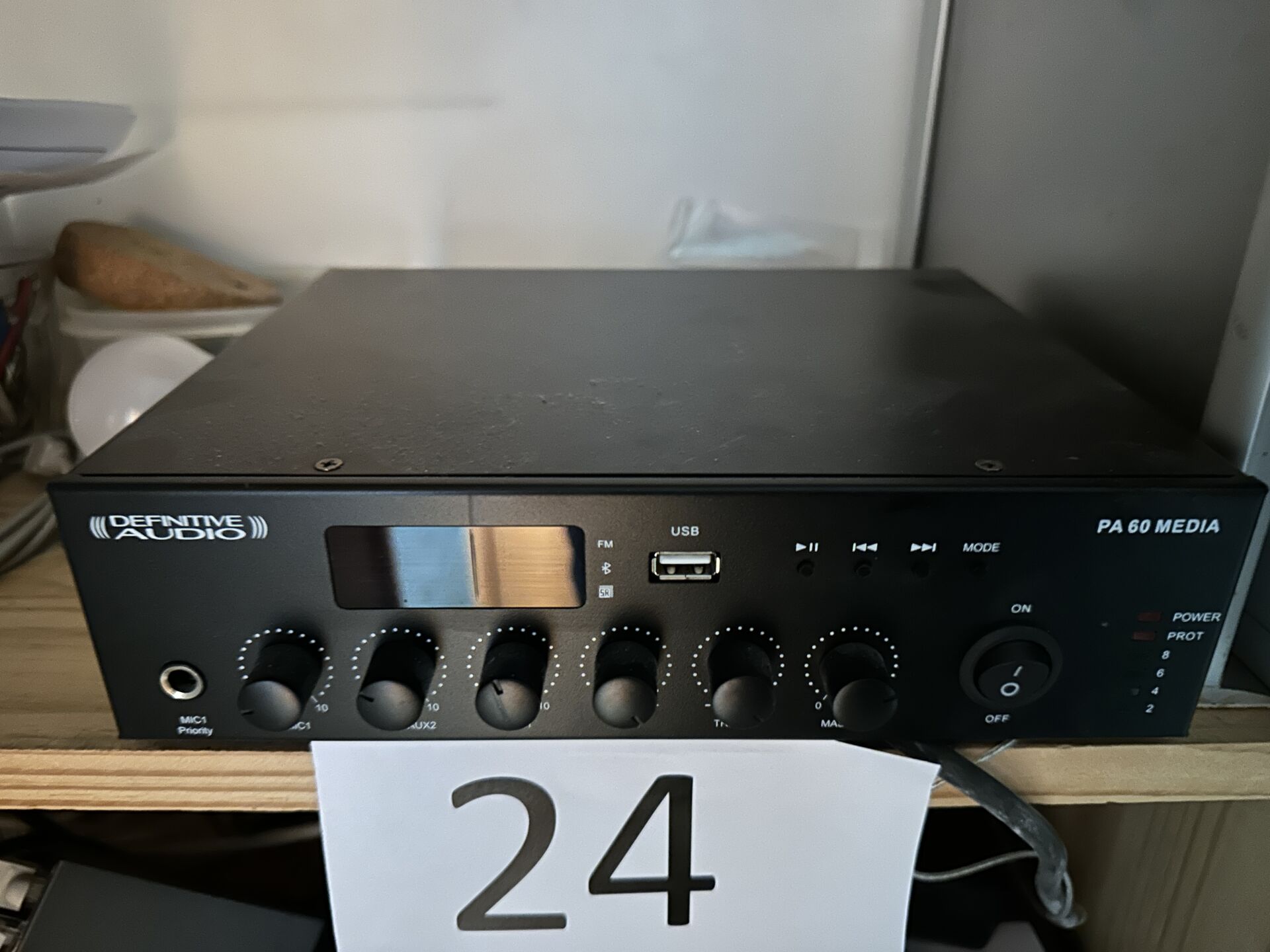 Système HIFI comprenant : - 1 amplificateur DEFINITIVE AUDIO PA 60 Media, 2 tableaux liège (120 x 90cm), 1 tableau mélaminé blanc 1 caisson métal 3 tiroirs, 1 coffre-fort CSS 33 X 48 X 38 cm