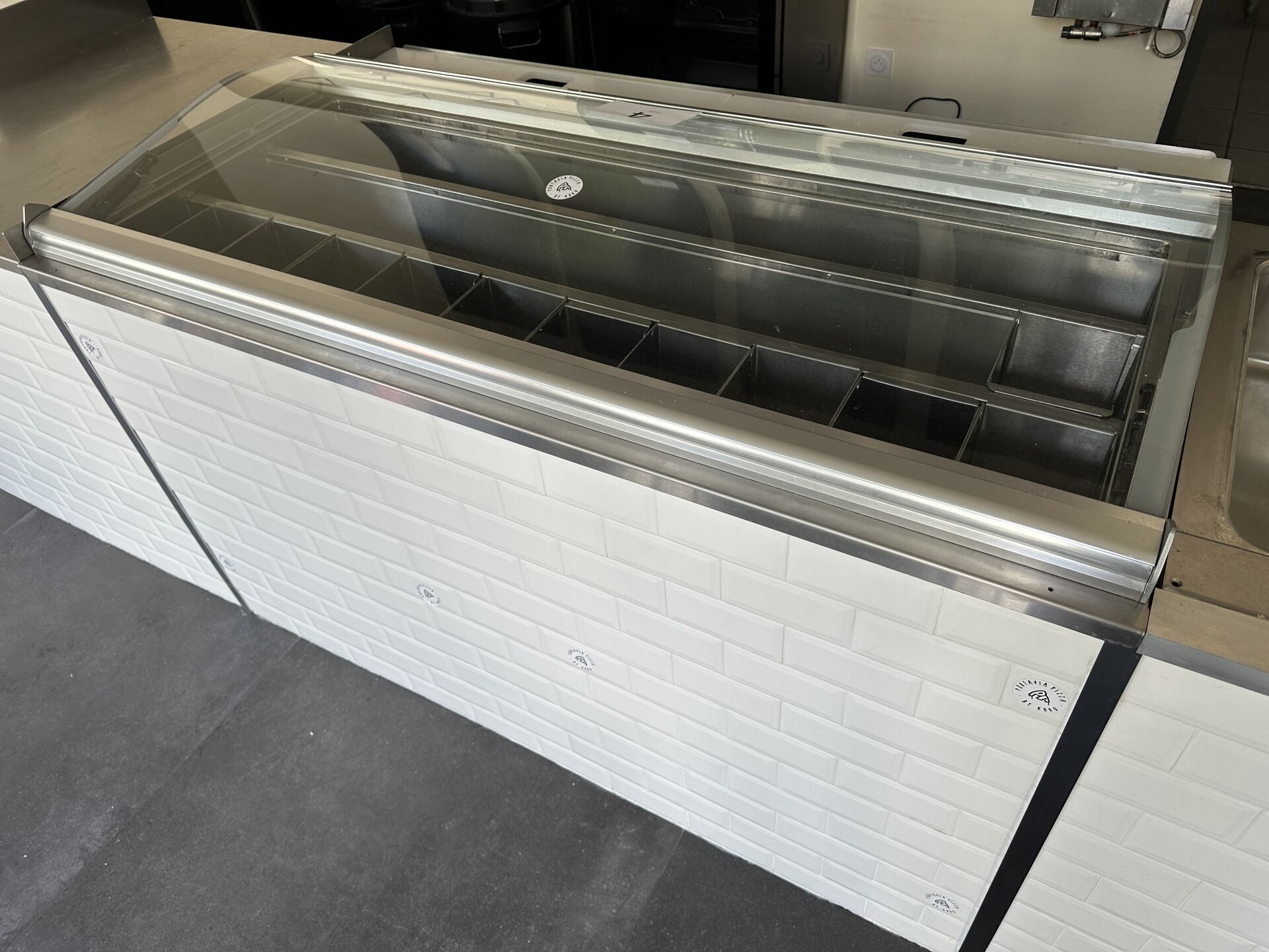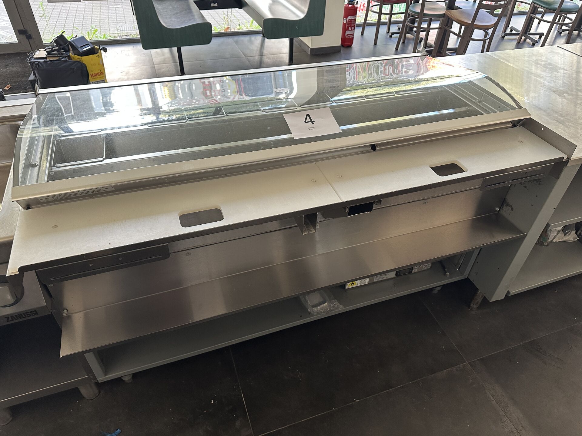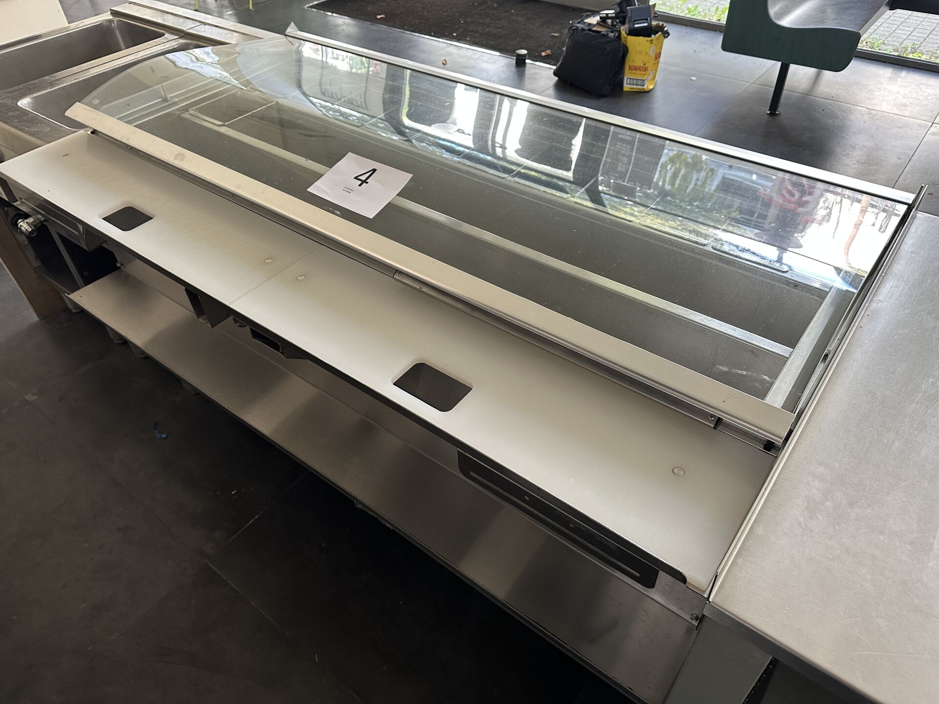 1 saladette DUKE plaque inaccessible (150 x 86 cm) porte vitrée sur le dessous, plaques téflon et étagères intégrées NOTE : l'enlèvement nécessitera le démontage de l'habillage