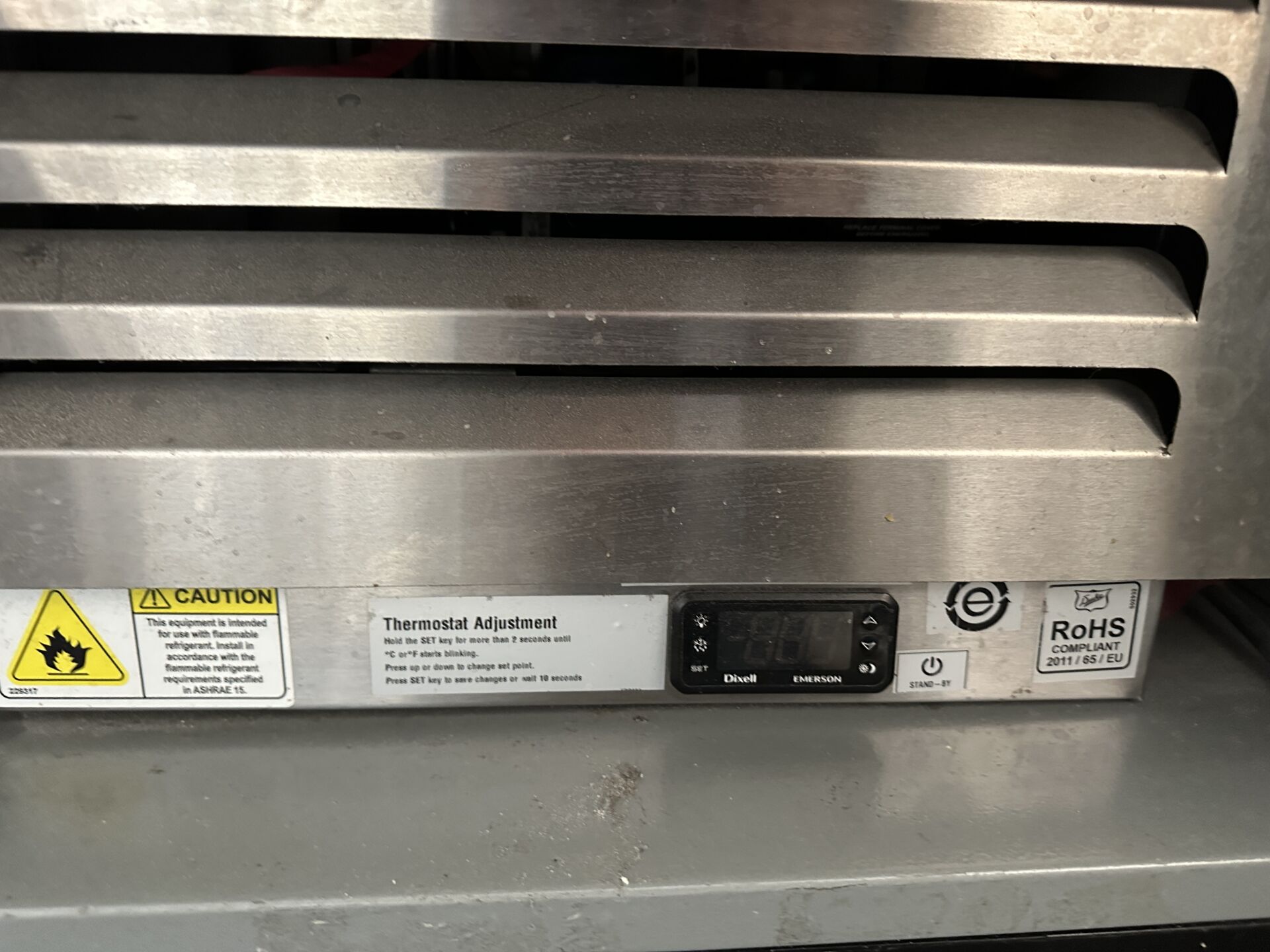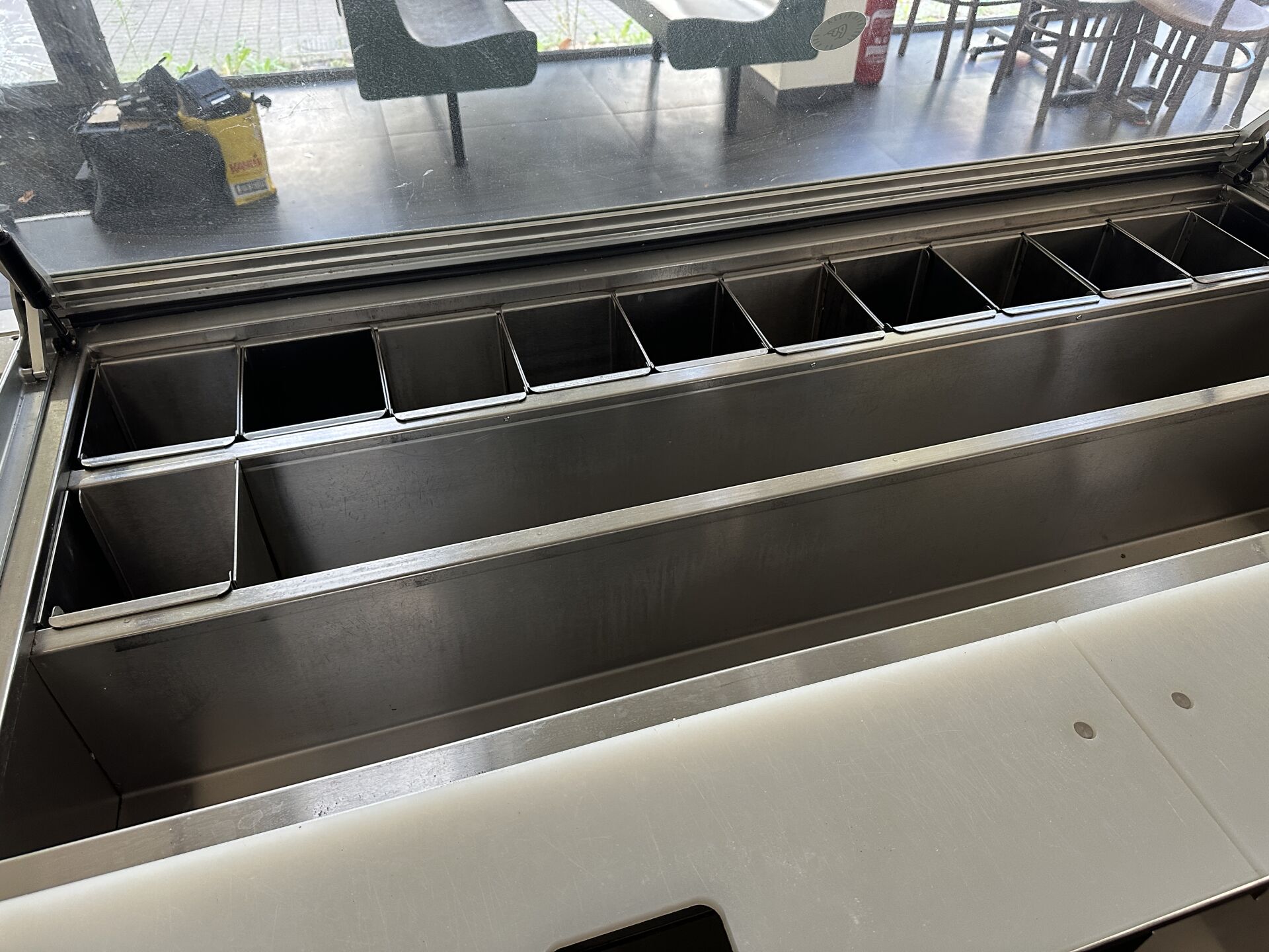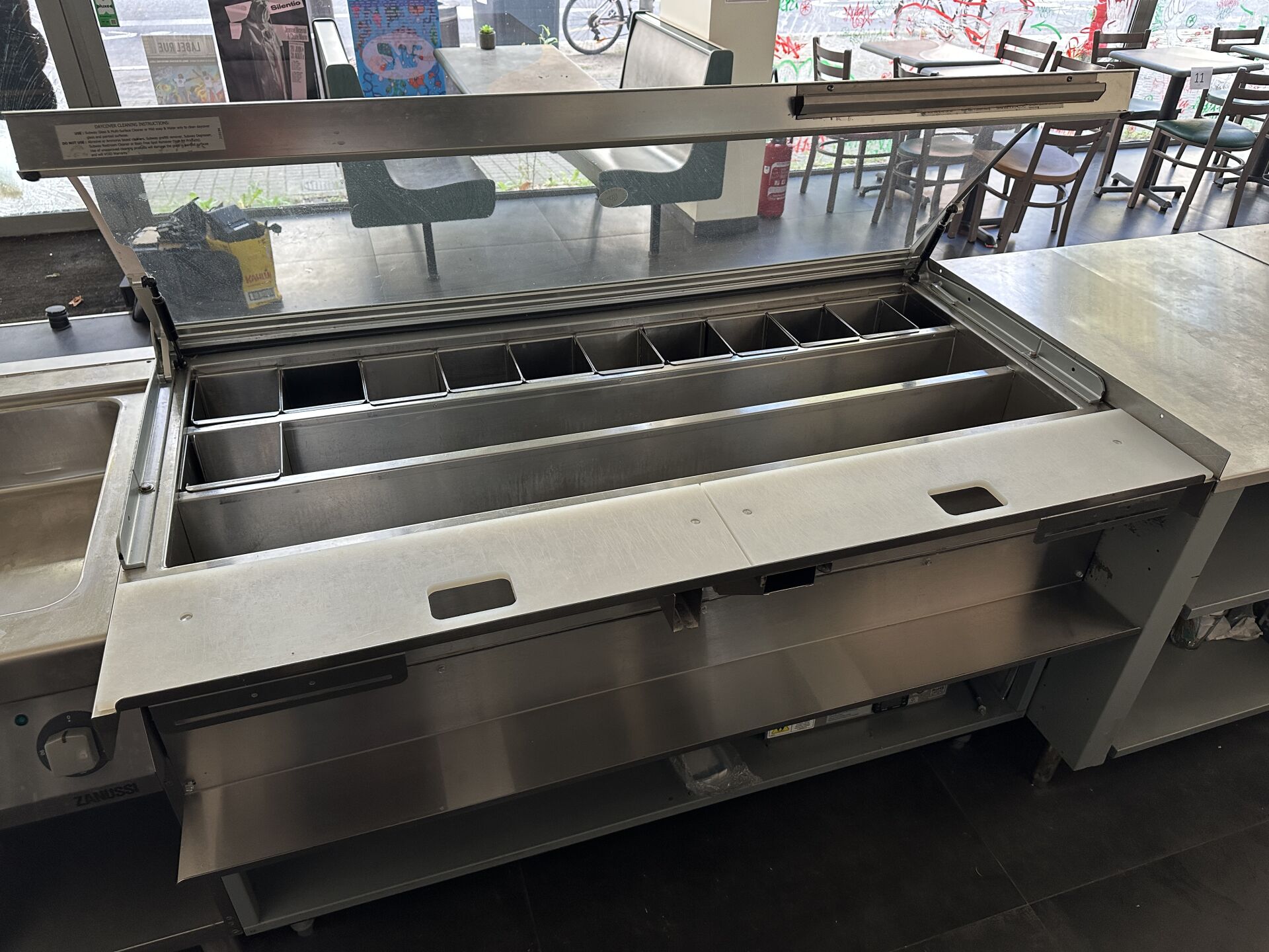 1 saladette DUKE plaque inaccessible (150 x 86 cm) porte vitrée sur le dessous, plaques téflon et étagères intégrées NOTE : l'enlèvement nécessitera le démontage de l'habillage