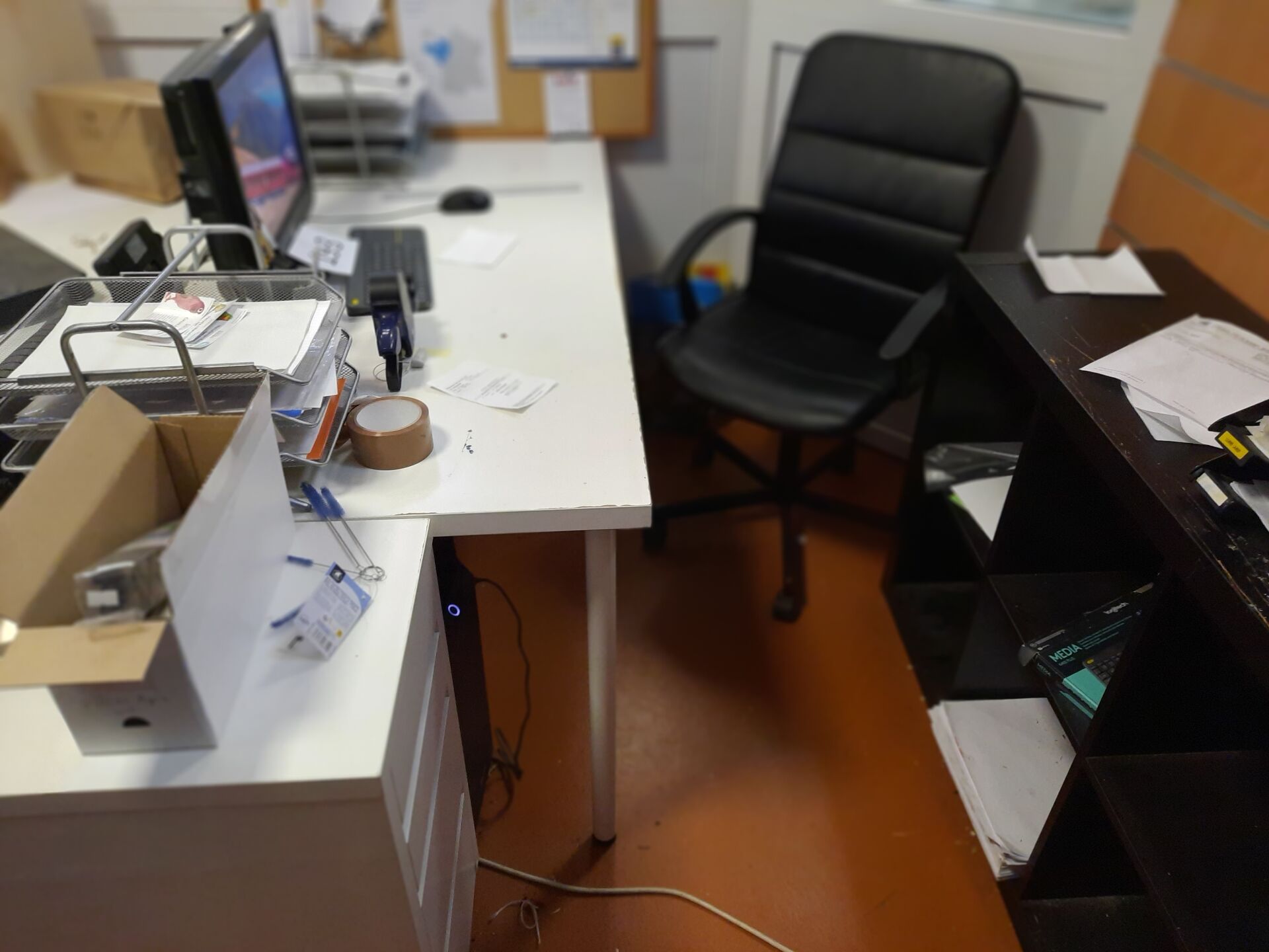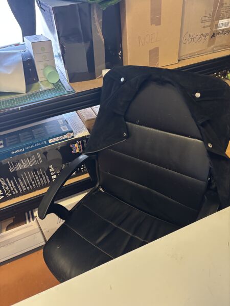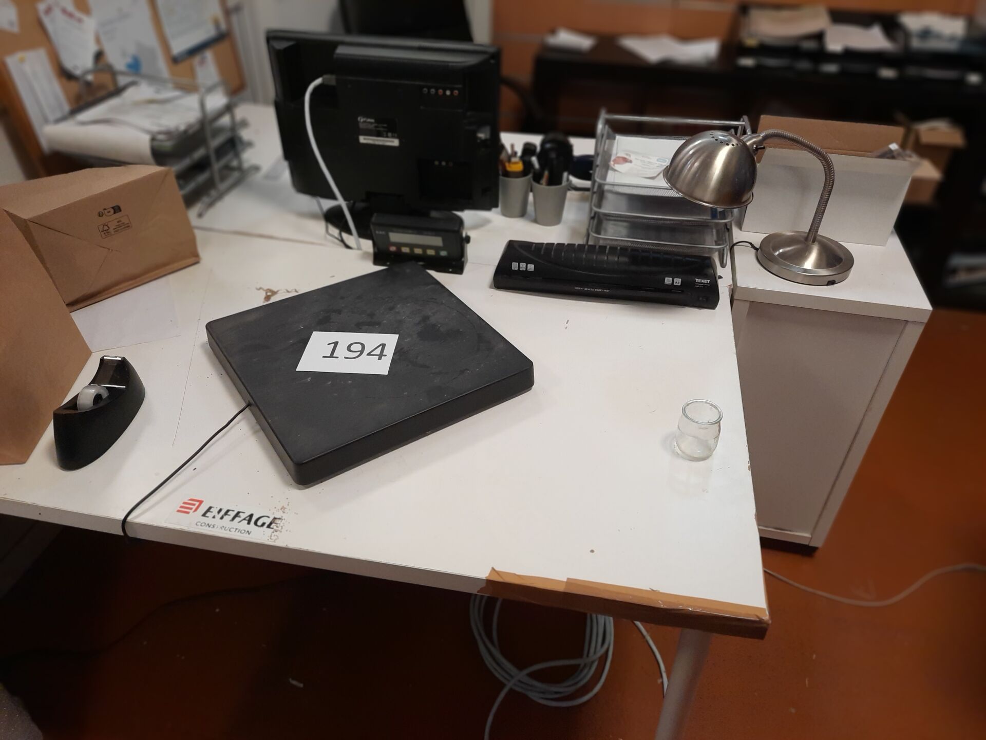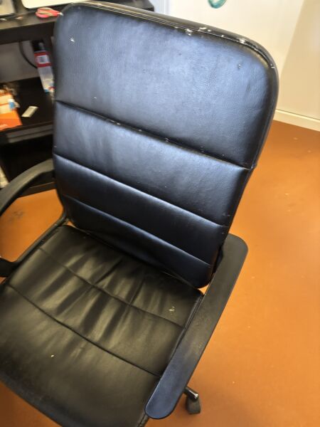 3 tables rectangulaires en mélaminé et métal laqués blanc Caisson mobile à 4 tiroirs (Mauvais état) 4 fauteuils dactylo, assise en simili cuir noir