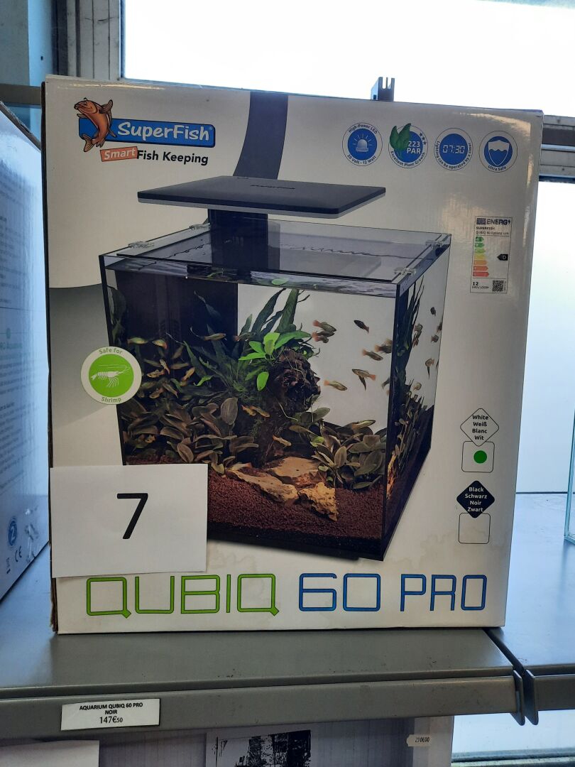 Aquarium SuperFish QUBIQ 60 PRO avec LED et filtre. Blanc, en carton, prix magasin 147€