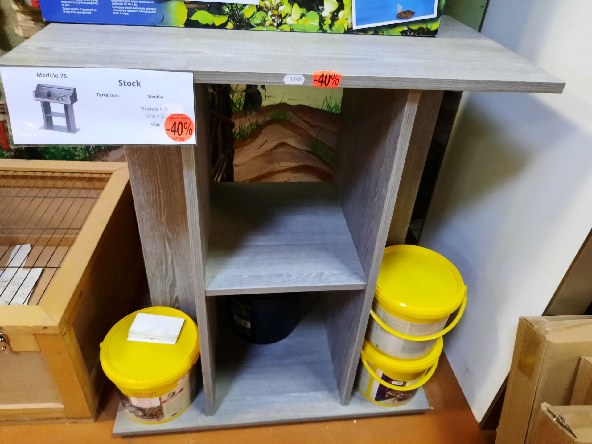 2 meubles pour terrarium, dont mélaminé noir 100x30x67 et mélaminé effet bois 70*41*80, prix magasin 199€
