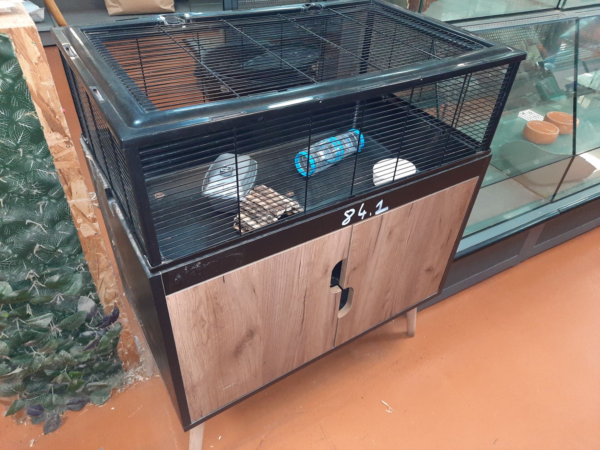 Cage pour rongeur avec meuble intégré en mélaminé façon bois et noir ouvrant à 2 vantaux, piètement compas 78*48*99 (état d'usage)