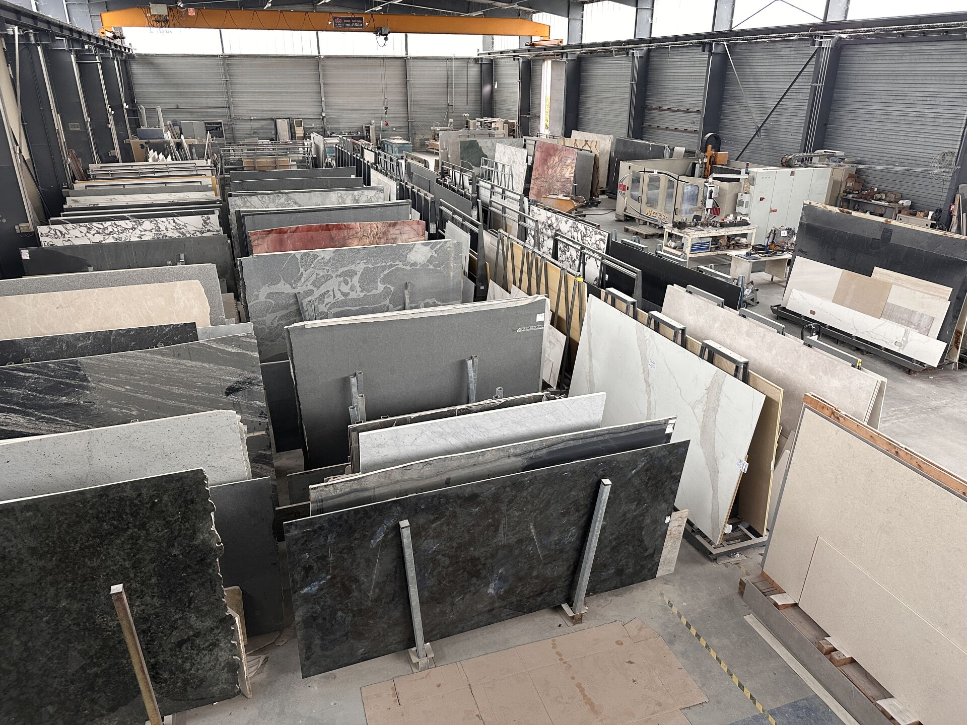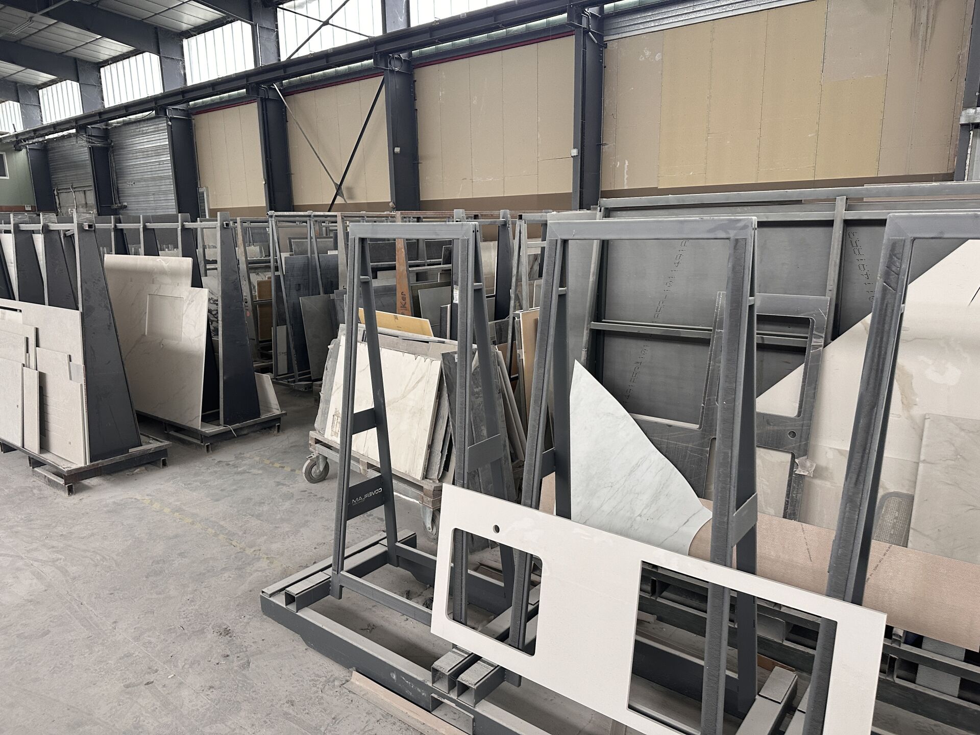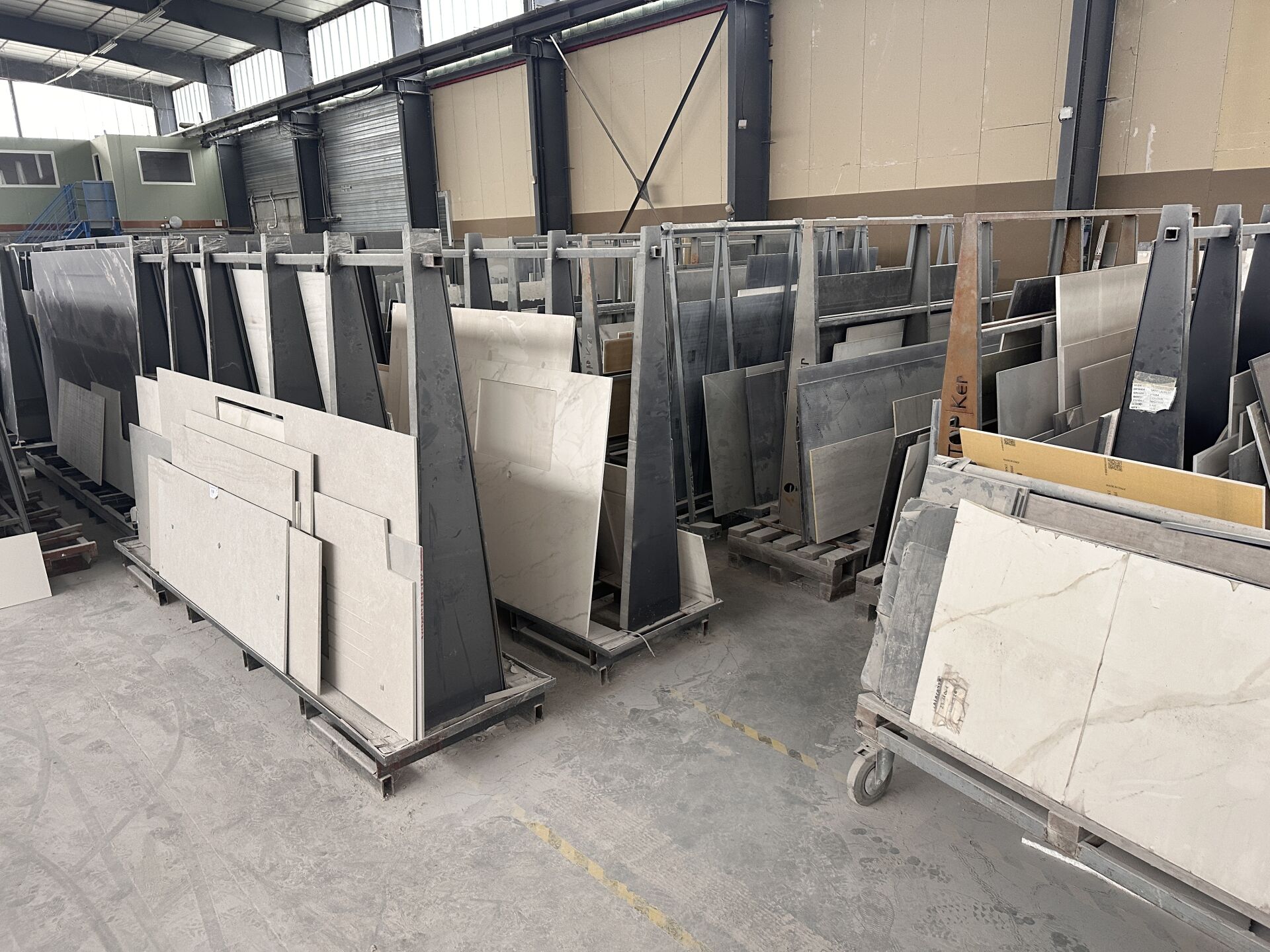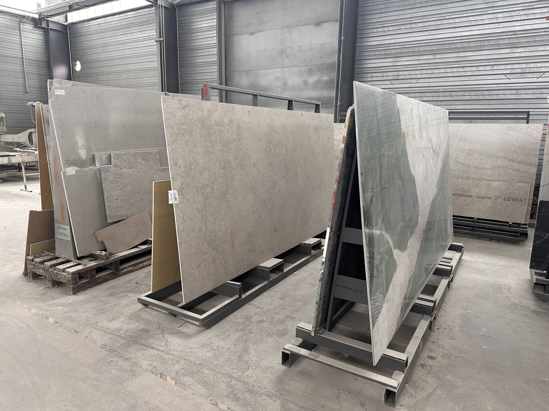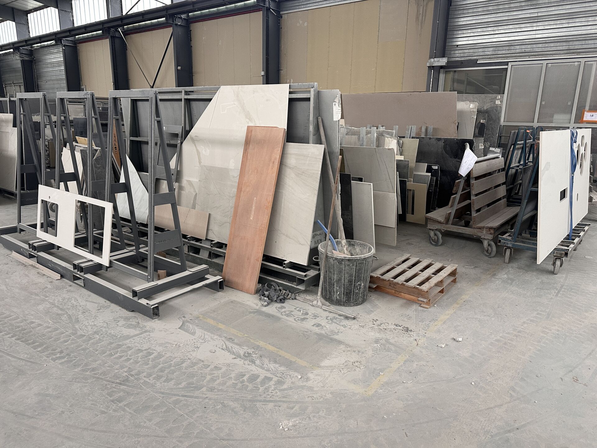 Environ 45 chevalets métal double face dont INALCO, TAS, Ensemble de barres métalliques formant râtelier sur environ 25 mètres linéaires Dans l'atelier : Stock d'environ 92 tranches de granit, marbres, pierres ou composites, céramique de différentes finitions et dimensions, de 12, 20 ou 30mm, Dans les bureaux : Stocks d'échantillons, de petites dimensions, de présentation de pierres, granits et marbres Frais de mise à disposition 100 € TTC