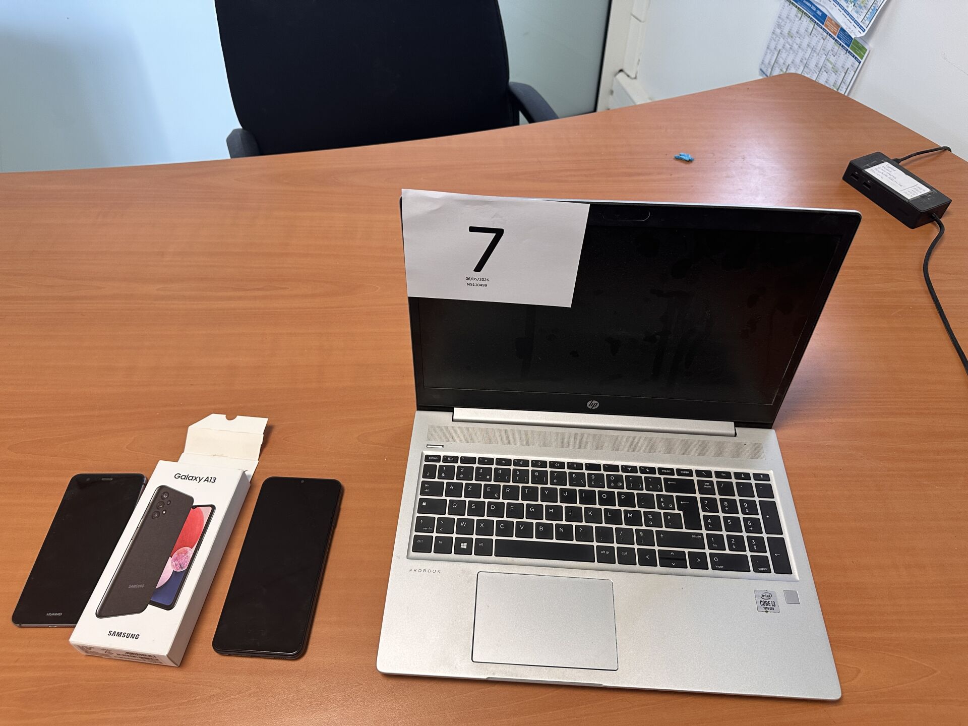 1 ordinateur portable HP Probook 450 G7 Core i3 10th gen - S/N : 5CD040B78M (sans chargeur) + 2 téléphones mobiles (1 SAMSUNG A13, sans chargeur, et 1 HUAWEI (modèle inconnu) sans chargeur Frais de mise à disposition 10 € TTC