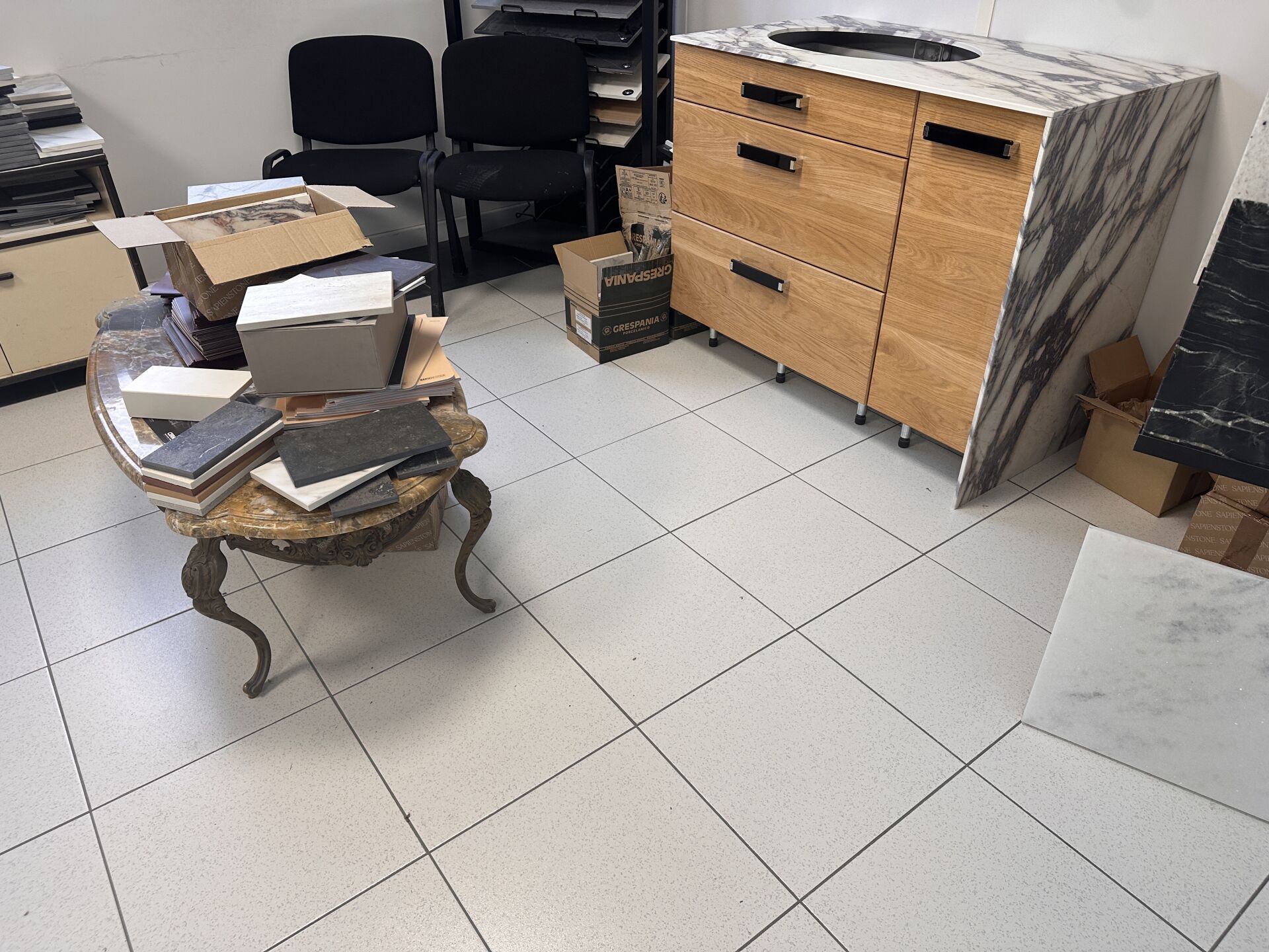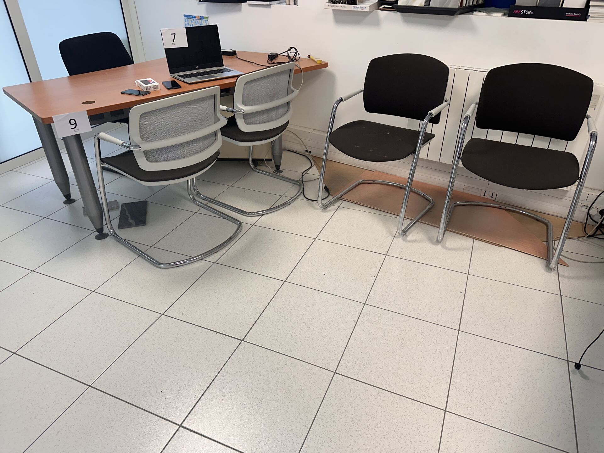 1 bureau mélaminé piétement métal, 180 x 110 cm 4 fauteuils plastique/métal/tissu, 1 fauteuil tissu noir piétement métal, 1 caisson 3 tiroirs mélaminé beige, 1 bureau marbre (1,8 x 0,8m), 2 fauteuils plastique/métal/tissu, 1 fauteuil tournant/roulant, 1 caisson 3 tiroirs 1 desserte 2 portes mélaminé beige, 2 chaises tissu noir, 1 meuble de salle de bains avec tiroir mélaminé bois, plan vasque en marbre 1 table basse plateau marbre, piètement métal doré Frais de mise à disposition 10 € TTC