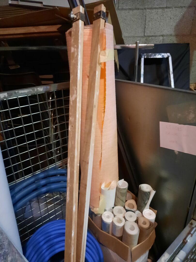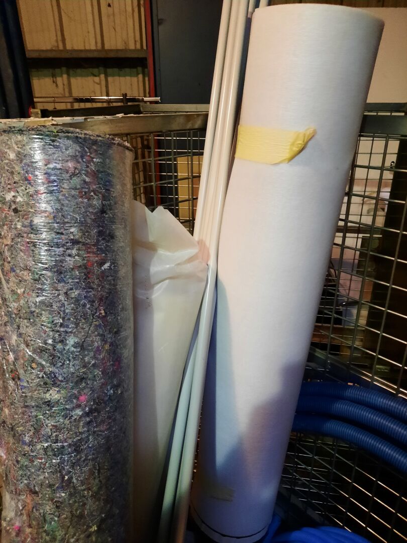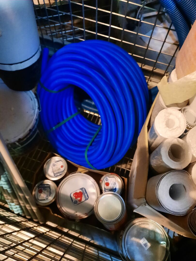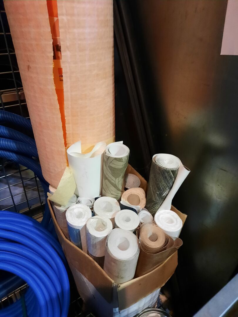 Stock de pots de peinture entamés, de rouleaux PVC, de sous-couche revêtement de sol, de gaines électriques, de tubes IRO, papiers peints, natte d'étanchéité, 2 fausses équerres