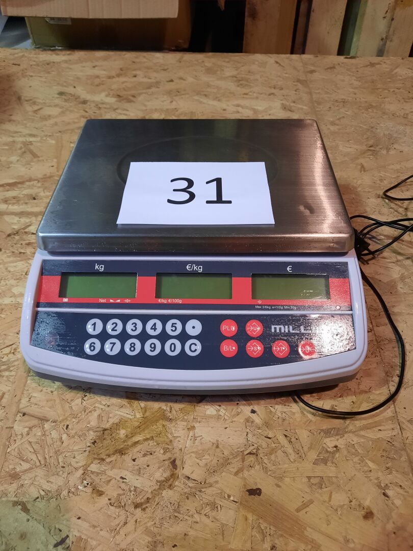 Balance poids/prix MILLIOT modèle OTP-6 (poids maximum 3/6 Kg, poids minimum 20g, marge d'erreur 1/2g), affichage client NS : 107019036005 On joint : Caisse en métal laqué noir